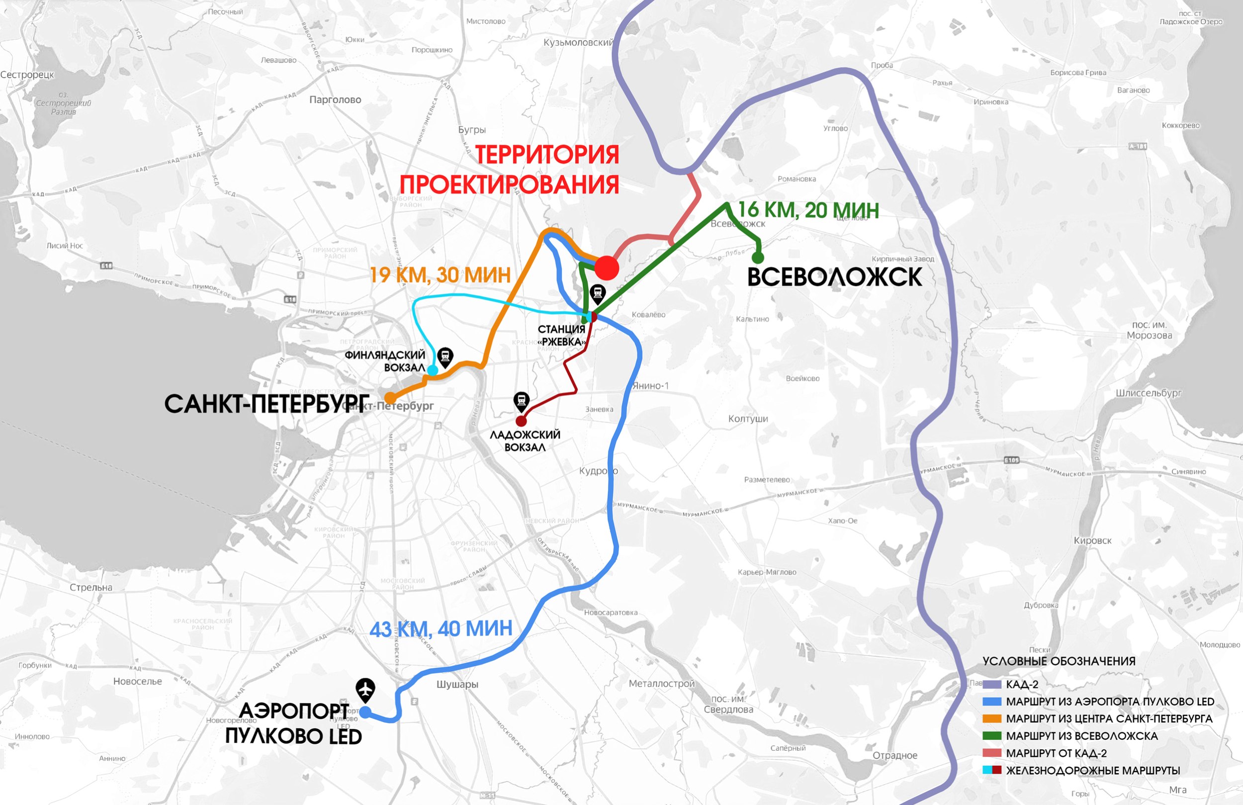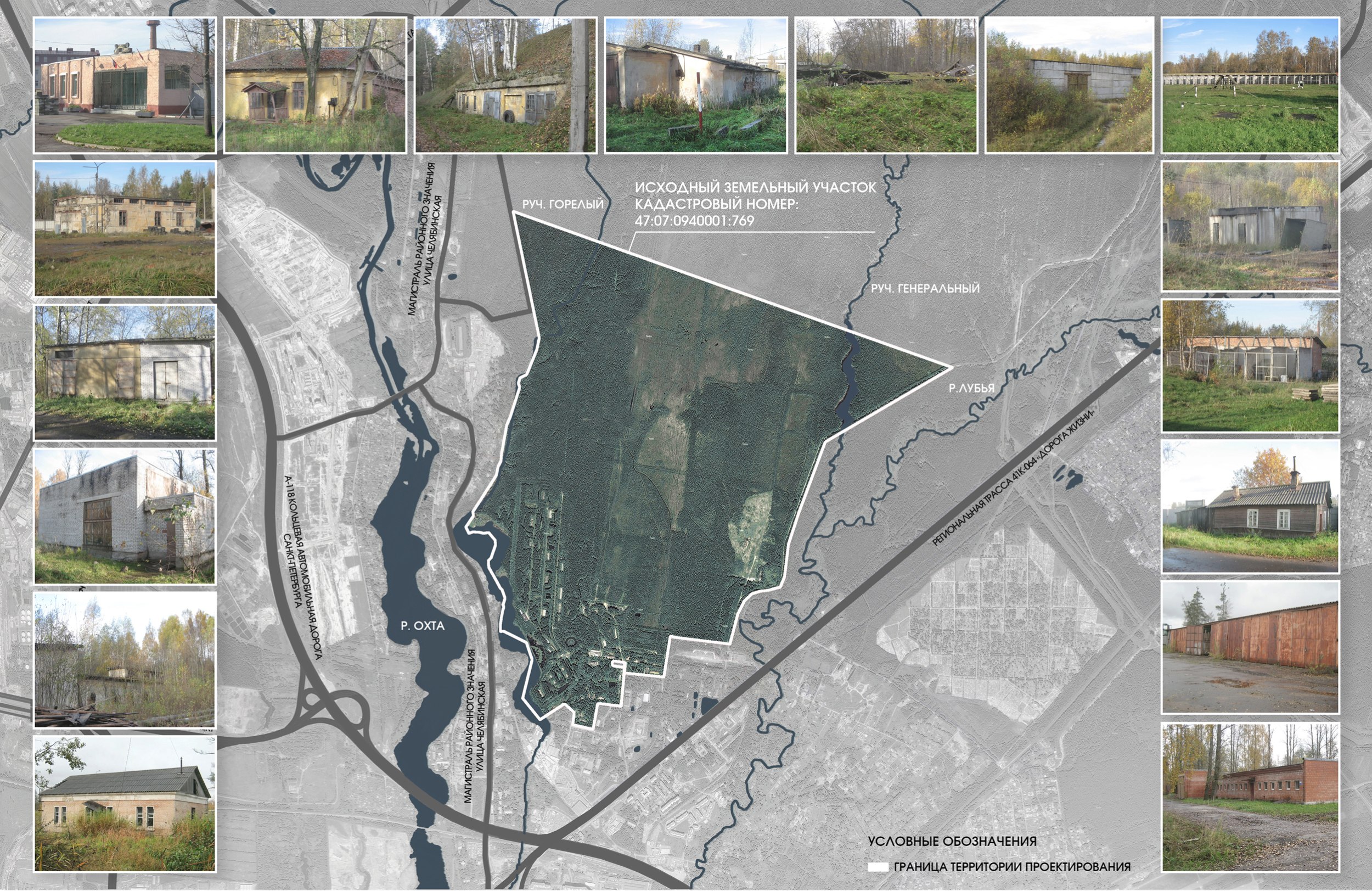 Территория проектирования расположена к востоку от Санкт-Петербурга, вблизи административной границы города и Ленинградской области, на землях, ранее относившихся к Научно-испытательному морскому артиллерийскому полигону Ржевка.Часть исходного земельного участка отнесена к зоне объектов культурного наследия и в перспективе рассматривается как рекреационно-музейная территория.