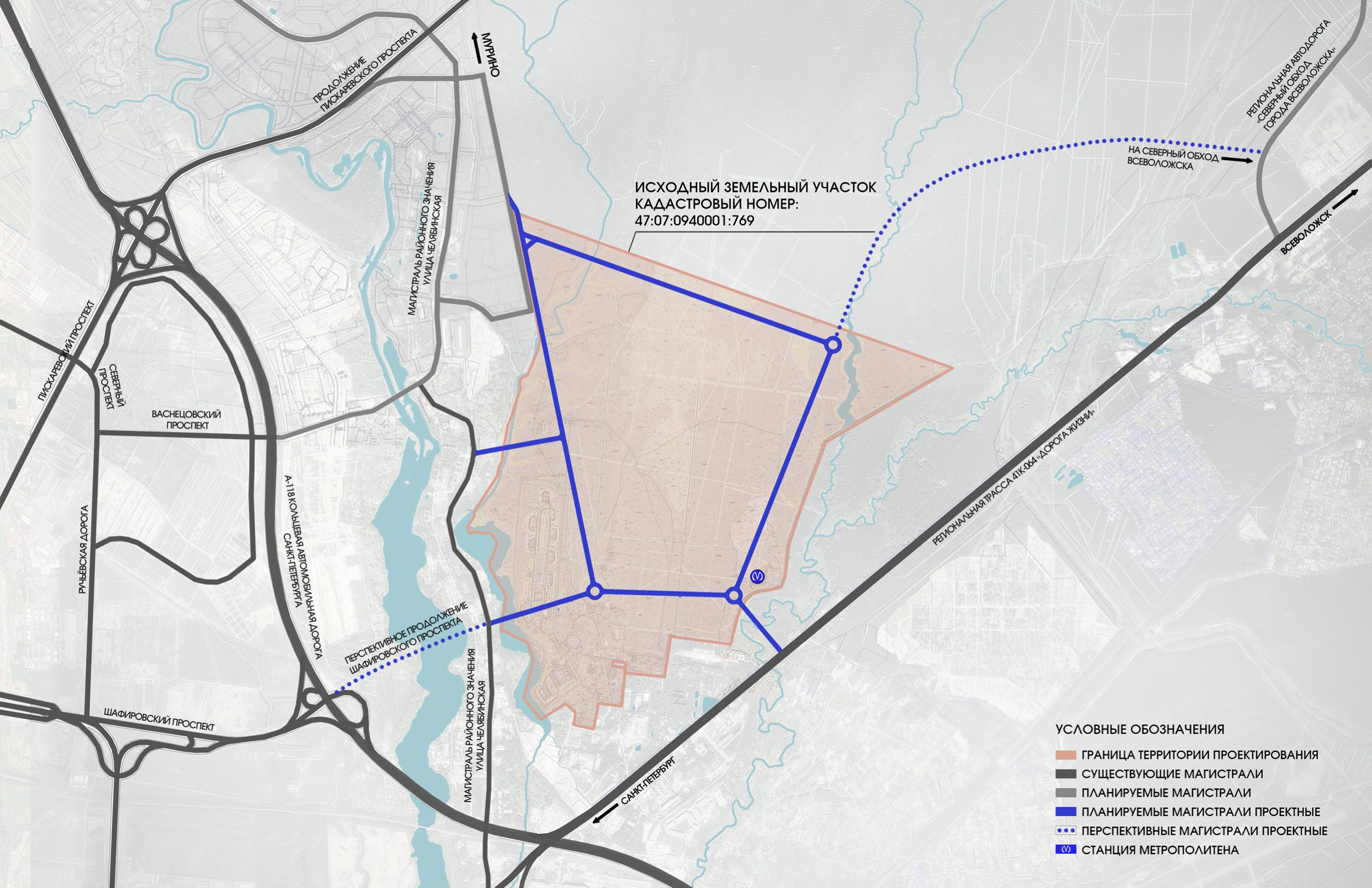 - с улично-дорожной сетью Мурино с выходом на строящуюся магистраль «Продолжение Пискаревского проспекта»;