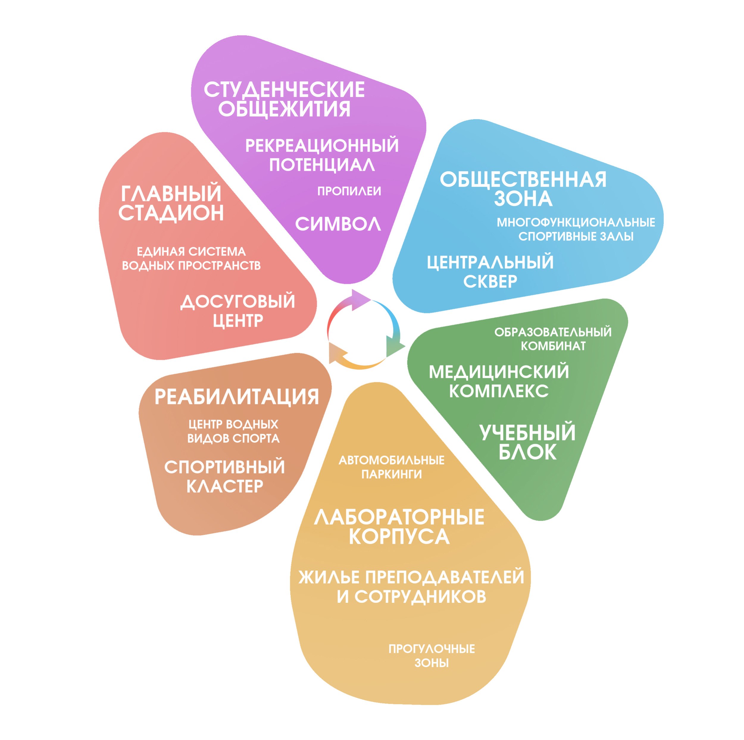 Учебная зона состоит из шести секторов (по числу факультетов), рассчитанных на 3000-5000 студентов каждый. Сектора разделены аллеями-лучами и объединены внешней пешеходной улицей.