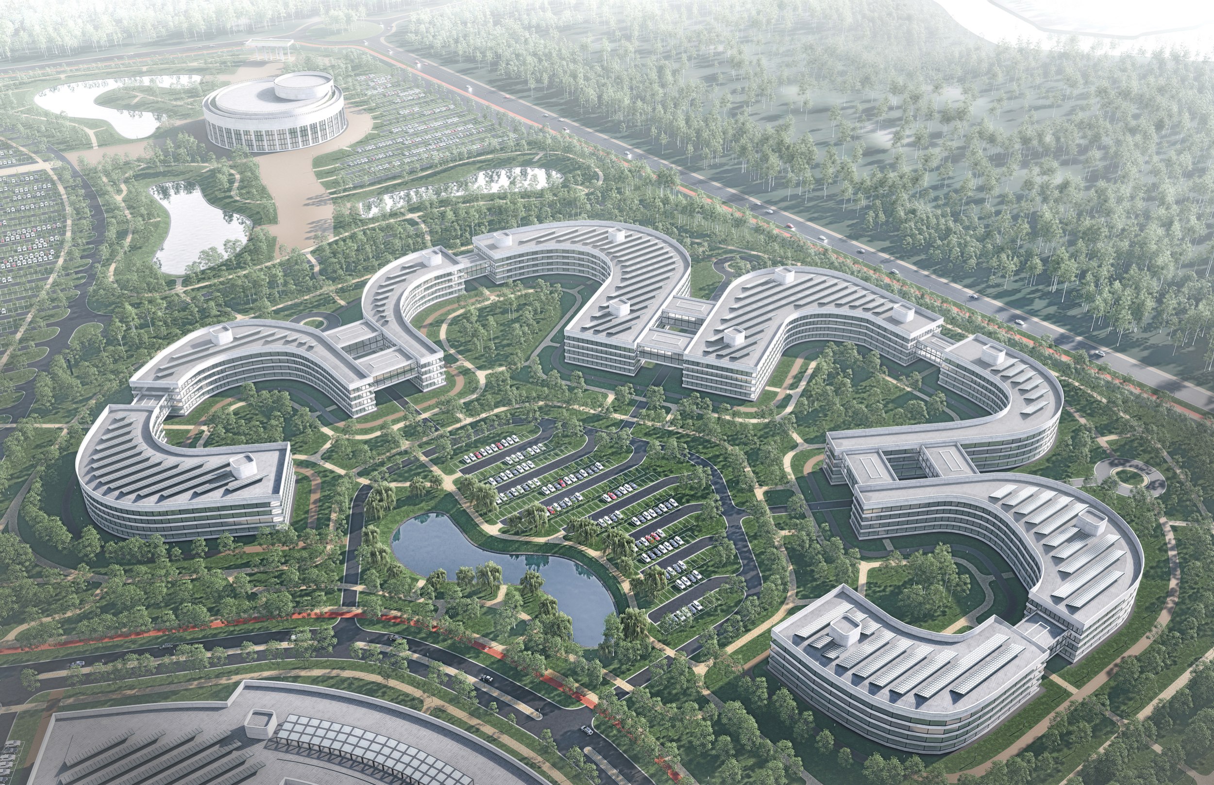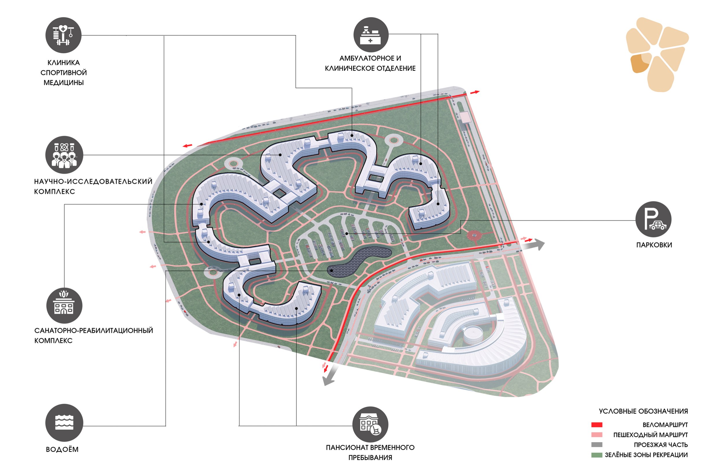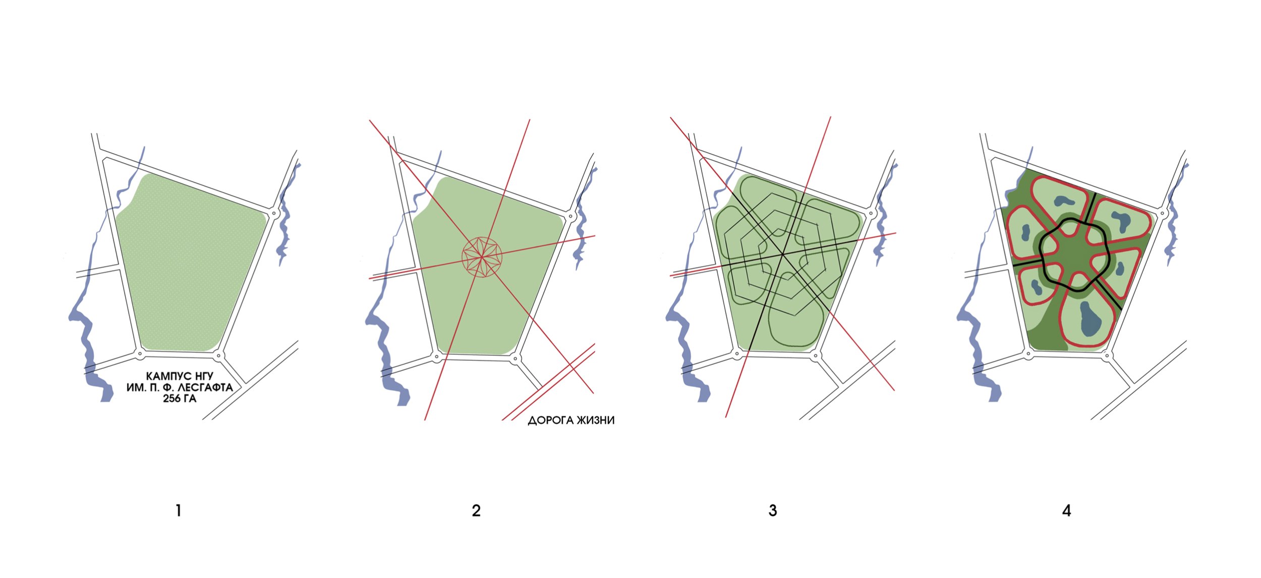 Художественный образ концепции был подсказан самой территорией: «Дорога жизни» и мемориал «Цветок жизни» стали ее смысловой и структурной основой. От планировочного центра участка проложены оси, согласованные с основными направлениями и ограничениями. Эти оси формируют функциональные зоны, составляющие структуру кампуса.