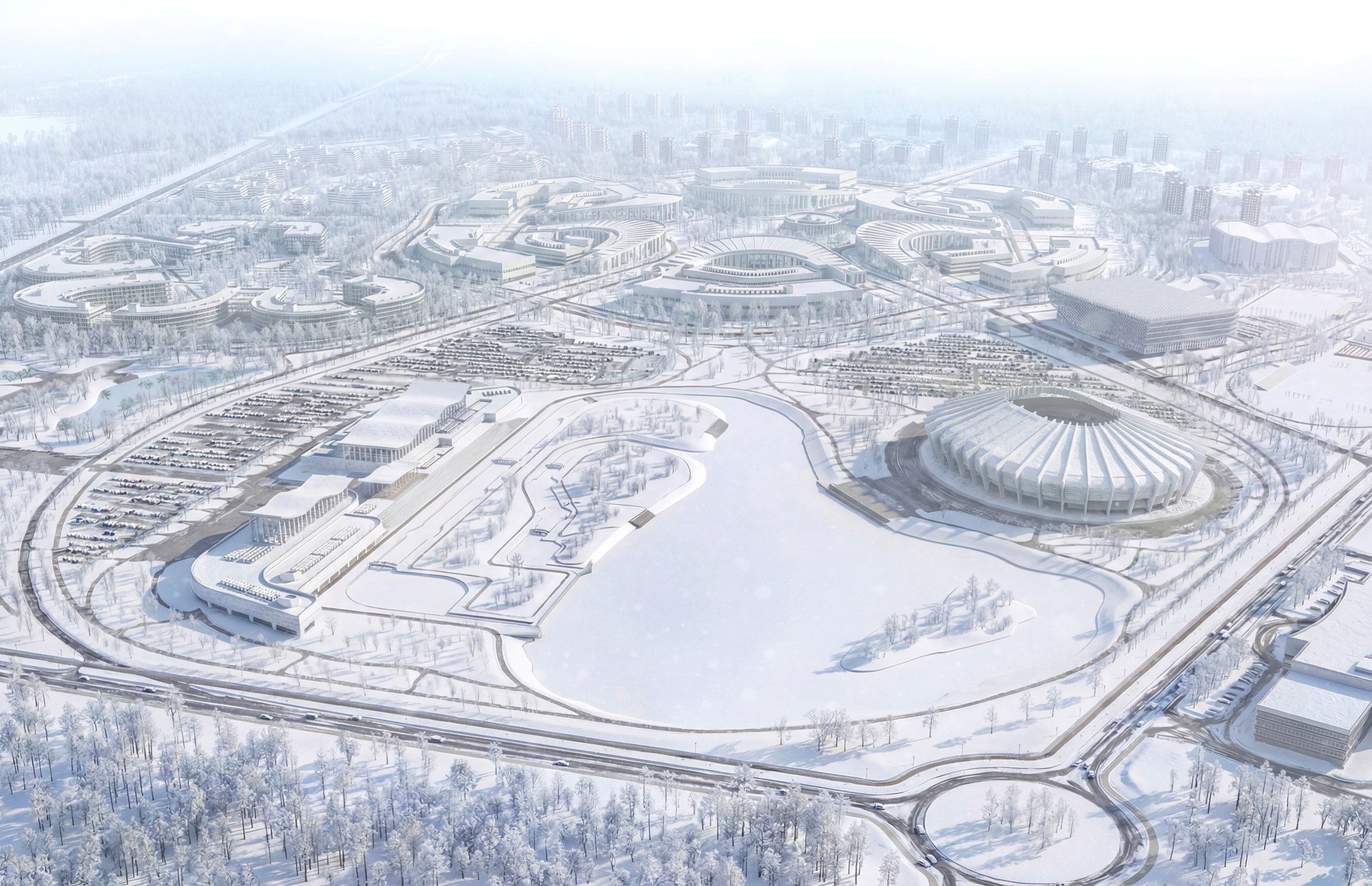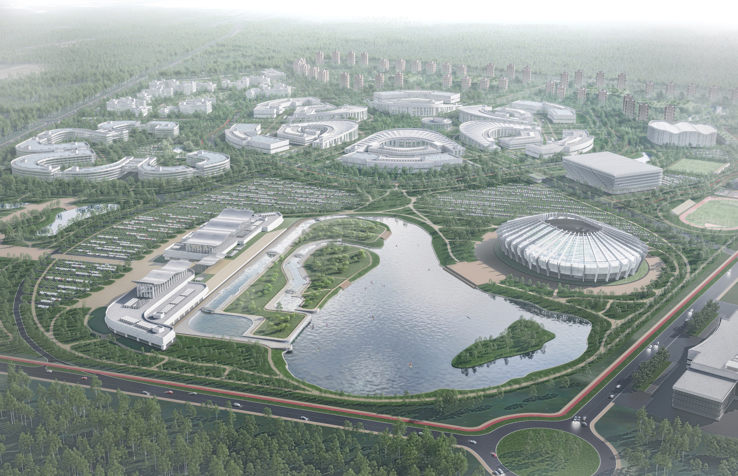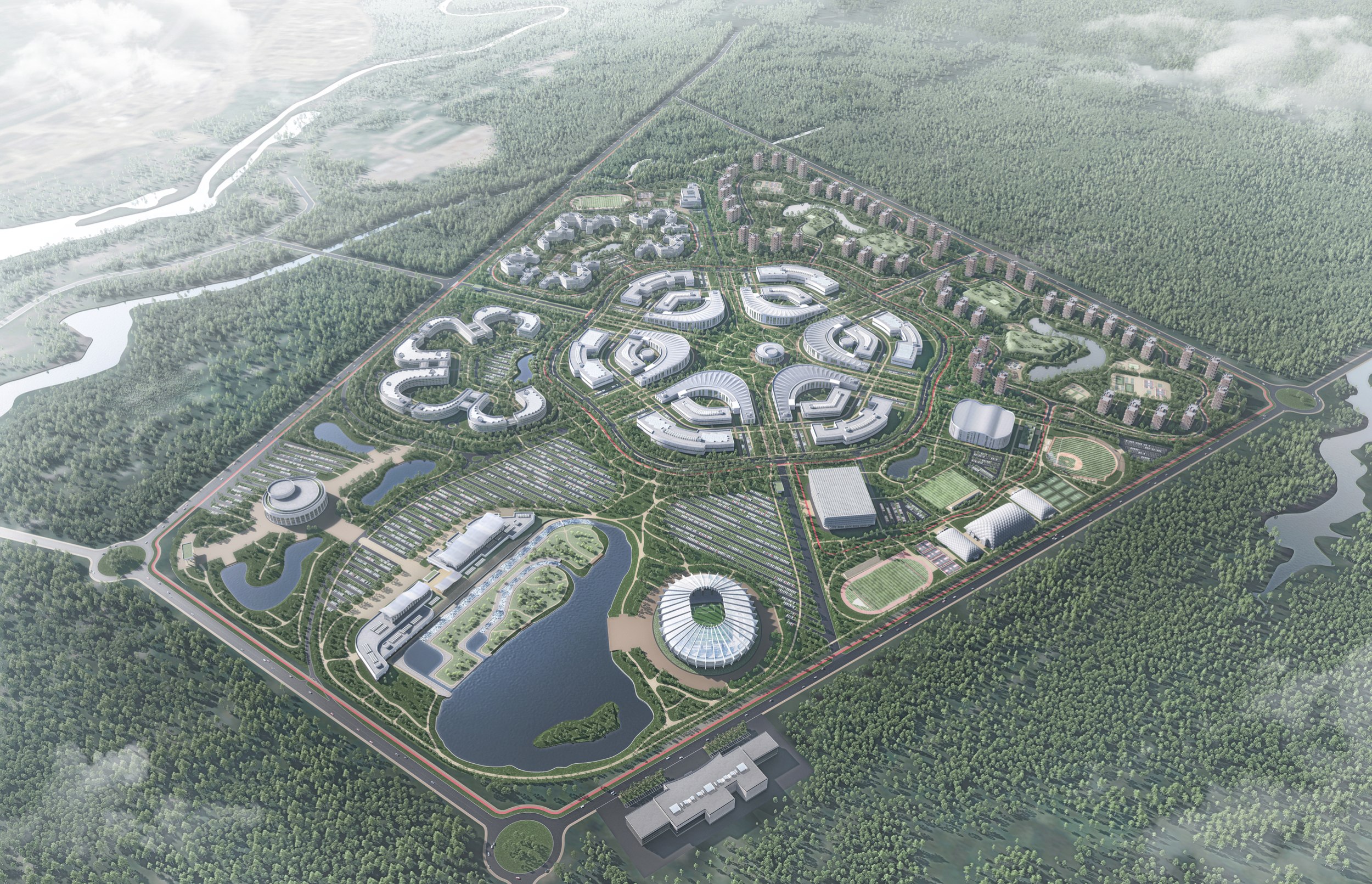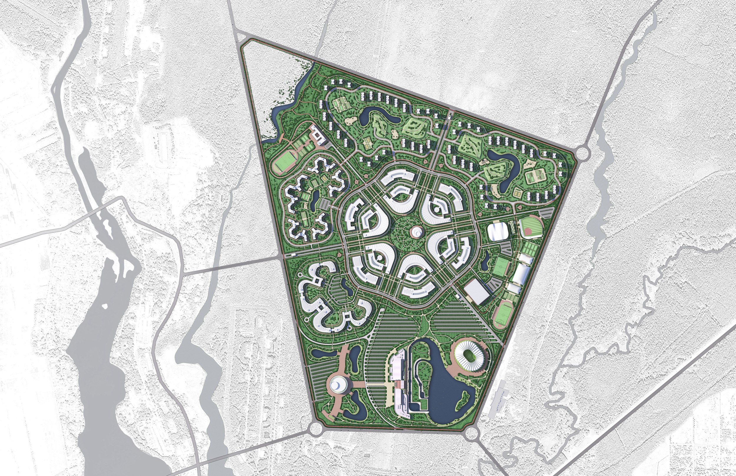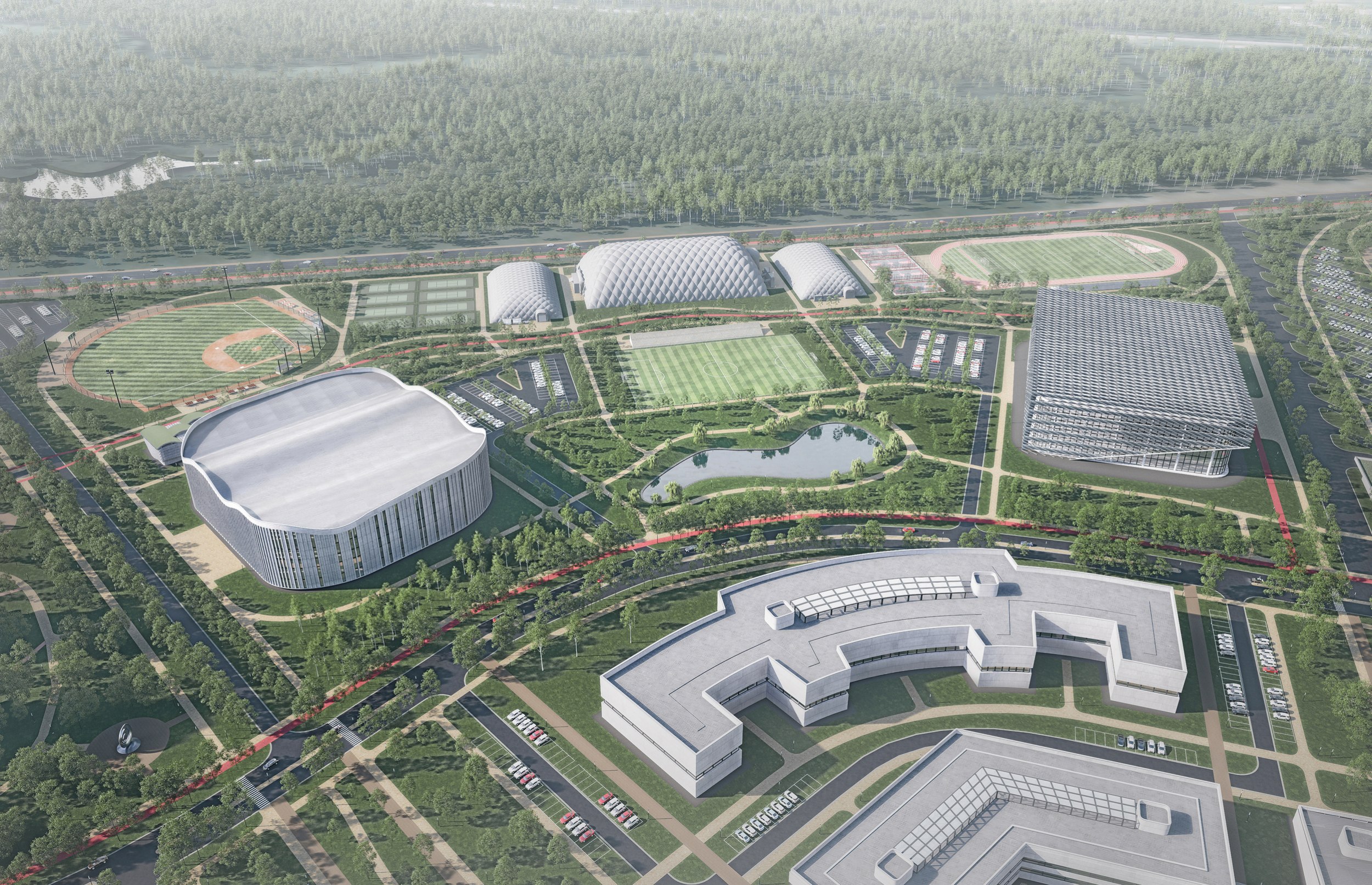 Отдельно выделена спортивно-тренировочная зона с полным набором объектов: футбольные поля, легкоатлетические арены, ледовая арена, теннисные корты, бейсбольное поле и стрелковый центр.