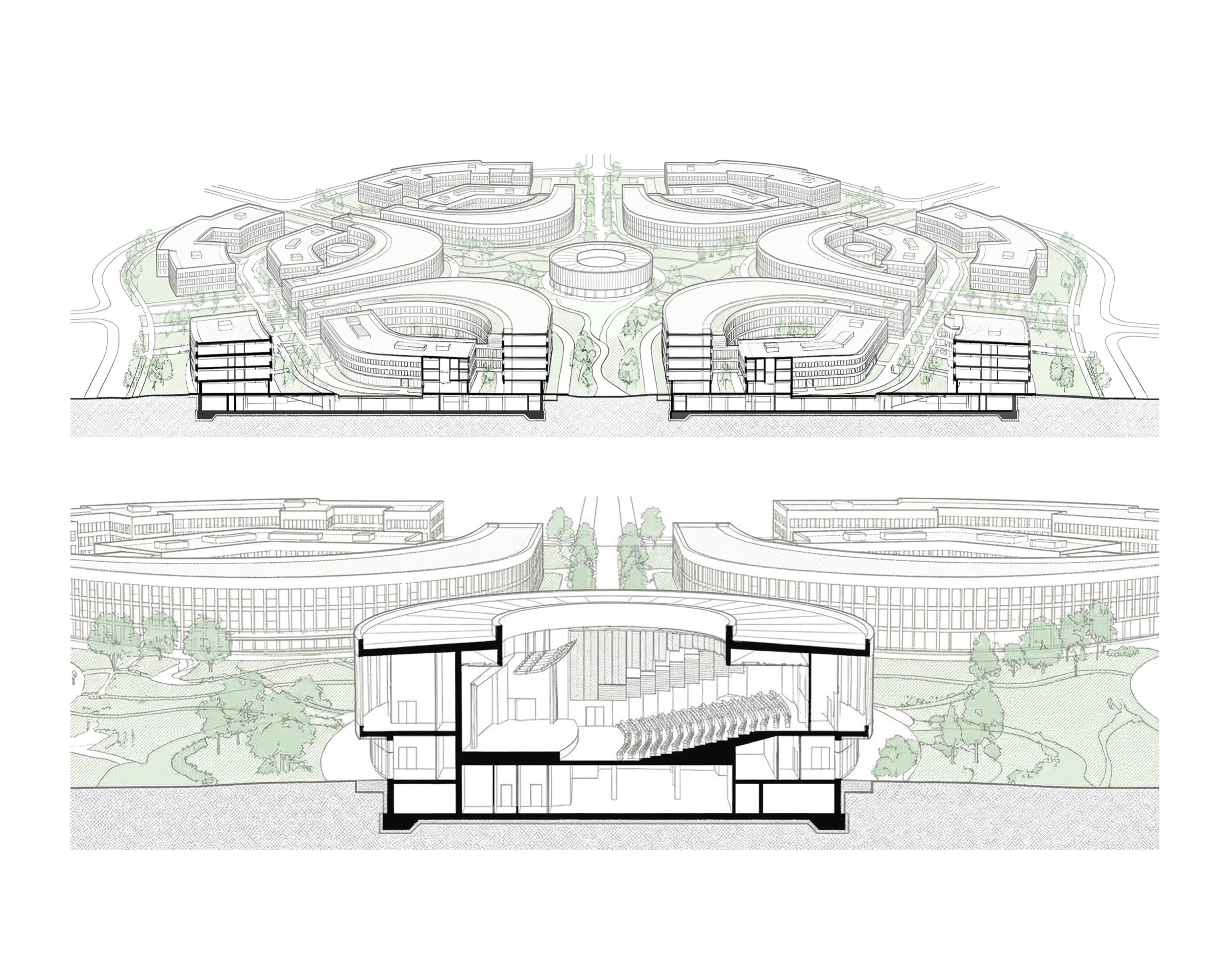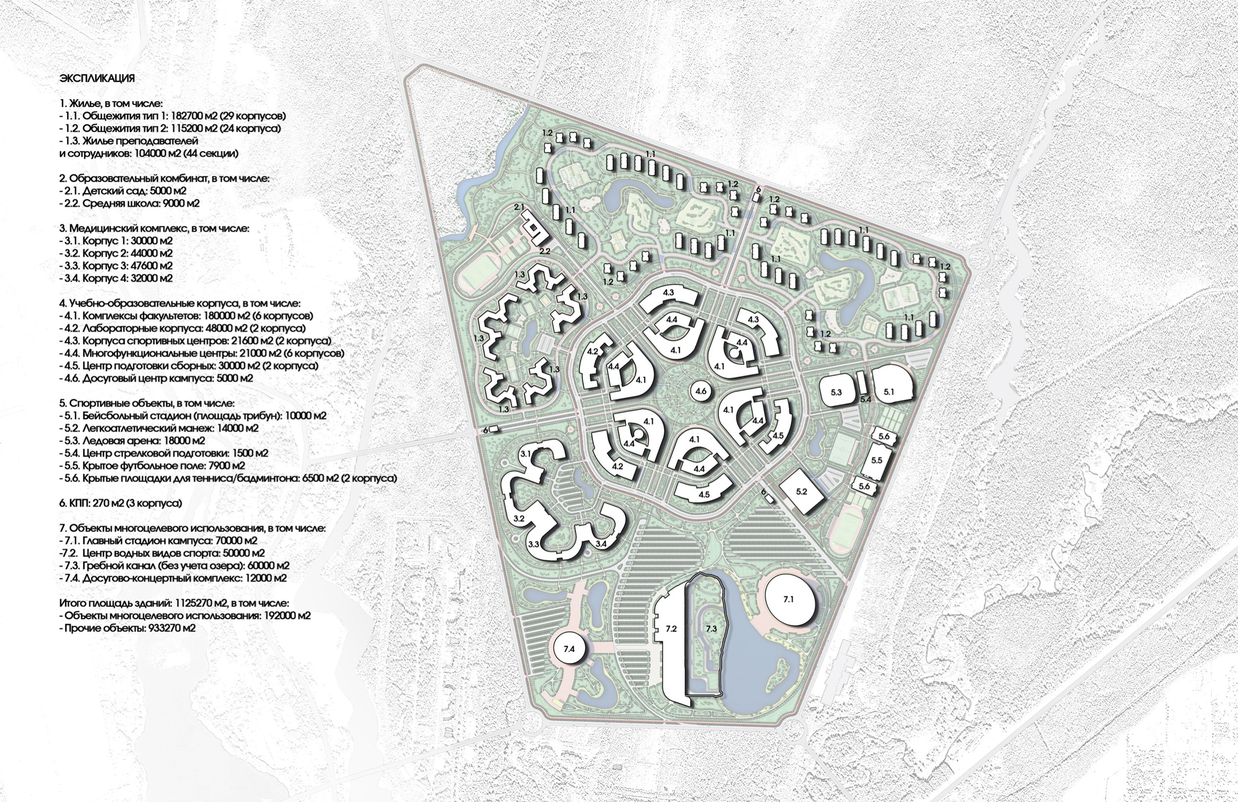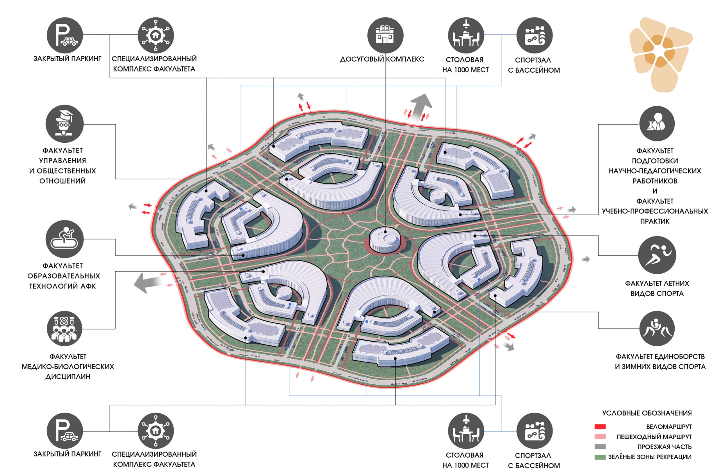 Планировочная организация кампуса основана на синтезе транспортно-планировочных осей и особенностей территории. Ключевая идея – вписать живописную, естественную по генезису композицию в четкую структурную рамку, подобно органичному соединению мышц и скелета – каркаса и его заполнения.