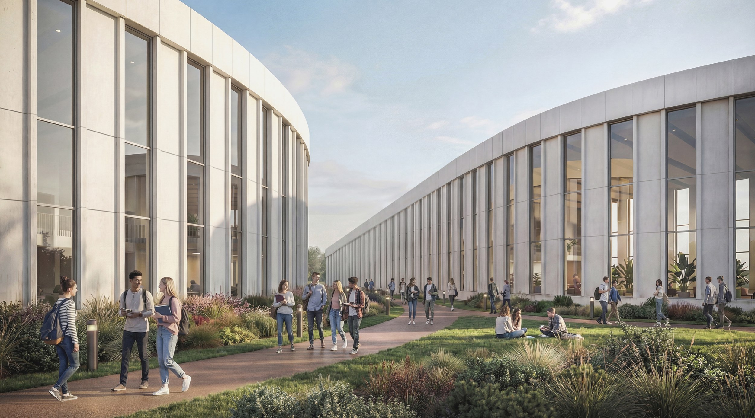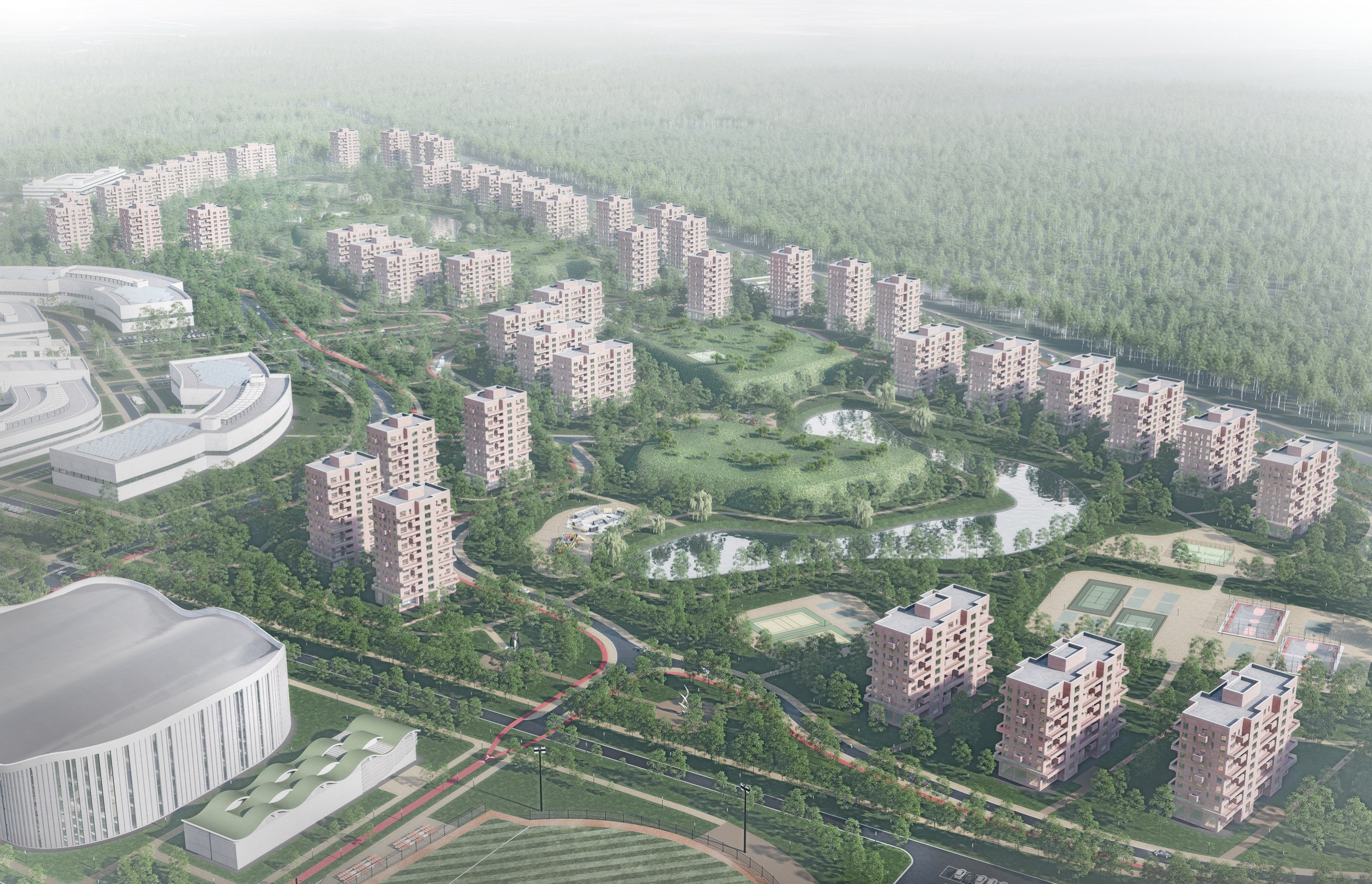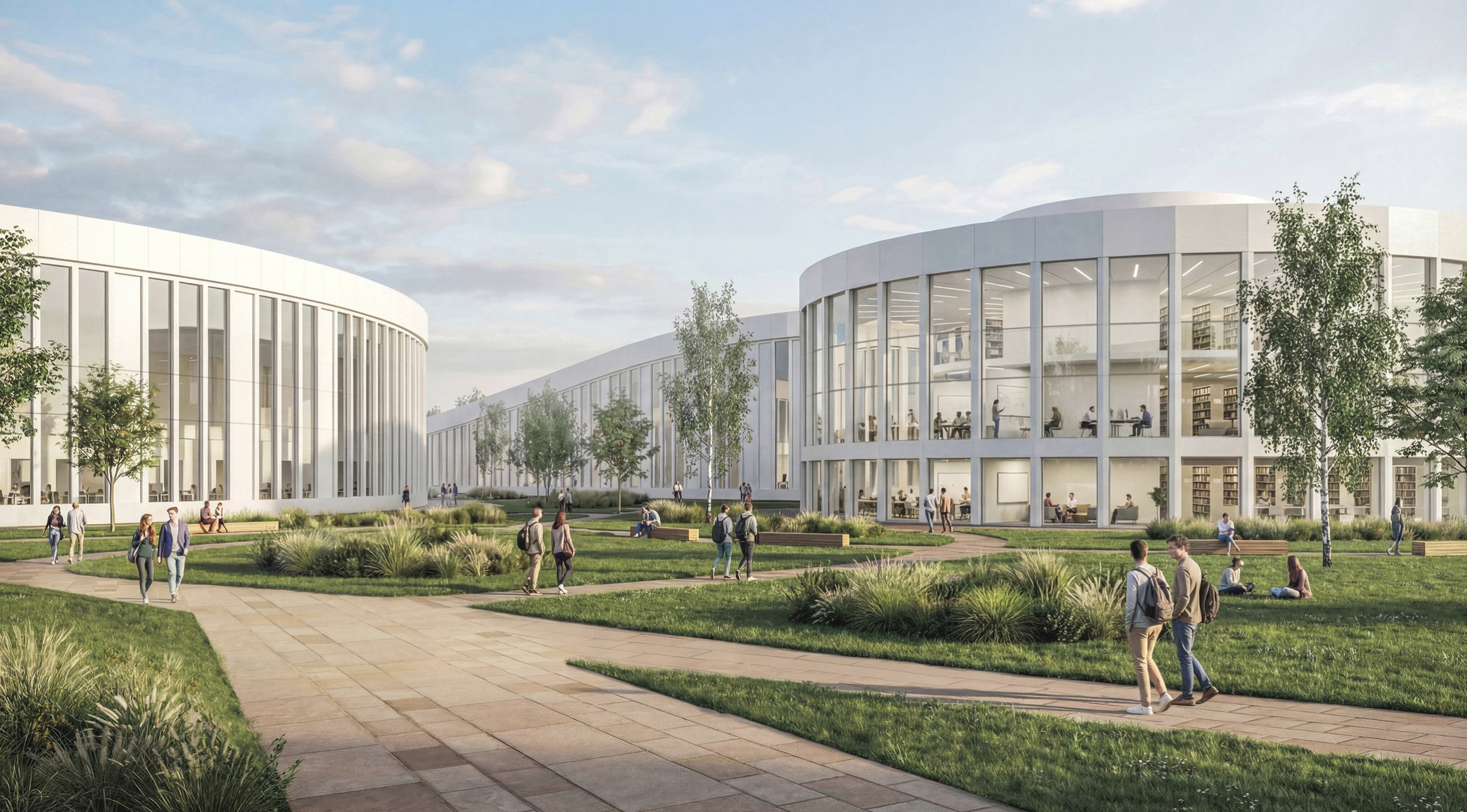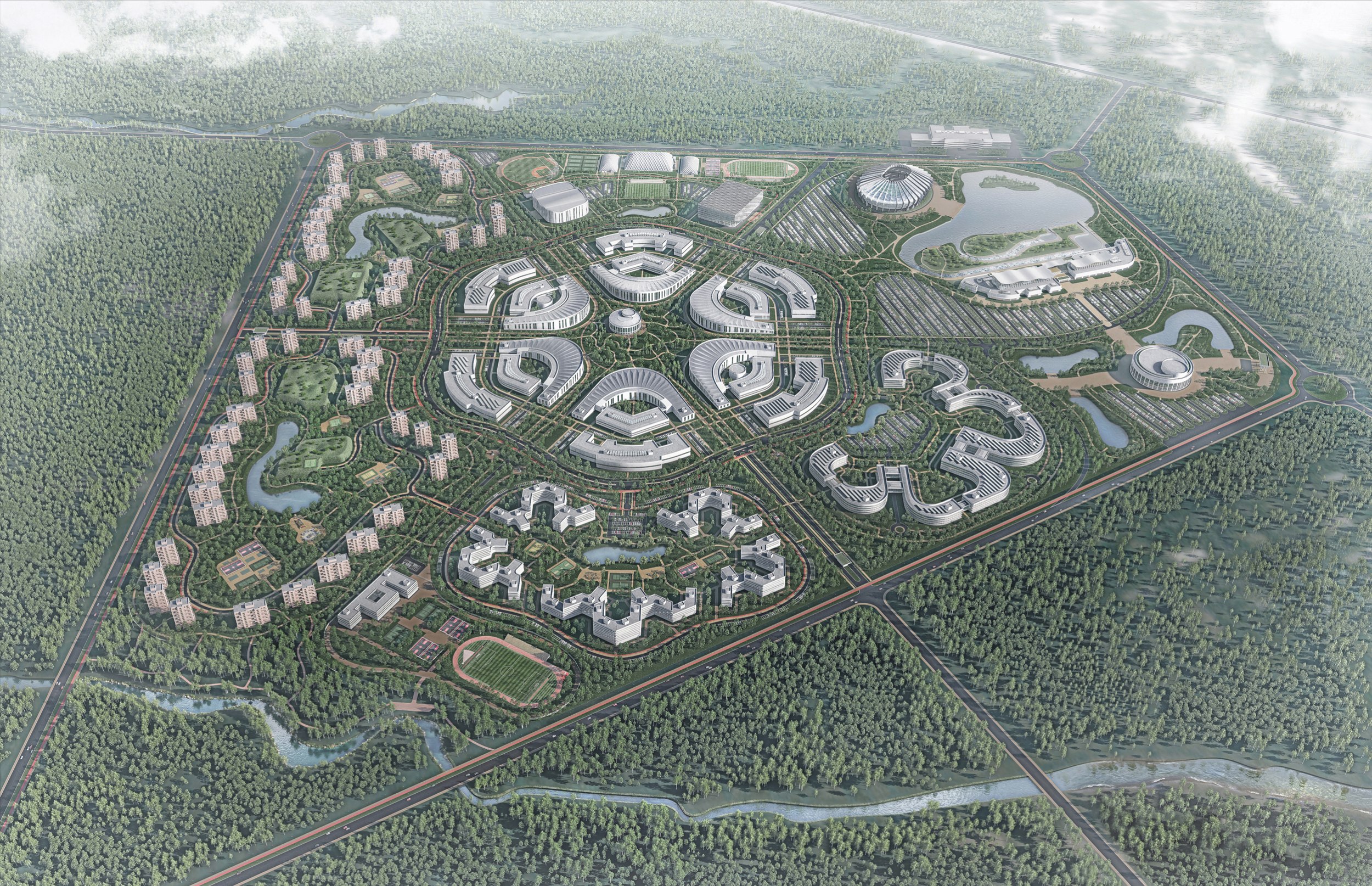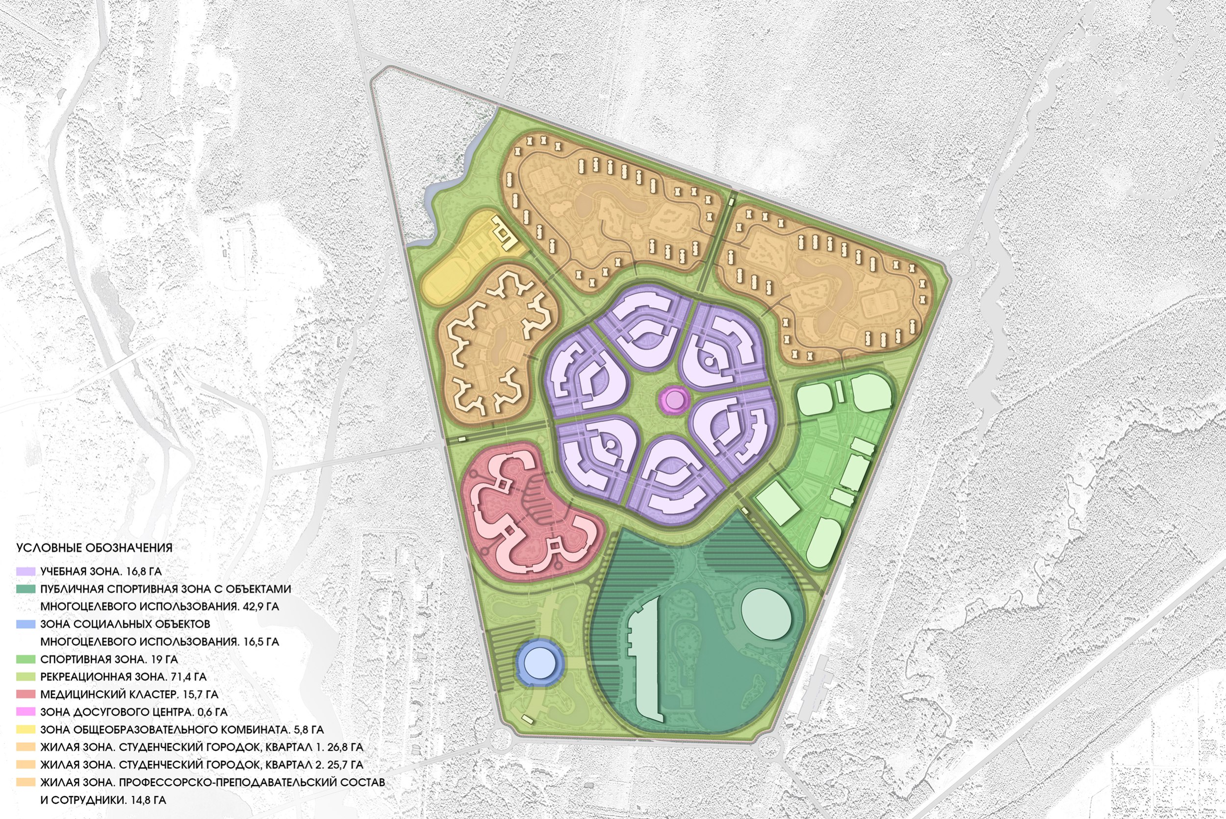 Жилые зоны рассчитаны на 10000-12500 студентов и около 3000 преподавателей и сотрудников. Общая площадь – 70 га. Студенческие общежития размещены в северной части, жилье преподавателей – в отдельном квартале. Застройка дифференцирована по типологии и сценариям проживания.