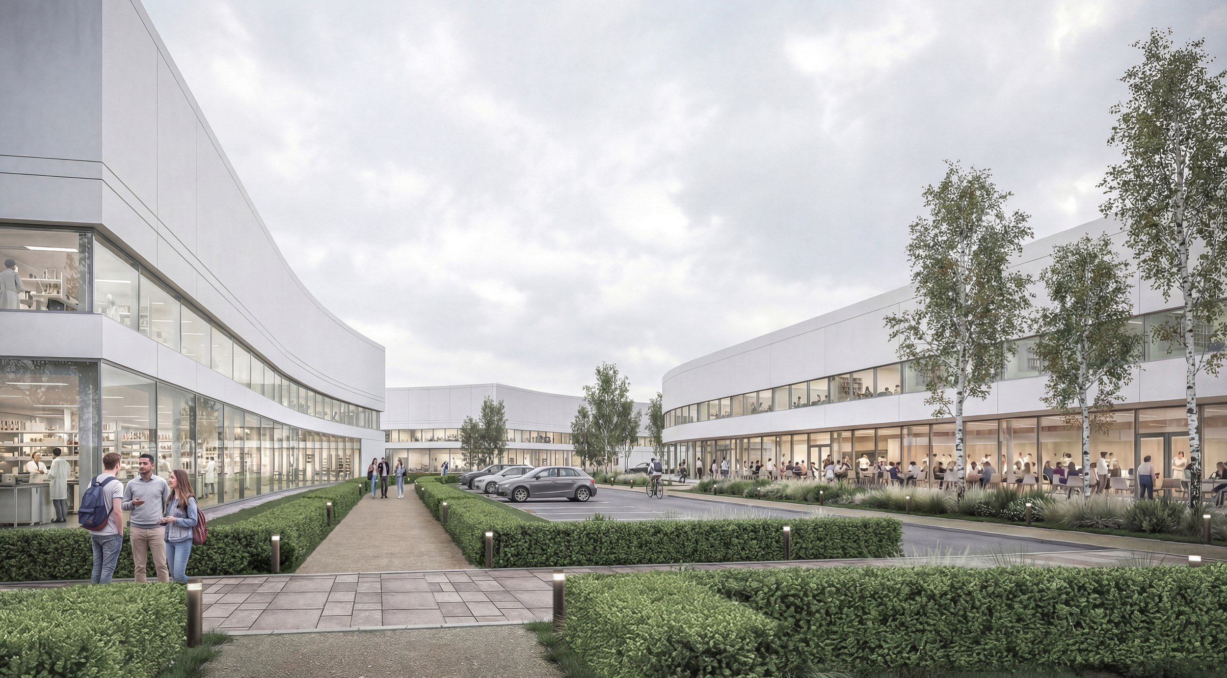 Система внешних магистралей формирует трапециевидный периметр и состоит из четырехполосных улиц. В границах красных линий предусмотрены зеленые буферы, велодорожки и тротуары, что снижает шумовое и экологическое воздействие на внутреннюю среду кампуса.