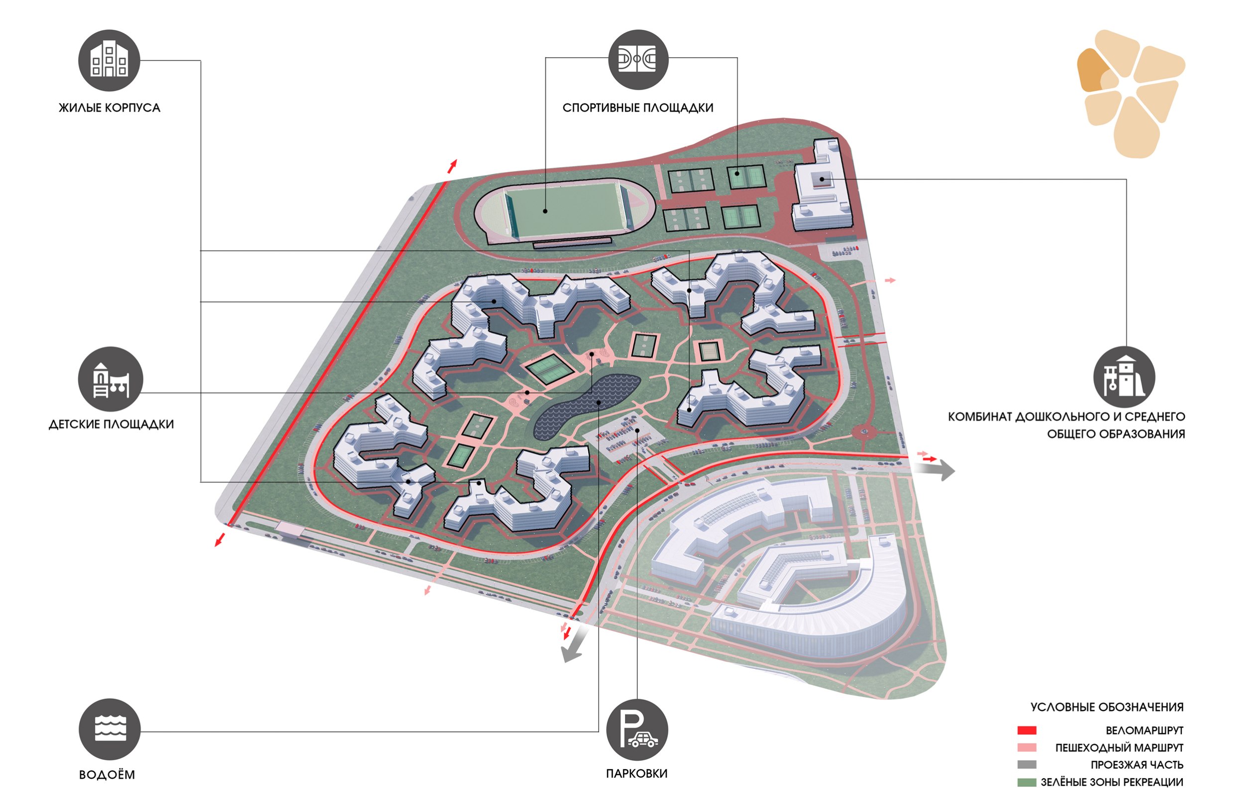 Публичный ландшафт включает буферные лесонасаждения, аллеи, центральный сквер и линейный парк. Приватные зоны – внутренние дворы и спортивные территории – обеспечивают уединение и безопасность.