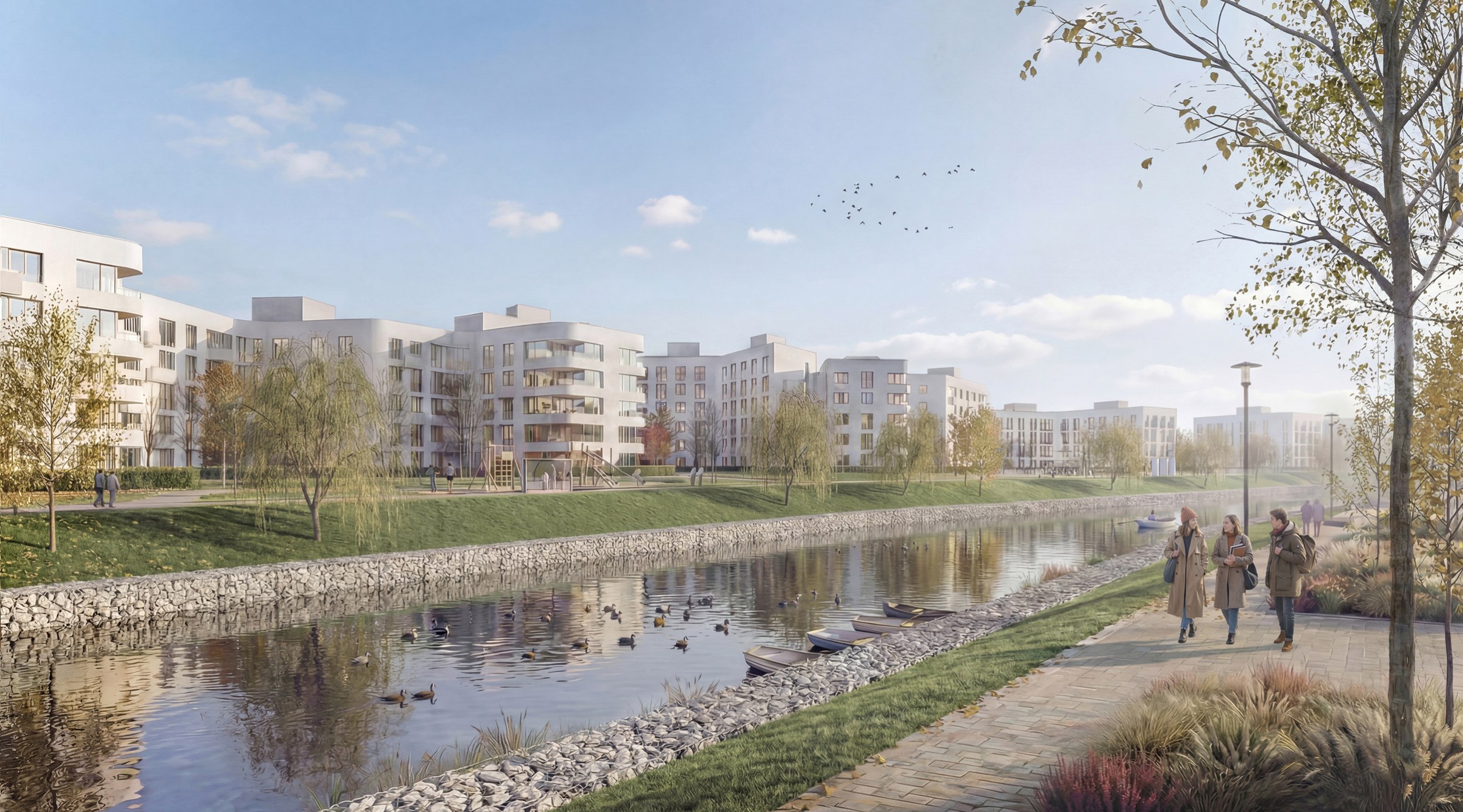 Особое внимание уделено формированию прибрежных биоценозов вокруг системы прудов. Озеленение выполняет не только эстетическую, но и экологическую функцию: укрепляет берега, фильтрует стоки и формирует среду обитания для фауны.