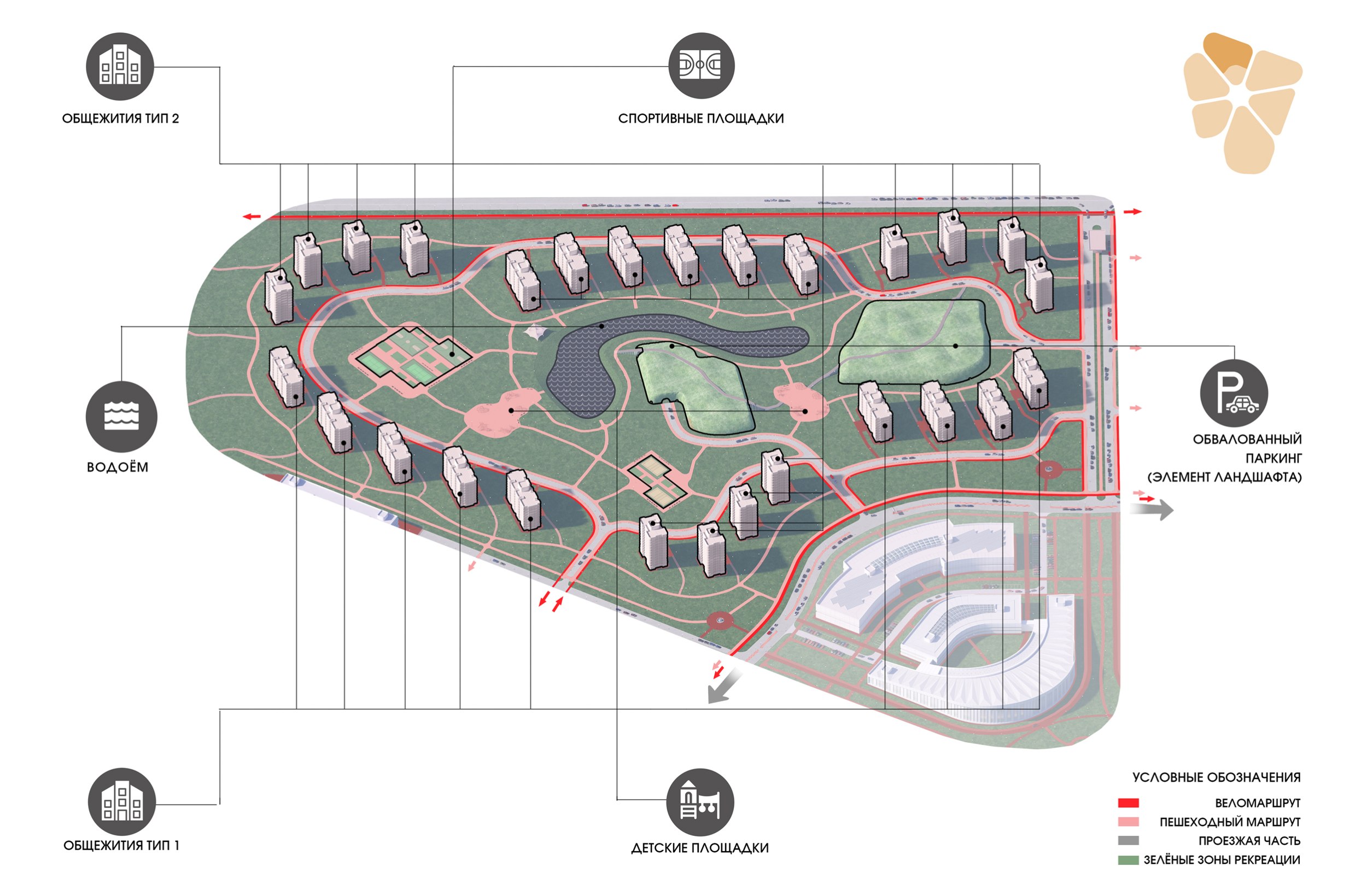 Внутренняя транспортная схема представляет собой многоуровневую иерархическую систему, обеспечивающую эффективное и безопасное перемещение. Она основана на четком функциональном зонировании, разделении транзитных и внутренних потоков и приоритете пешеходной связанности и экологии.