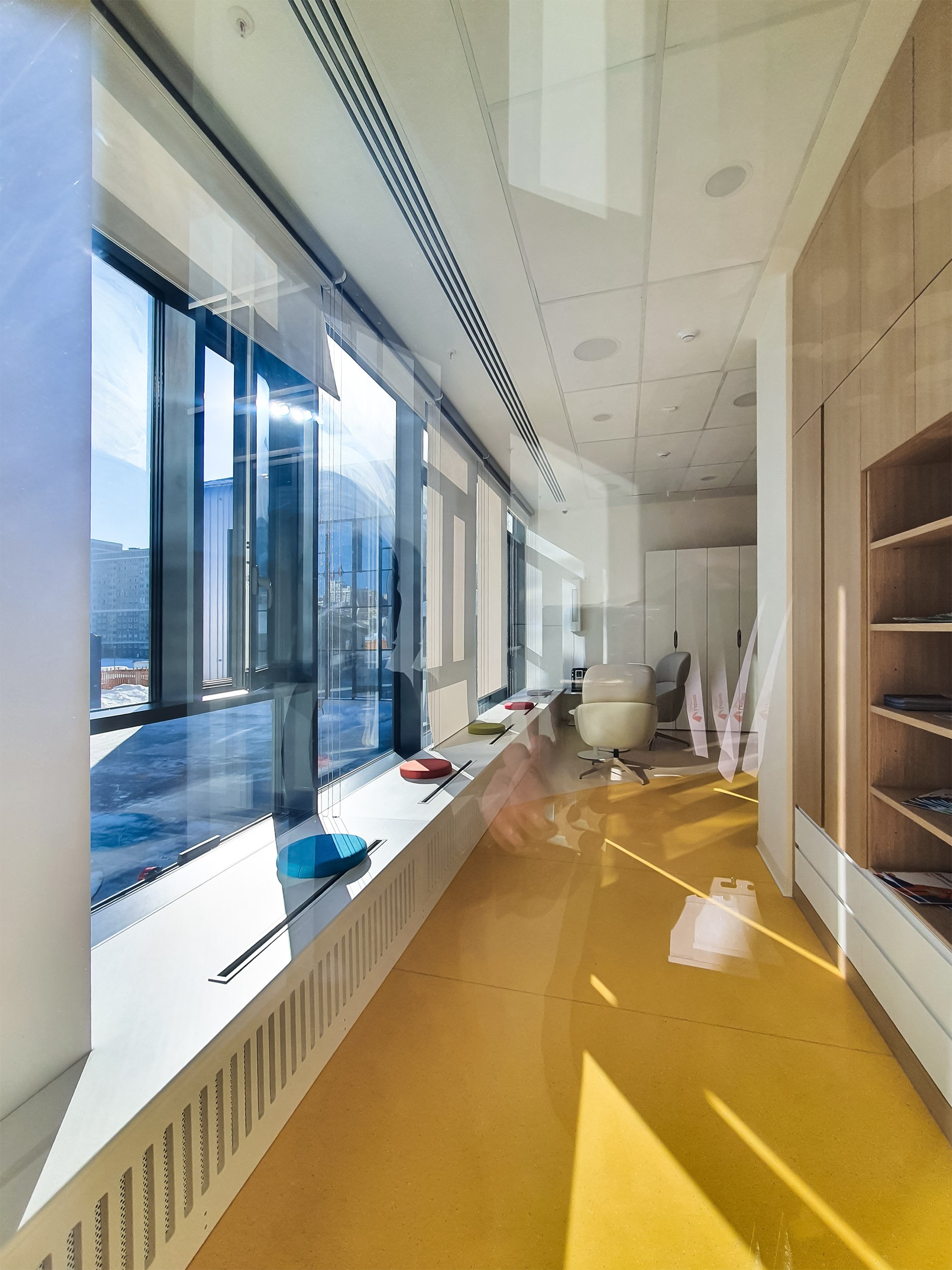 Местами, на 2 и 3 этажах, широкий коридор-галерея со стеклянной стеной, обращенной к «Ломоносову», похож на галерею Дома Наркомфина. Сходство особенно усиливают деревянные рамки горизонтальных окон на белых стенах.