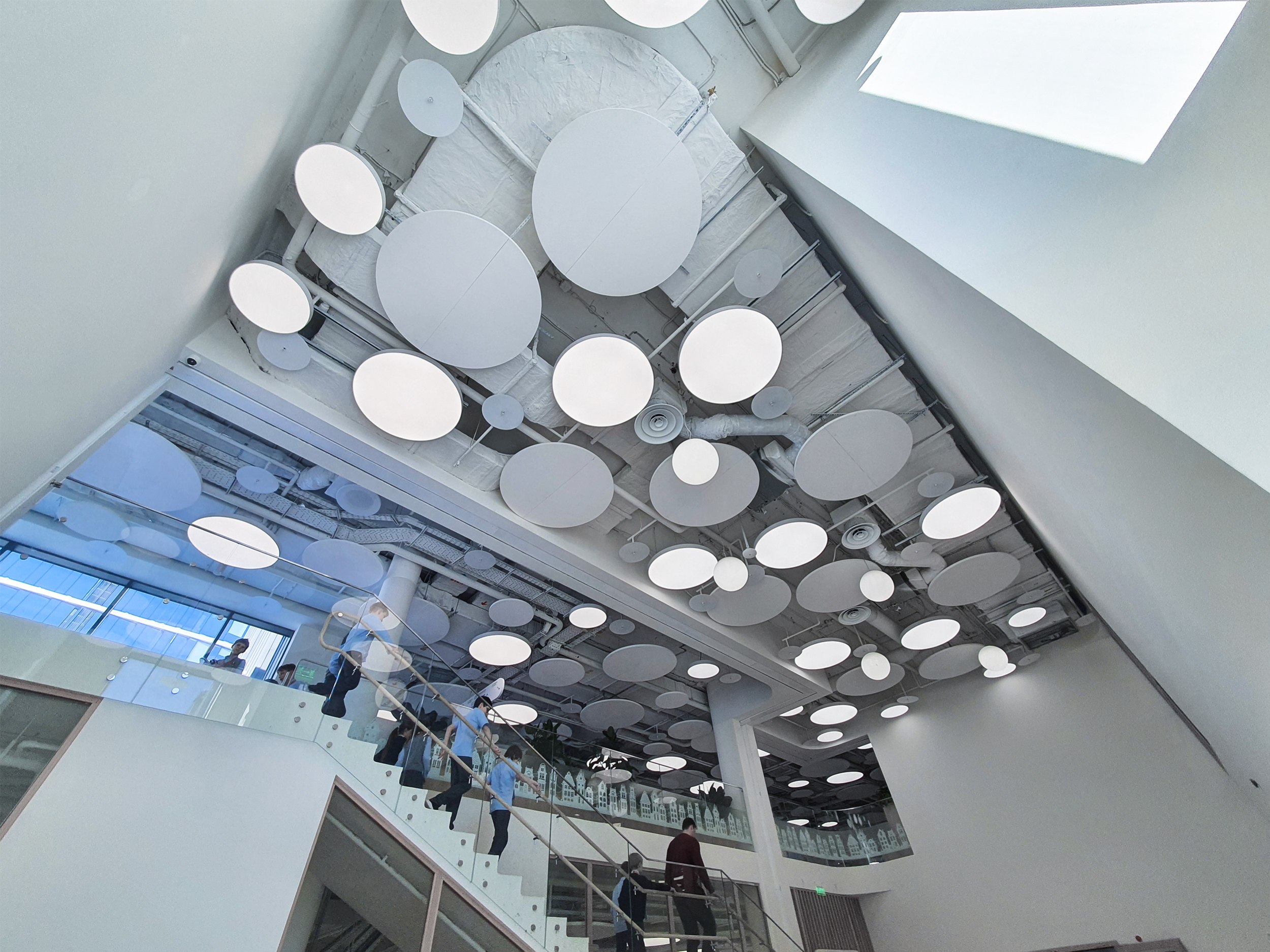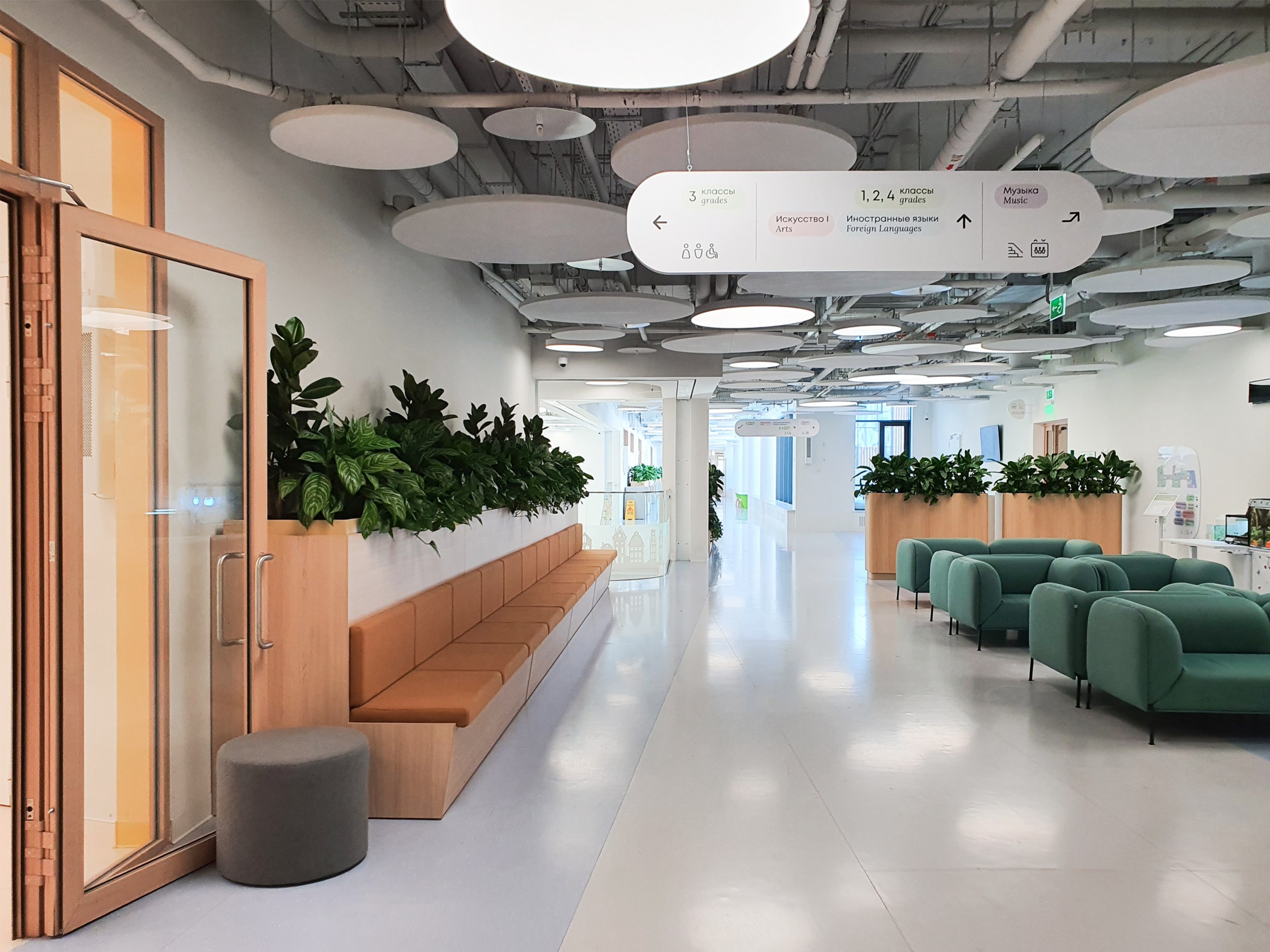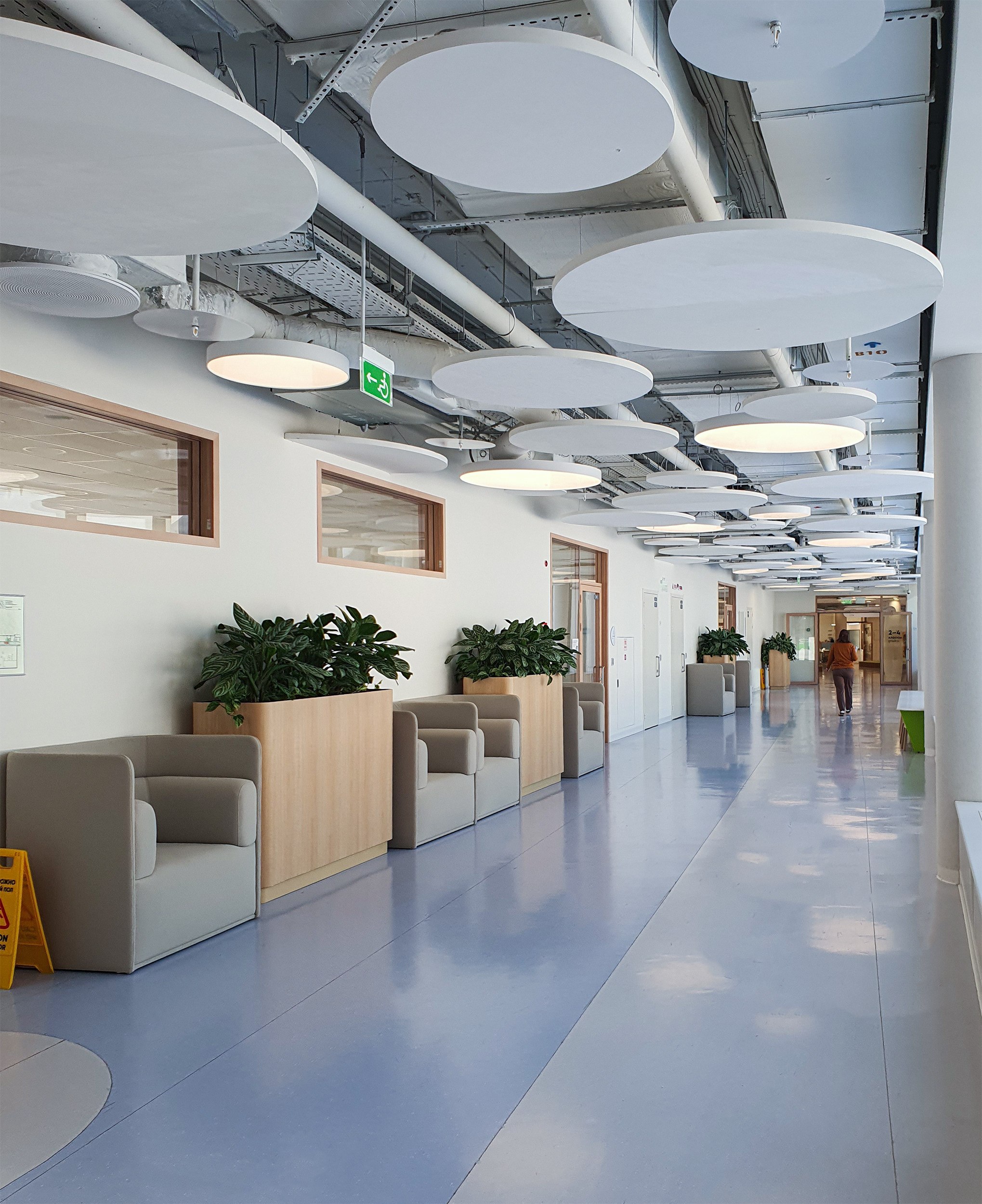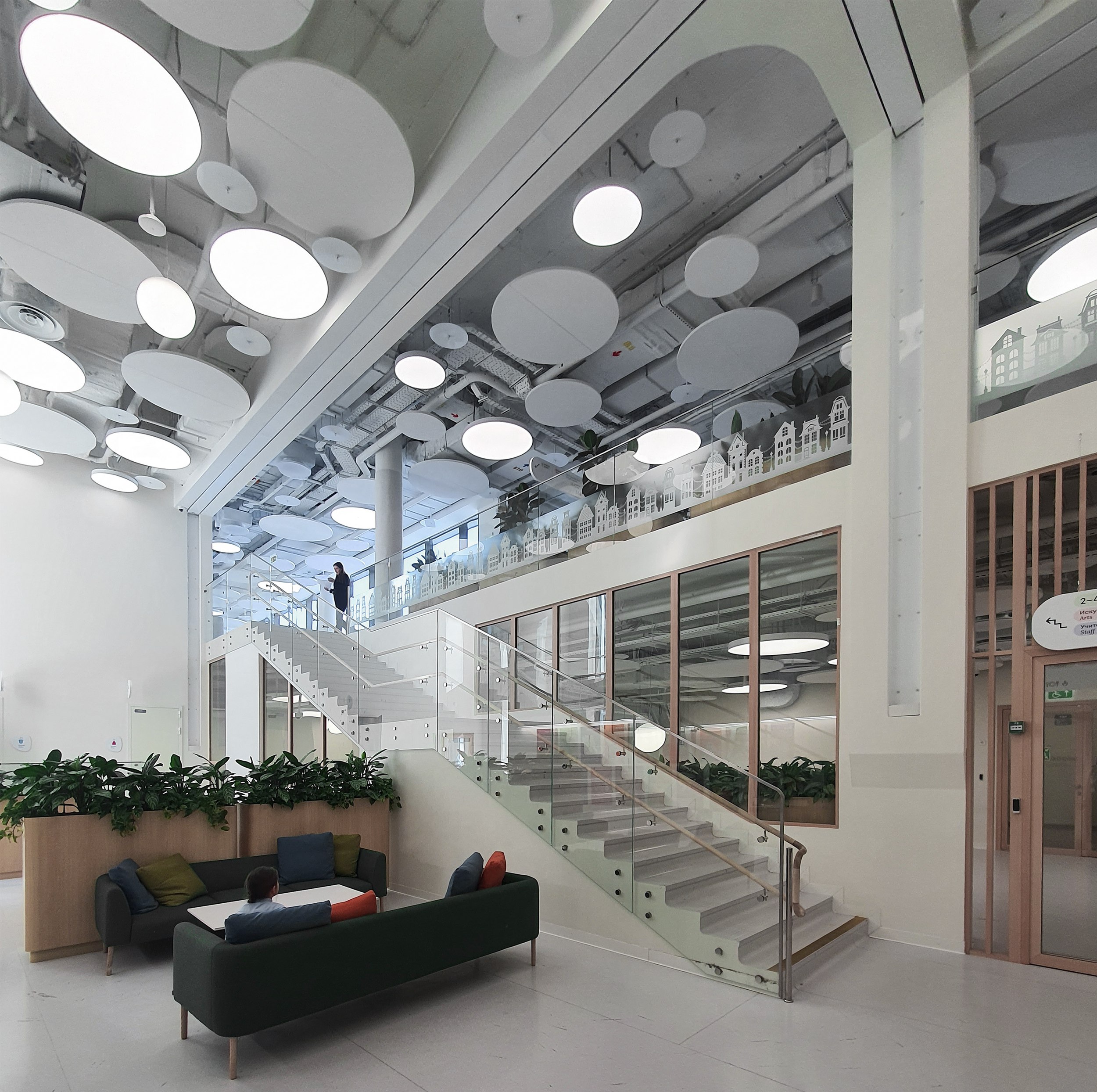 «Зайчики» из зенитных окон перекликаются с круглыми и кольцевидными светильниками на нижних этажах. Светильники, в свою очередь, вписываются в компанию панелей, закрывающих инженерные конструкции потолков, вентиляцию и прочее, но не целиком, а расступаясь и приоткрывая «начинку». Что, вероятно, будет будить воображение школьников, особенно младшеклассников. Полуоткрытые конструкции потолка присутствуют везде, это могут быть «деревянные» решетки, белые диски – их особенно много, они напоминают о звездном небе и планетах; в общественных пространствах средних классов потолки процентов на 80 закрыты белой поверхностью, но прорезаны своего рода «окнами», открывающими вид на коммуникации.