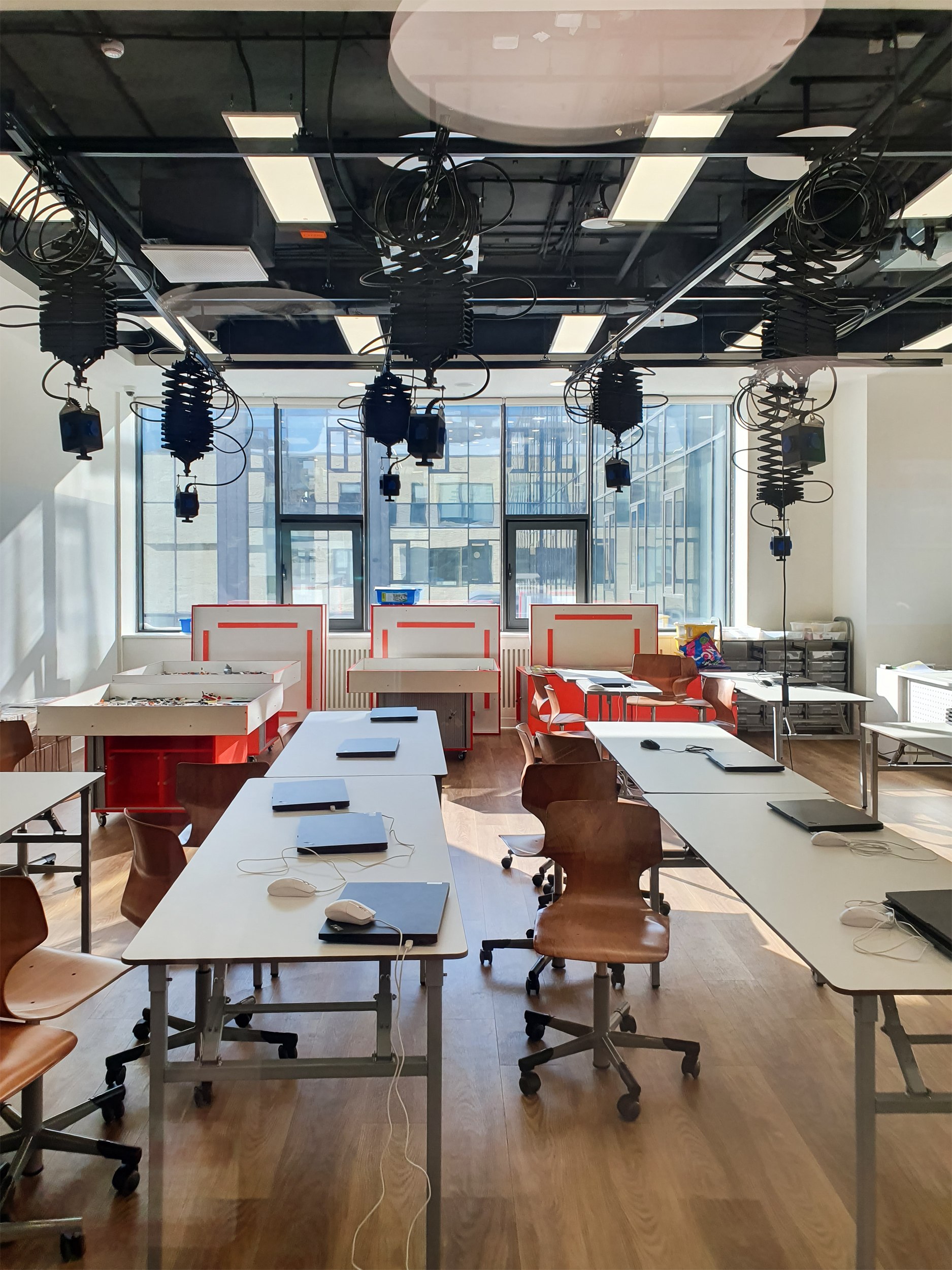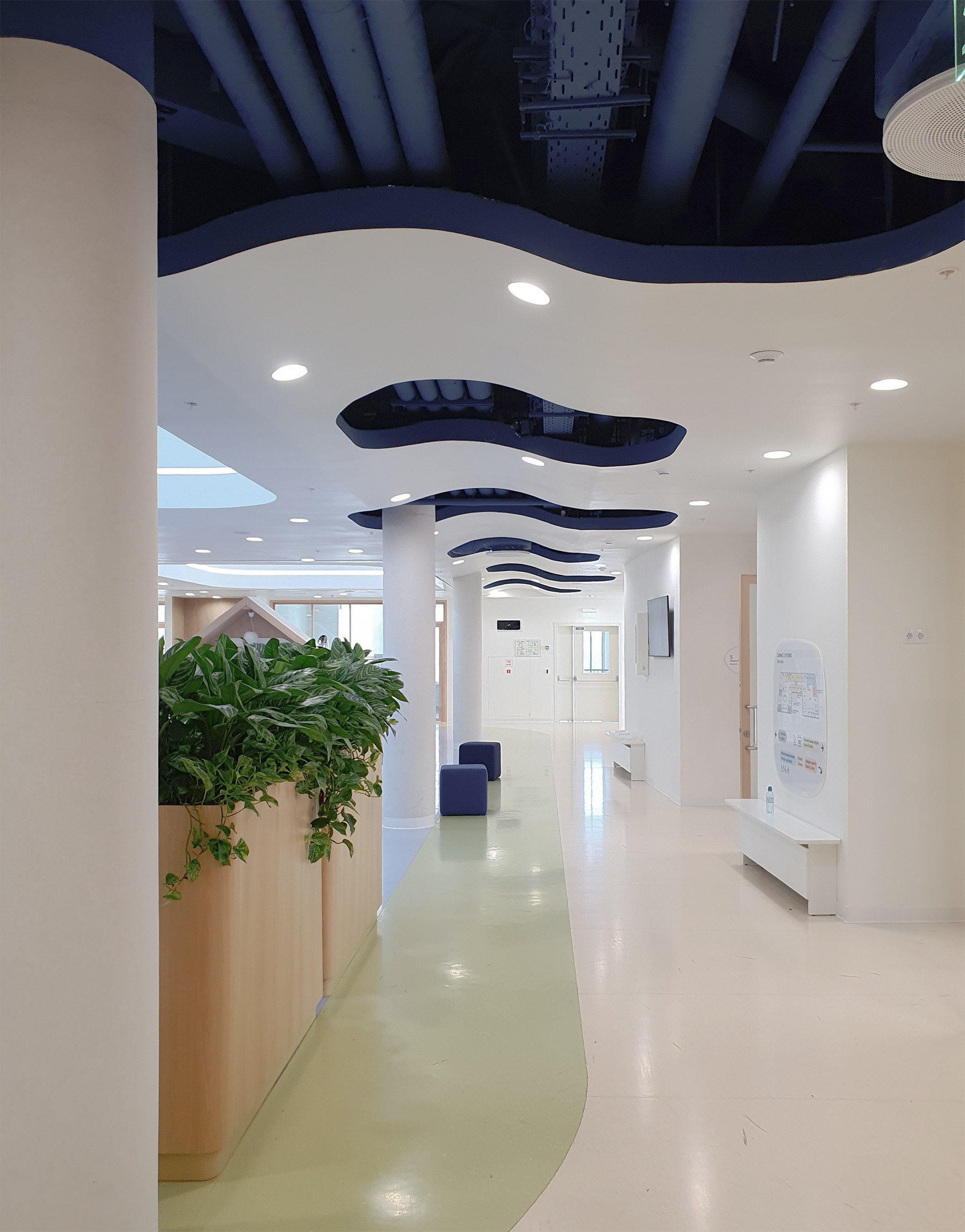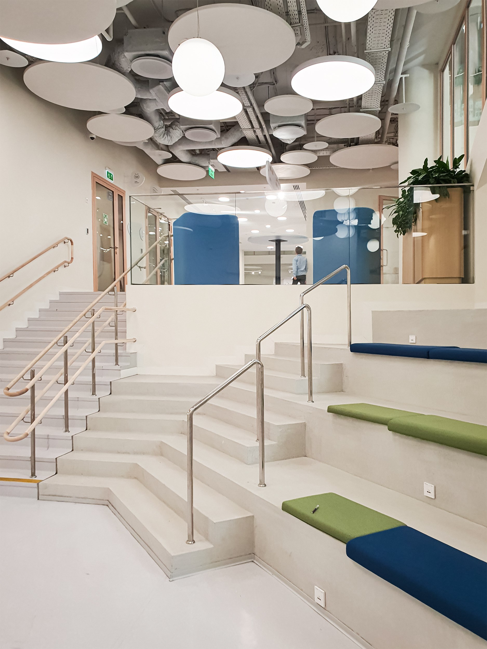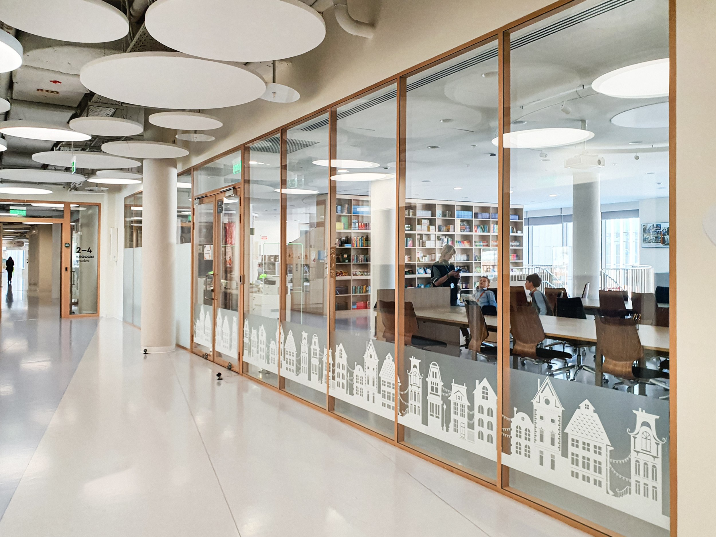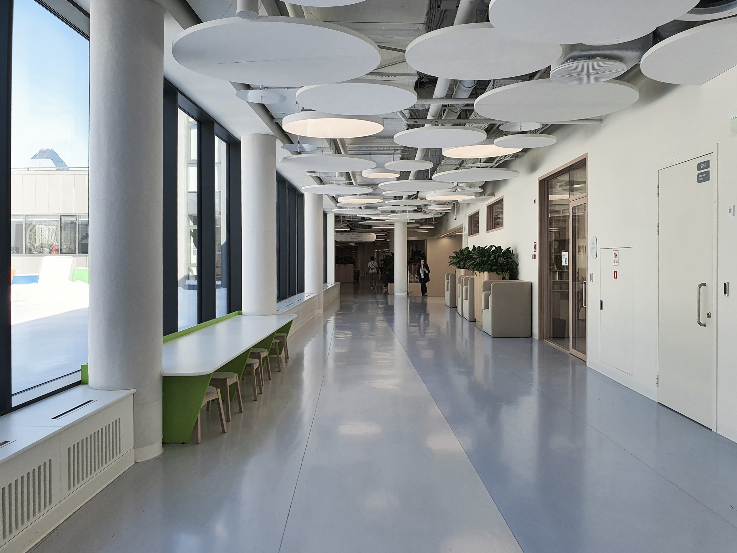 «Зайчики» из зенитных окон перекликаются с круглыми и кольцевидными светильниками на нижних этажах. Светильники, в свою очередь, вписываются в компанию панелей, закрывающих инженерные конструкции потолков, вентиляцию и прочее, но не целиком, а расступаясь и приоткрывая «начинку». Что, вероятно, будет будить воображение школьников, особенно младшеклассников. Полуоткрытые конструкции потолка присутствуют везде, это могут быть «деревянные» решетки, белые диски – их особенно много, они напоминают о звездном небе и планетах; в общественных пространствах средних классов потолки процентов на 80 закрыты белой поверхностью, но прорезаны своего рода «окнами», открывающими вид на коммуникации.
