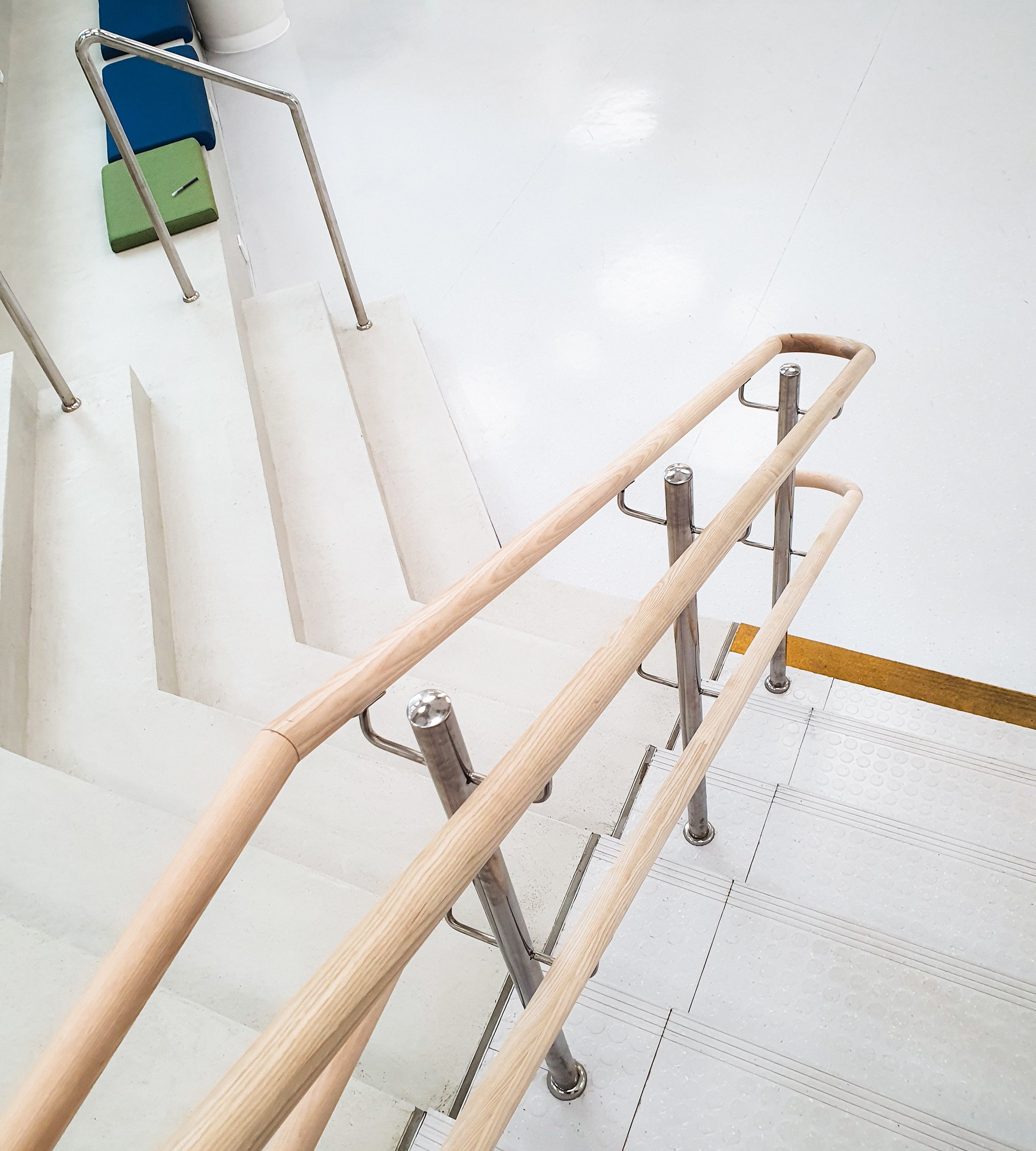 При этом нам постоянно приходилось балансировать между идеей и реальностью. Это школа, а значит, все должно быть максимально износостойким и безопасным. Например, то, что выглядит как дерево, на самом деле чаще всего ламинат или металл – просто потому что натуральное дерево здесь очень быстро выйдет из строя. Или те же поручни: можно сколько угодно хотеть сделать их красивыми, но в реальности они должны быть антивандальными, иначе все это не проживет и года.