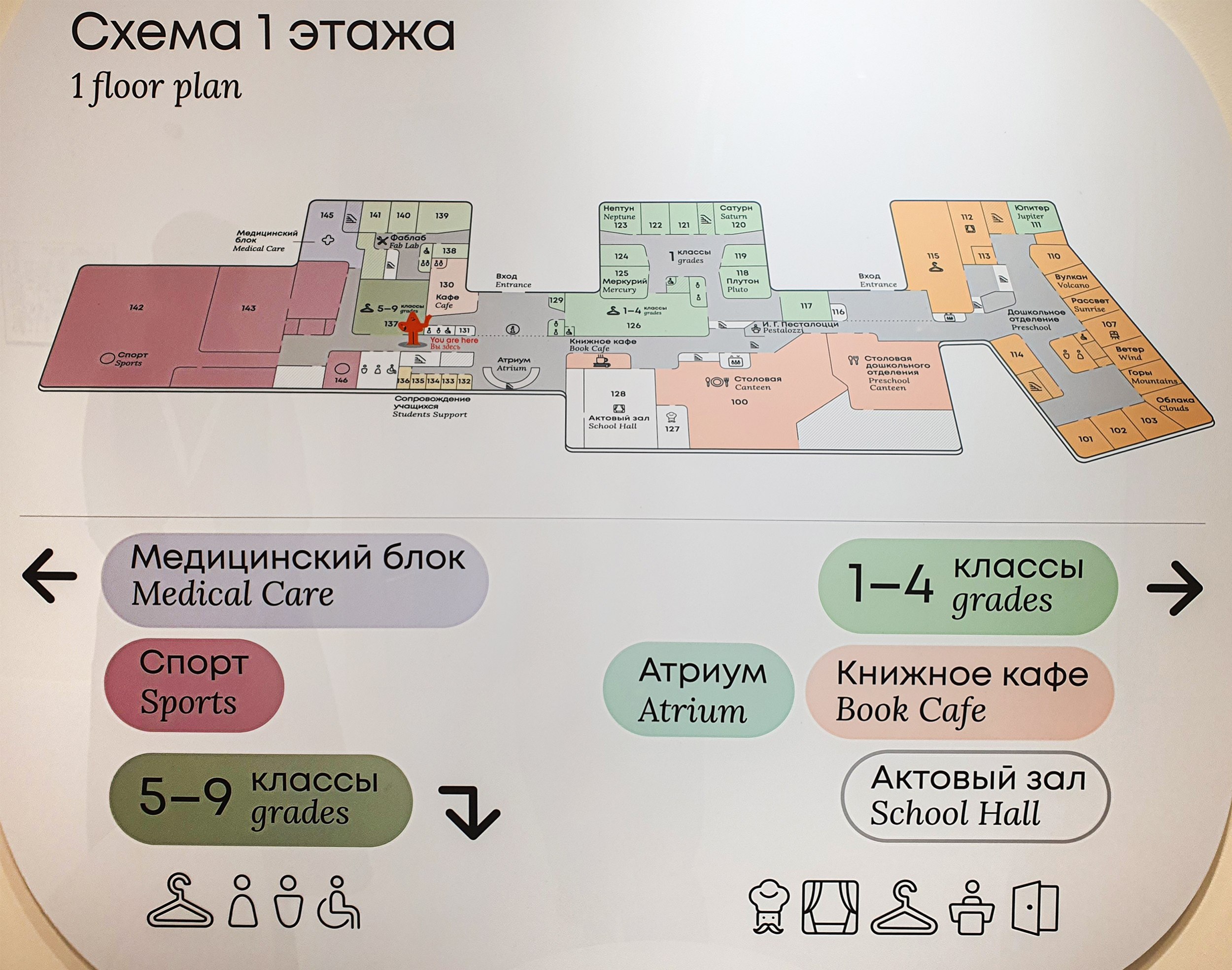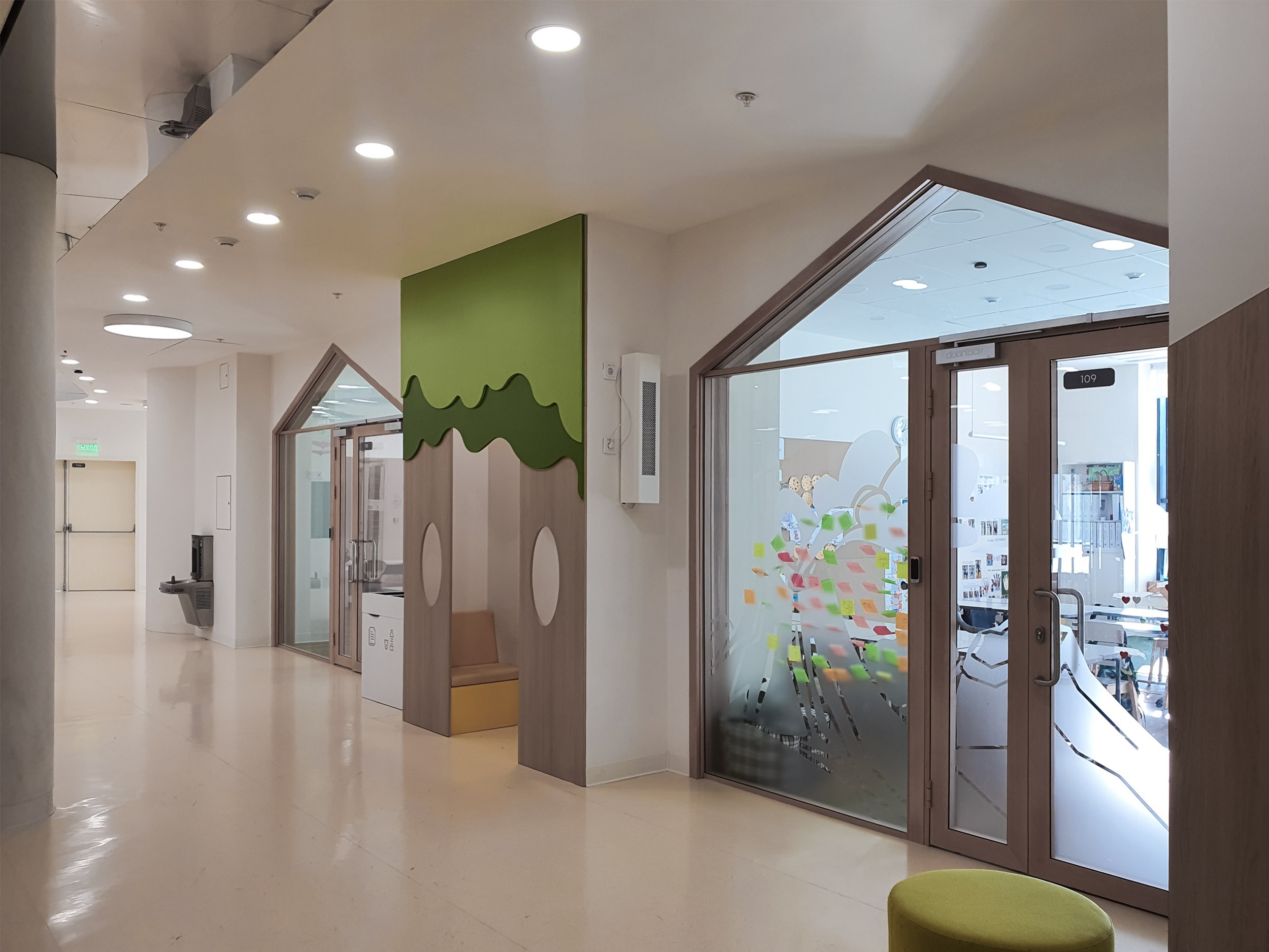 Важно было, чтобы ребенок мог узнавать «свое» место не только внутри, но и снаружи – поэтому классы на фасадах трактованы как отдельные «домики», а не как абстрактная сетка. При этом связующие элементы, наоборот, сделаны максимально нейтральными, чтобы не спорить с этой идентичностью и не перегружать восприятие.