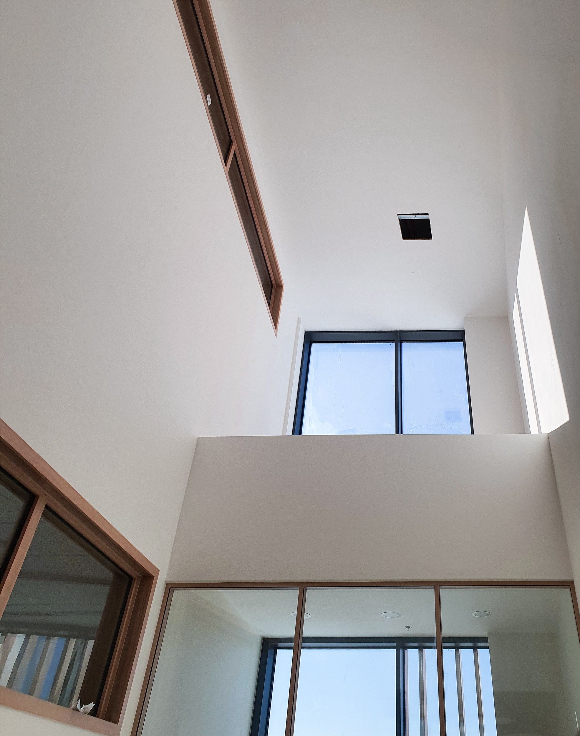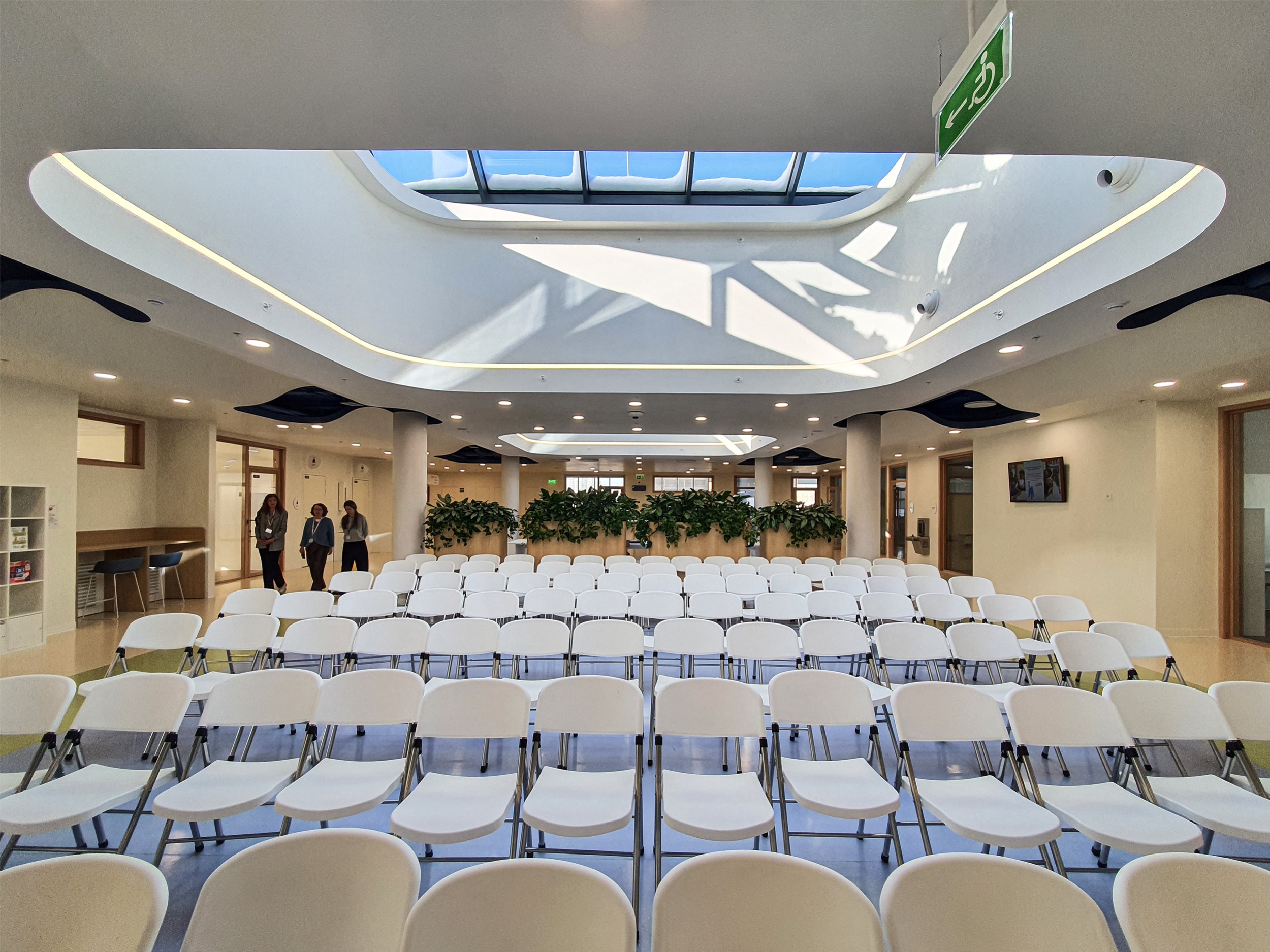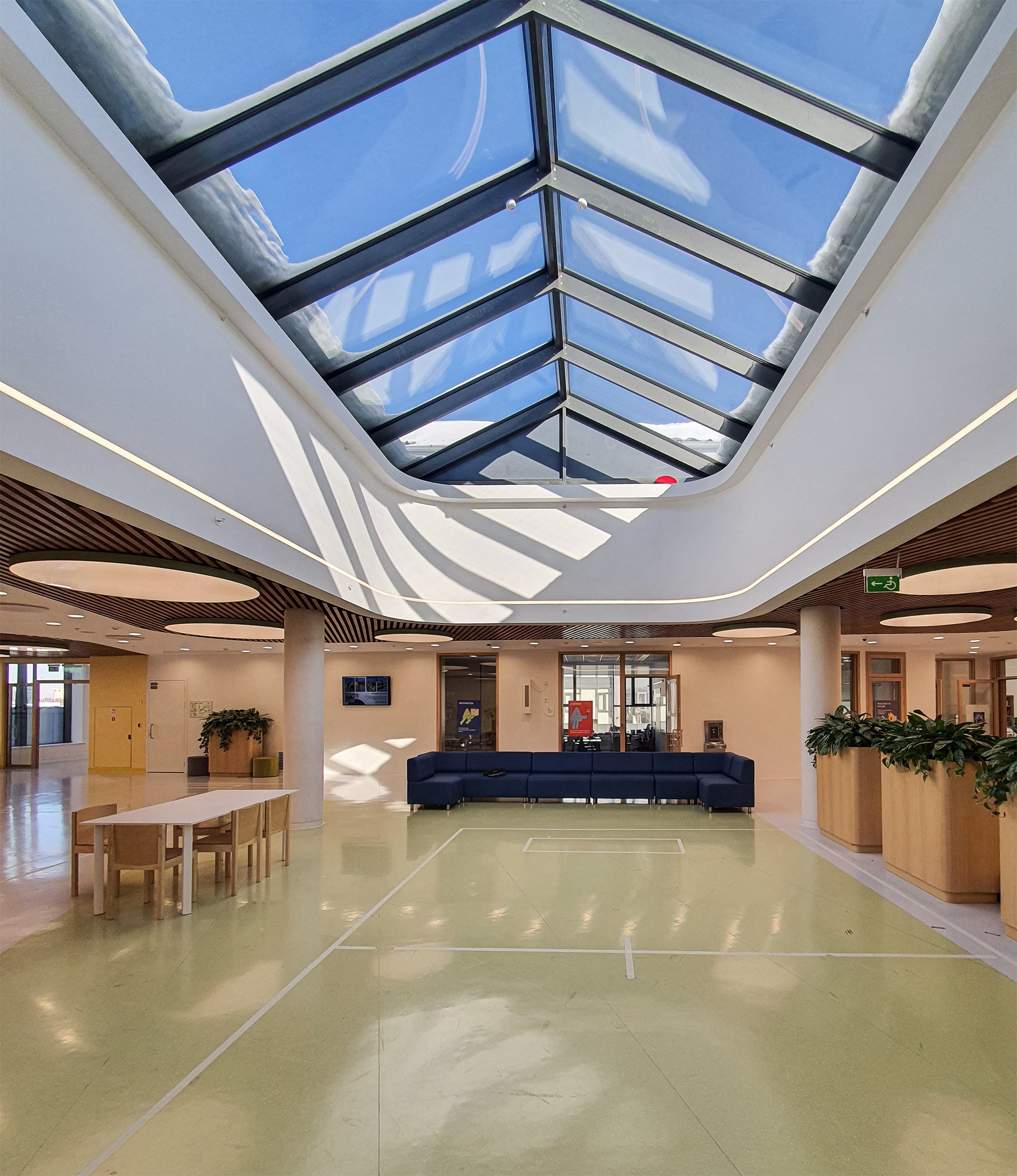 Школа нанизана на продольную ось, и всю ее можно пройти. Она также вытянута с северо-востока на юго-запад и хорошо освещена благодаря витражам, «тонкому» переходу и зенитным фонарям. В солнечный день свет с нами повсюду, а ведь мы почти не заходим в классы; хотя в них несложно заглянуть сквозь прозрачные двери и стены. Помимо витражных стен и зенитных окон – тоже двускатных, «домиком» – в стенах здания местами устроено что-то вроде «полуколодцев»: вертикальные выступы примыкают к общественным зонам, а внутри они, как правило, обладают цельным пространством, объединяющим два этажа и этаким внутренним балконом, позволяющим посмотреть с одного этажа на другой, то вверх, то вниз; и наружу, конечно.