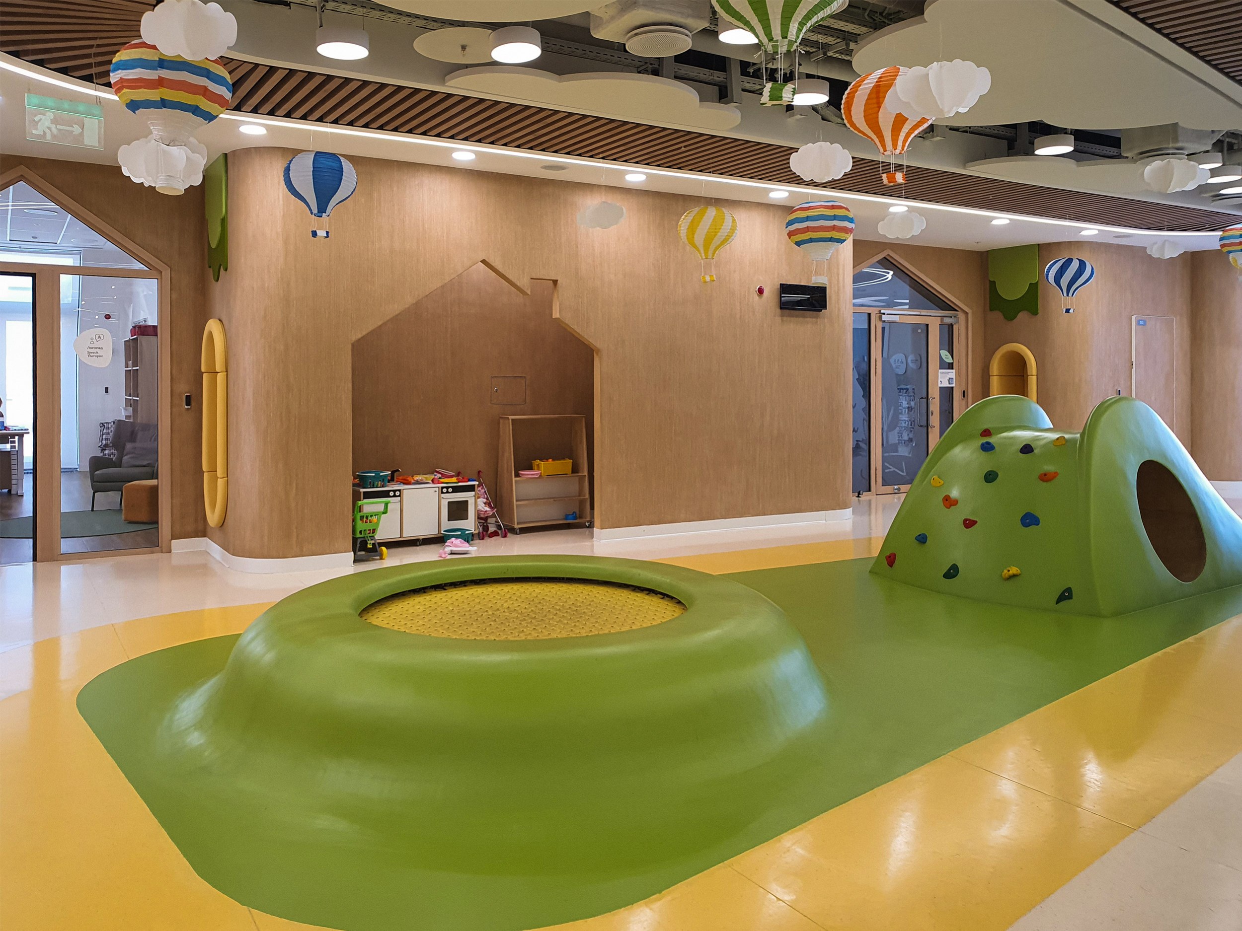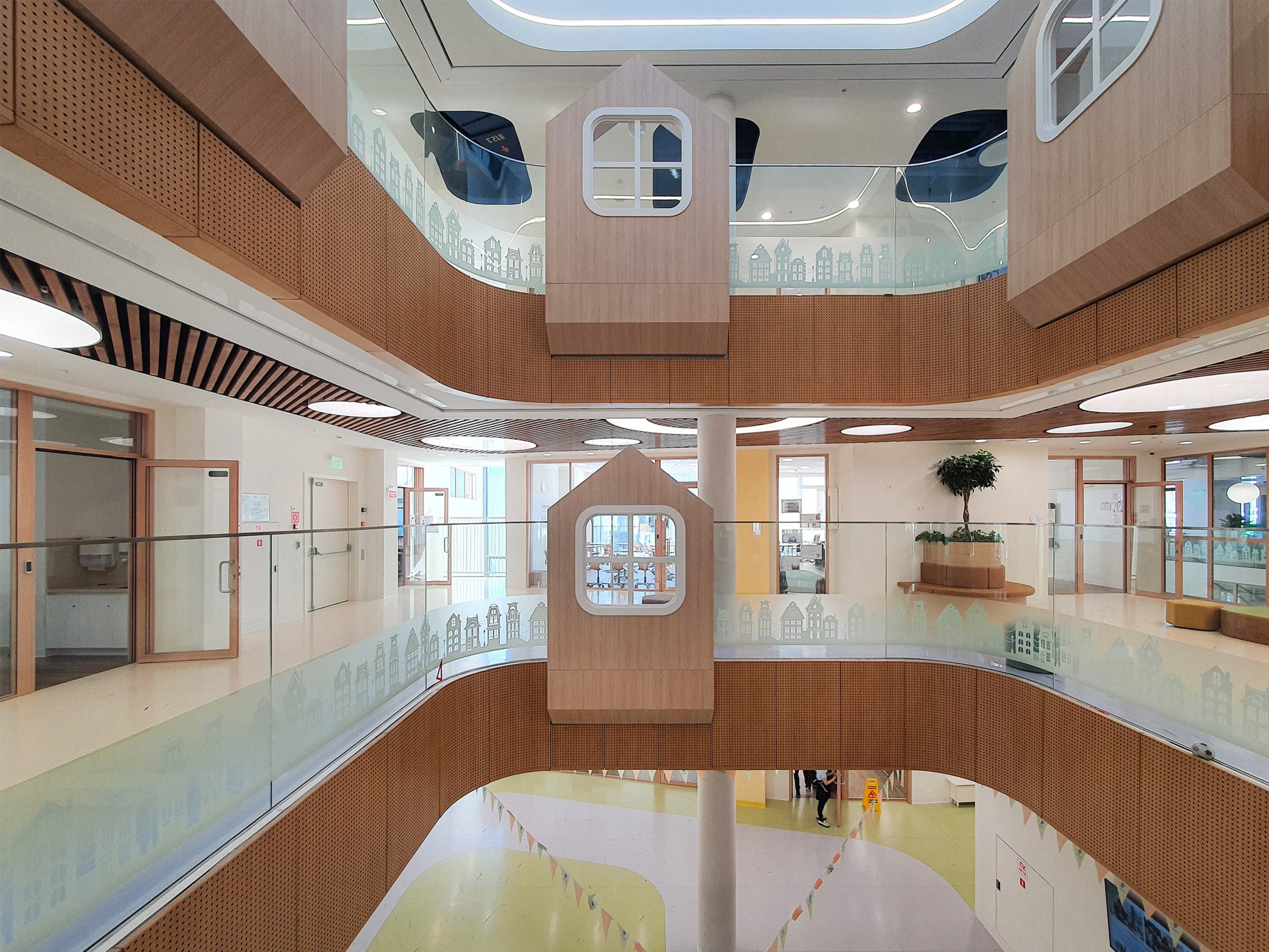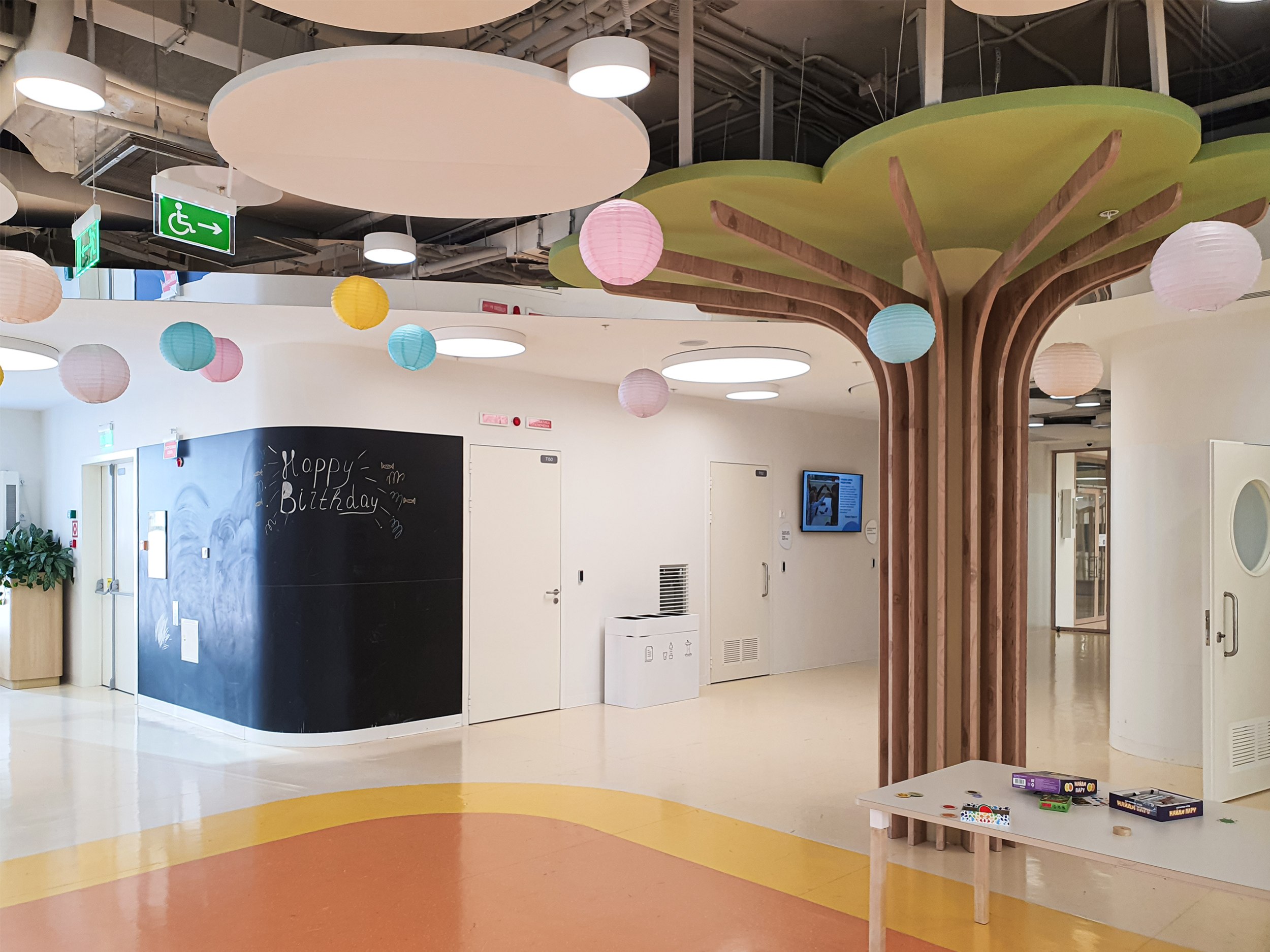 Здесь же преобладает имитация дерева: на стенах, решетках потолков, рамах дверей и стволах «деревьев». Натуральное дерево использовать нельзя по нормативам, но задачей было создать для самых младших максимально комфортную обстановку.