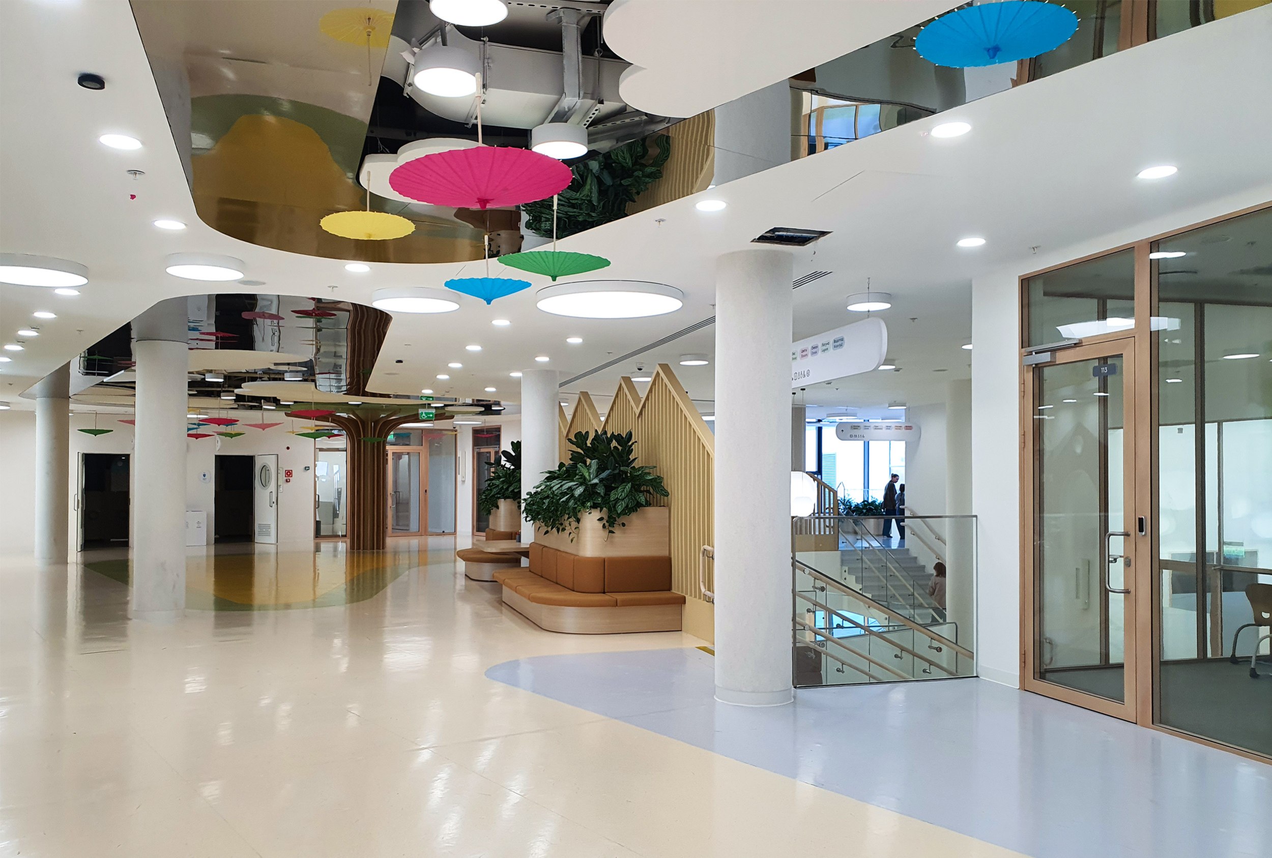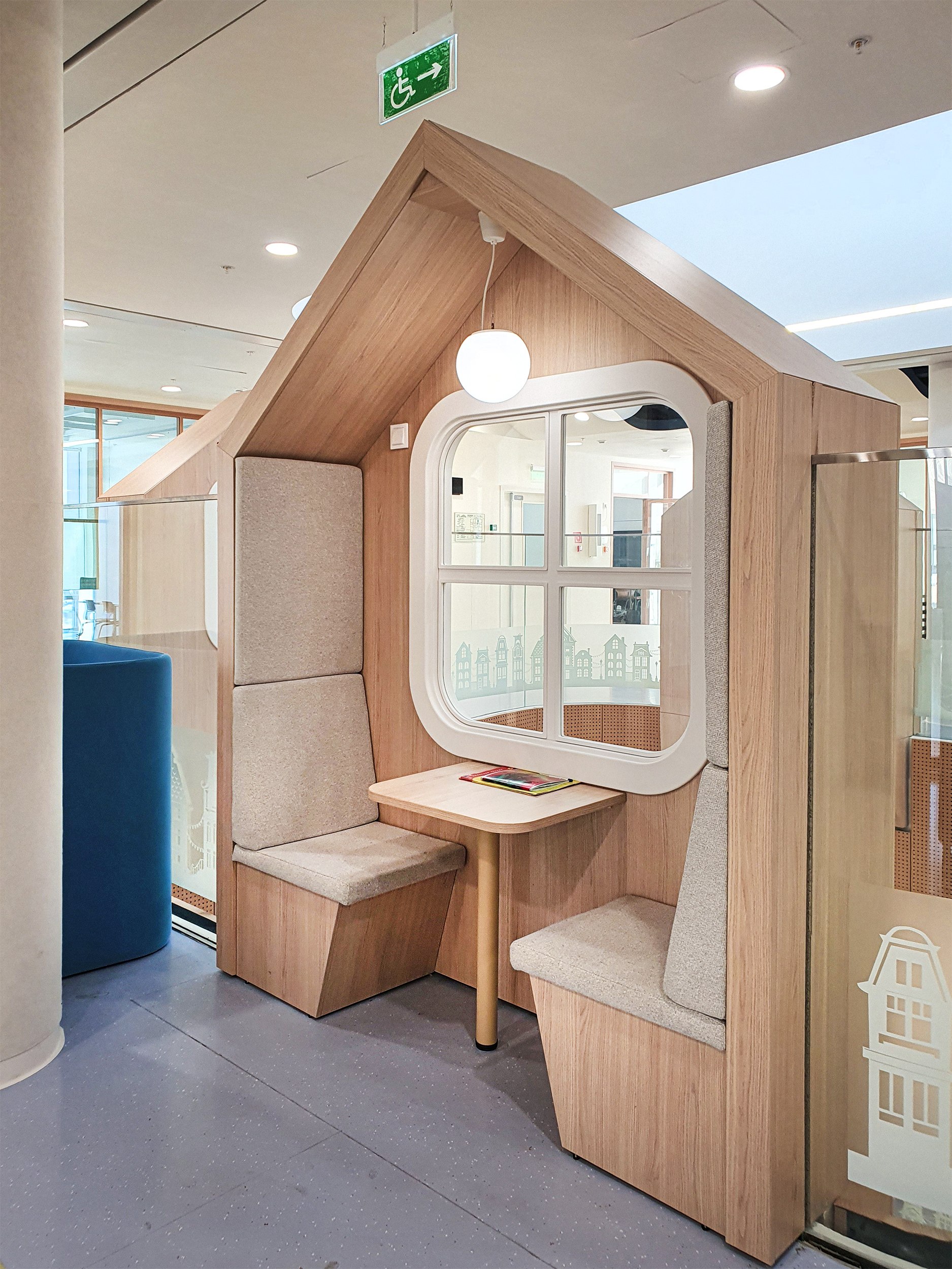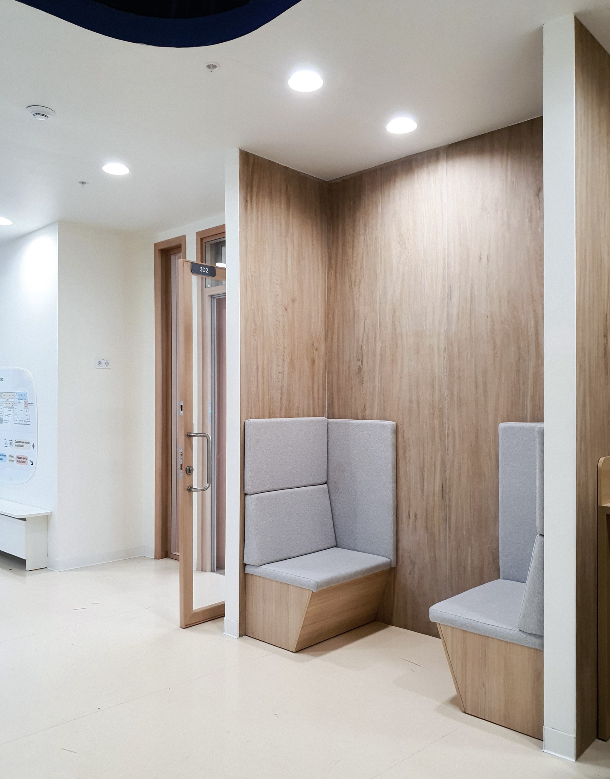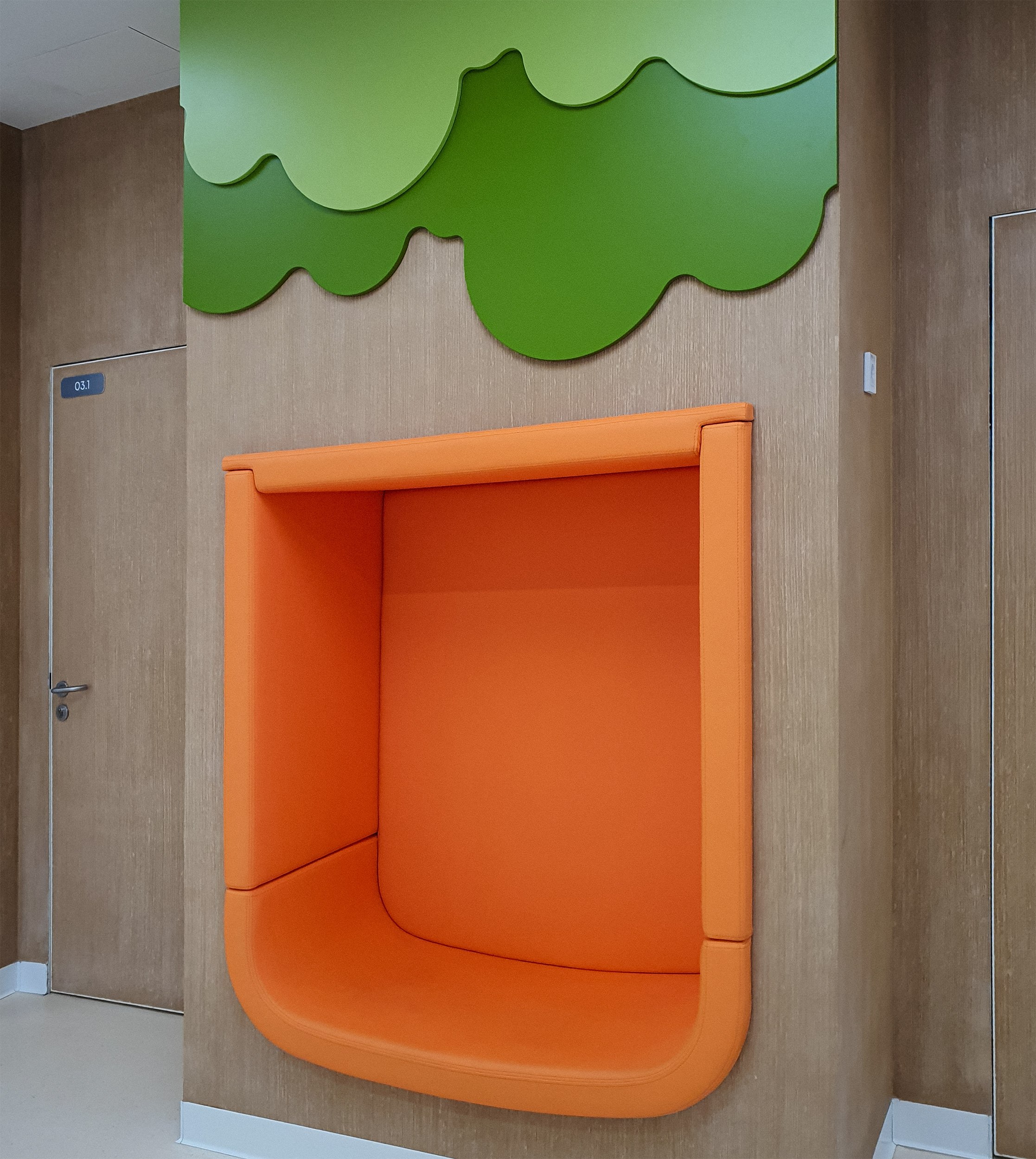 Здесь же преобладает имитация дерева: на стенах, решетках потолков, рамах дверей и стволах «деревьев». Натуральное дерево использовать нельзя по нормативам, но задачей было создать для самых младших максимально комфортную обстановку.