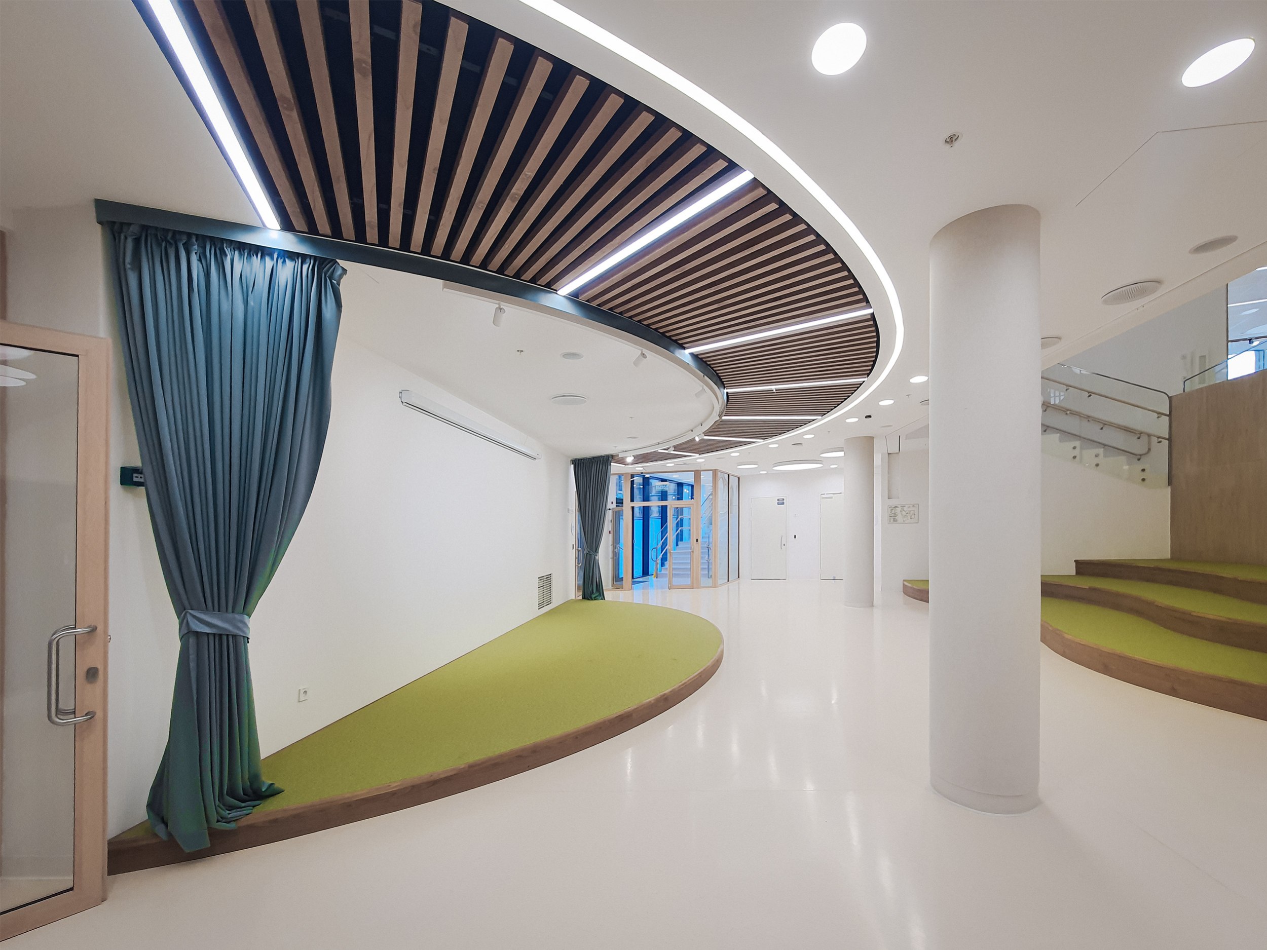 Очень важным было и то, что школа изначально ставила задачу раскрывать таланты детей. Поэтому в пространстве появляется много того, чего в обычной школе просто нет: небольшие сцены, где ребенок может выступить на перемене, тактильные стены, игровые элементы, зоны для настольных игр, коворкинги. Даже столовая – это не просто столовая, там есть стеклянный куб, где дети учатся готовить. То есть школа становится не набором классов, а средой для разных типов активности.
