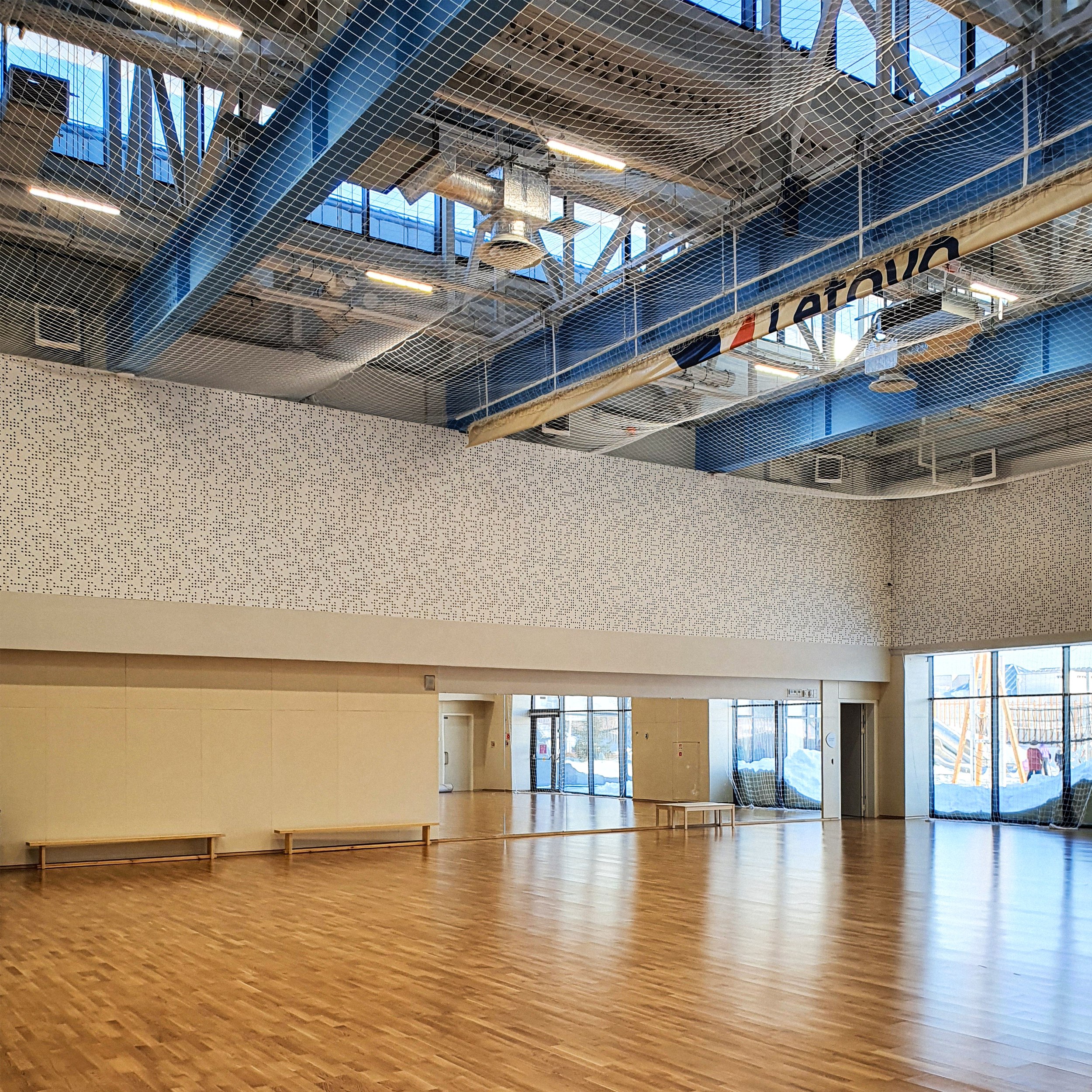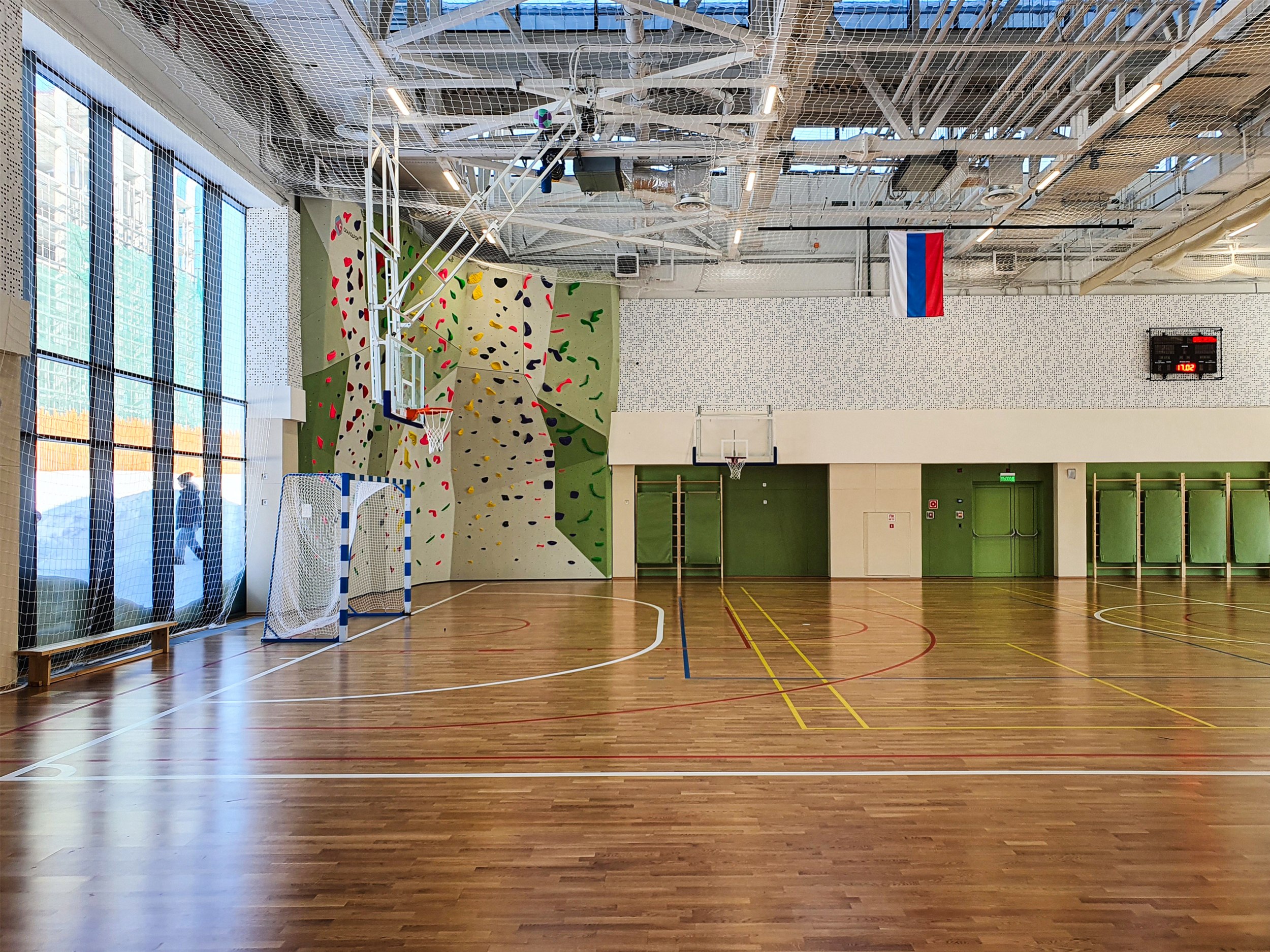 Ну и спортзалы – максимально прагматичные внутри, с мощным плетением конструкций потолков.