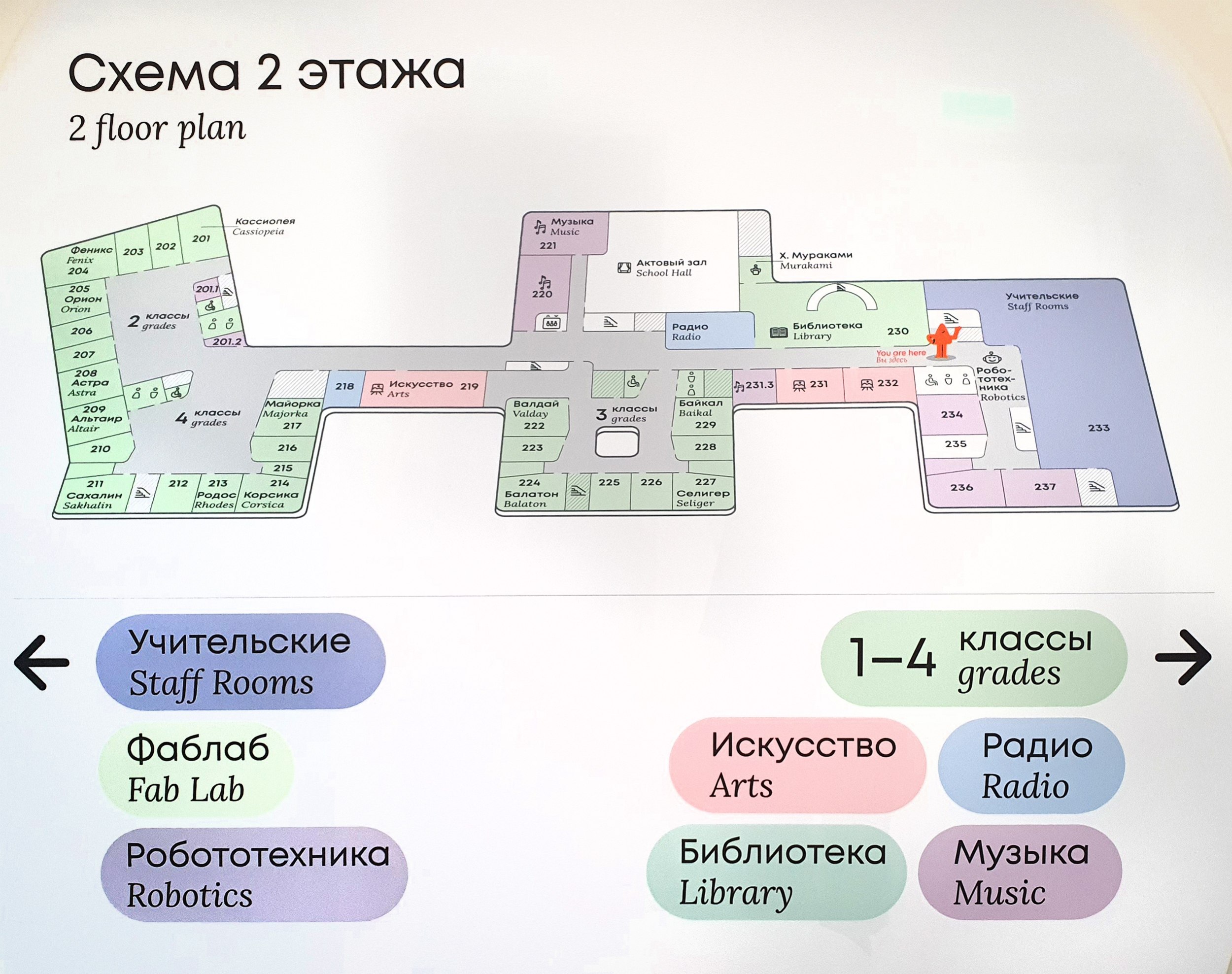 Отдельная большая тема – цвет. Мы делали целую презентацию о том, как цвет влияет на восприятие, потому что в школе это не декоративная вещь. В классе он не должен отвлекать, а в рекреации, наоборот, может задавать настроение. Причем для разных возрастов это вообще разные решения: маленькие дети воспринимают только чистые цвета, в младшей школе появляются более сложные оттенки, а в средней – уже глубокие, нюансные. Это была колоссальная работа, и она шла параллельно с проработкой функций.