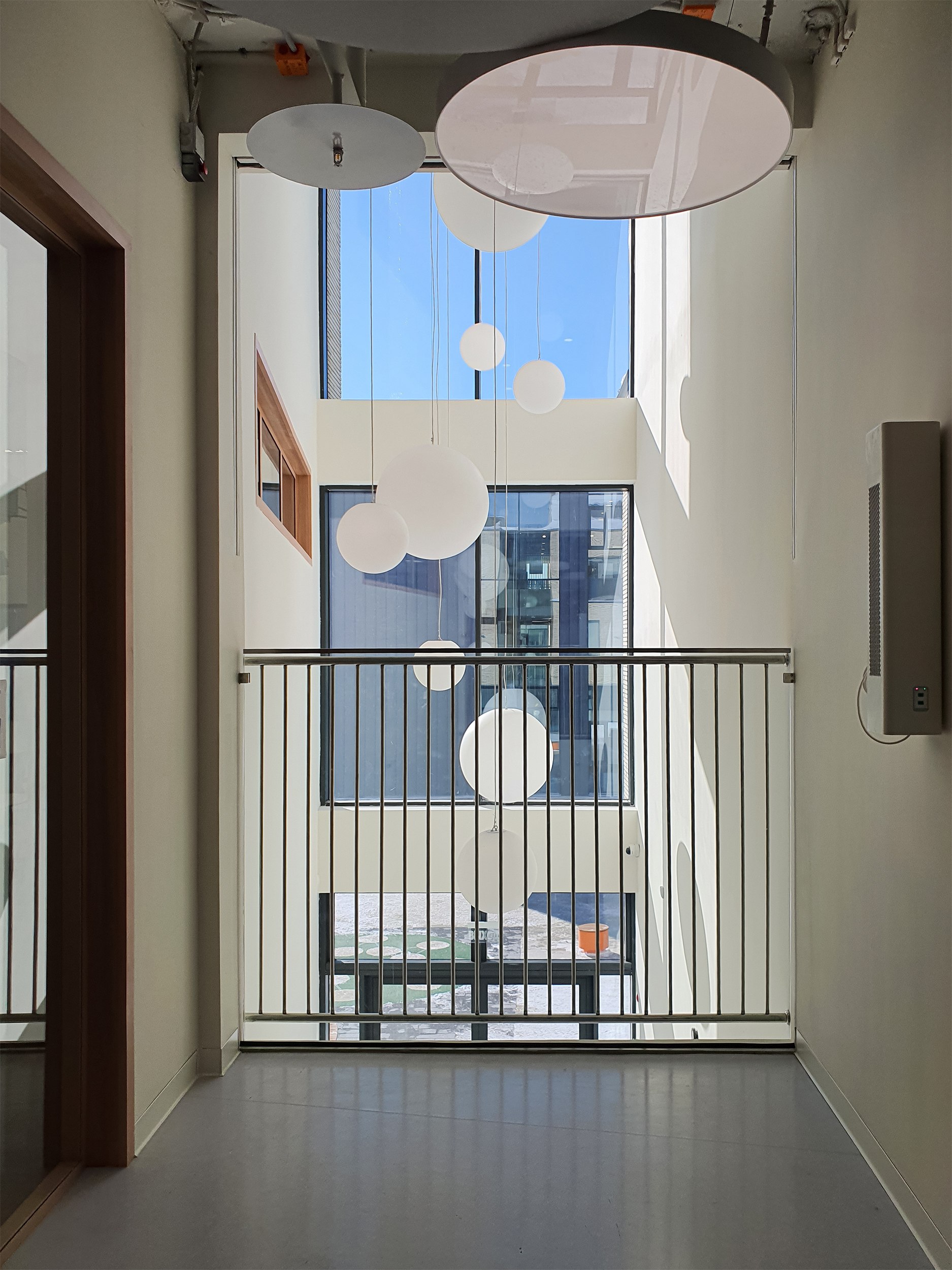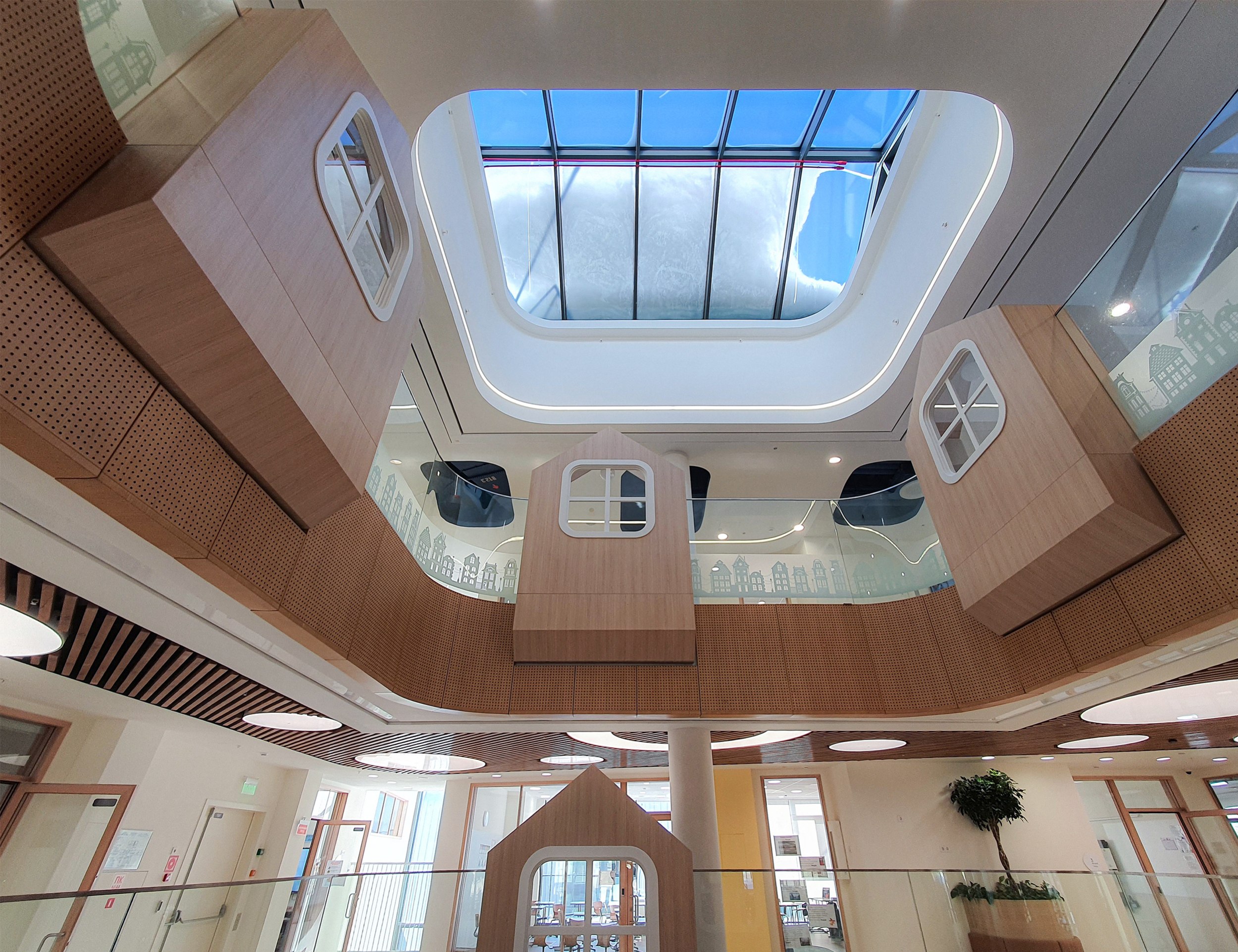 Здесь нет «доминирующего» главного атриума-площади, пространство скорее составлено из множества небольших «площадей». У младших классов сопоставление выражено особенно ярко, поскольку ярусы атриума окружены именно «домиками». Внутри каждого пространство для уединения с окошком, смотрящим в многоярусное пространство.