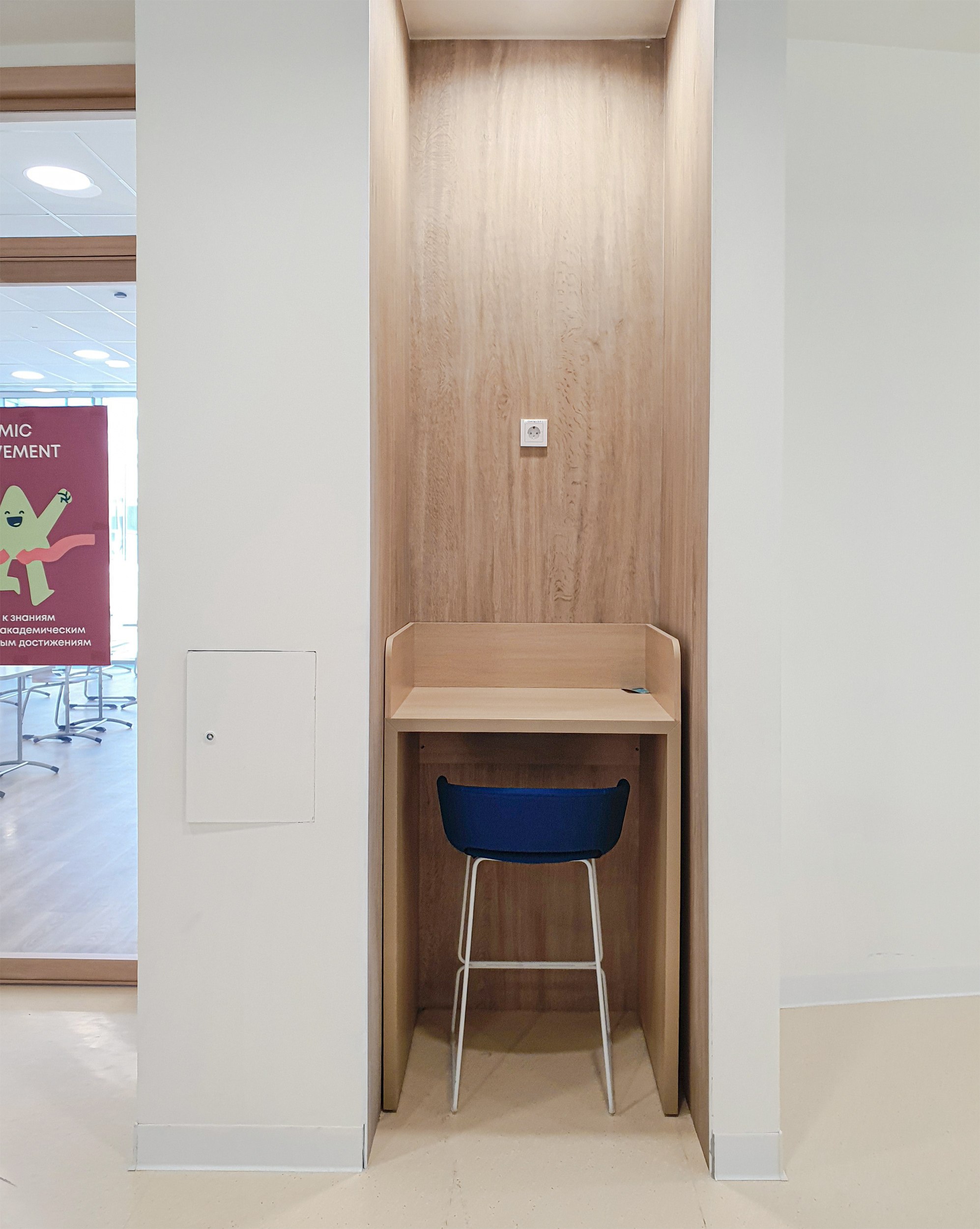 Ячеек для уединения, напомню, много, и они разнообразны. Что в средних классах – либо «переговорка», либо узкий простенок с розеткой – честно говоря, этот вертикальный «ящик» спиной ко всем мой фаворит среди всех вариаций, хотя есть сомнения, что дети захотят сидеть спиной ко всем проходящим мимо. Впрочем, может быть, формат «открытой спины» говорит о комфортной обстановке внутри школы, где никто никого не боится.