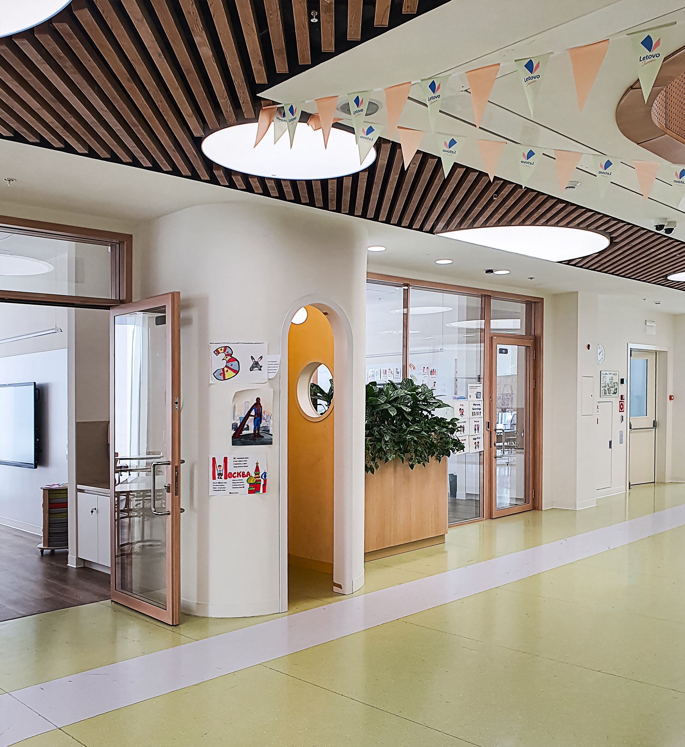 Зданием «Летово Джуниор» занимались архитекторы экосистемы UNK – внутри и снаружи, выиграв два закрытых конкурса: на фасады, по массингу проектной группы компании Level, которая выступает девелопером проекта; и на интерьеры – причем в последнем случае в конкурсе участвовало целых 10 бюро. Победили UNK Design под руководством Марины Димовой – что интересно, это первый проект школы среди их работ: в портфолио преобладают офисы, включая интерьер особняка UNK, и коммерческие пространства. Тем ценнее была для авторов победа и реализация проекта. Главной, как для фасадов, так и для интерьера, стала, согласно пожеланию заказчика, тема дома.
