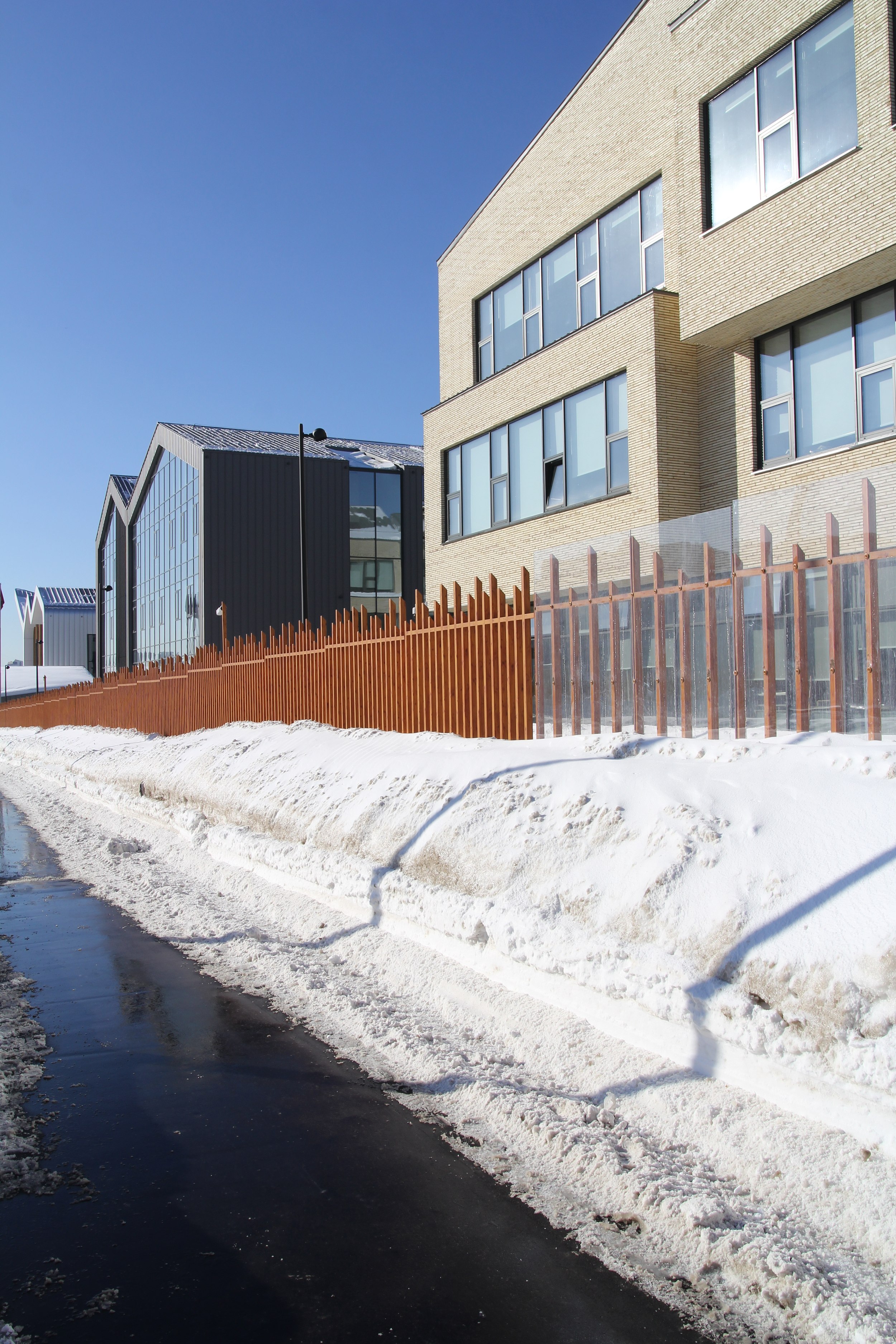 Надо сказать, что это здание целостно, как единый организм, воспринимается именно изнутри. Может быть, потому что снаружи окружено неизбежным забором – впрочем, он тут из оранжевого дерева и прозрачных пластиковых листов, что делает ограждение достаточно дружелюбным. И тем не менее. На входе – домик-входная группа, затем вереница из четырех разных объемов со стеклянными переходами, образующие западающие, достаточно просторные, площади. Очень даже возможно, что дети, которым доведется в теплое время бегать здесь вокруг, будут воспринимать школу территорию школы иначе, собственно как и задумывалось, как мини-город с пространствами разного масштаба, широкой игровой площадкой у южного торца, футбольным полем у северного. Но любой, кто двигается вдоль проезда, ощущает ее дискретно – как набор разных объемов на огороженной территории.