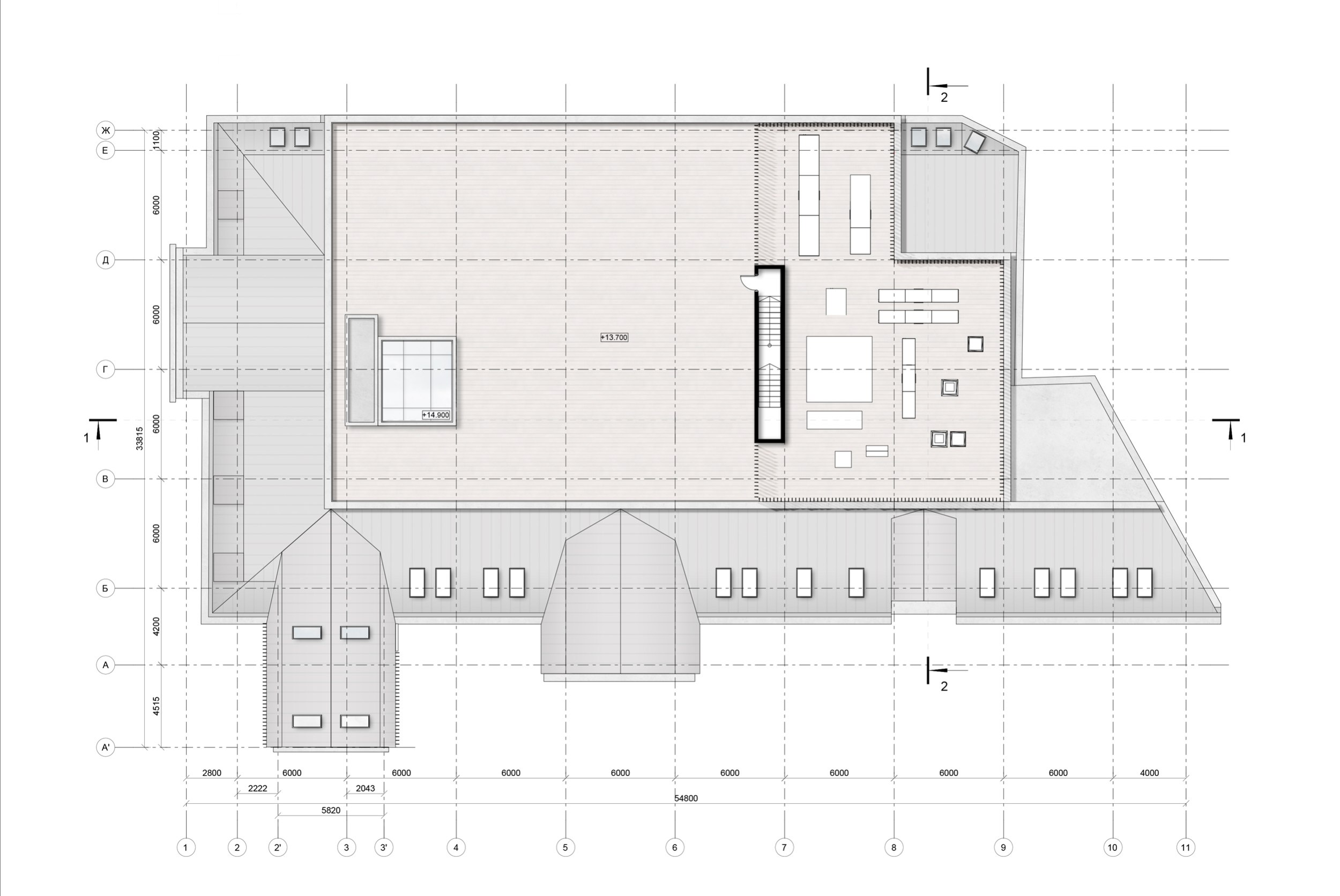 При общей площади 6 279.6 м² и объеме нового строительства 3 105 м² здание решено в 5 уровней (1 подземный и 4 надземных) при высоте 16.30 м.