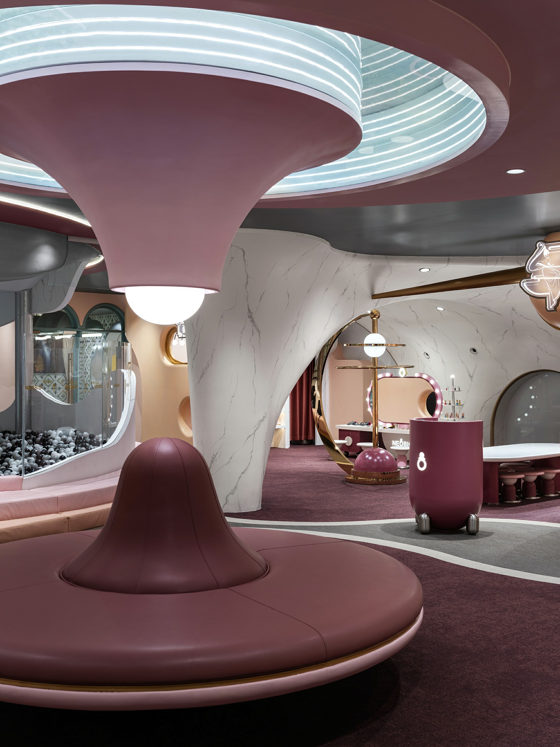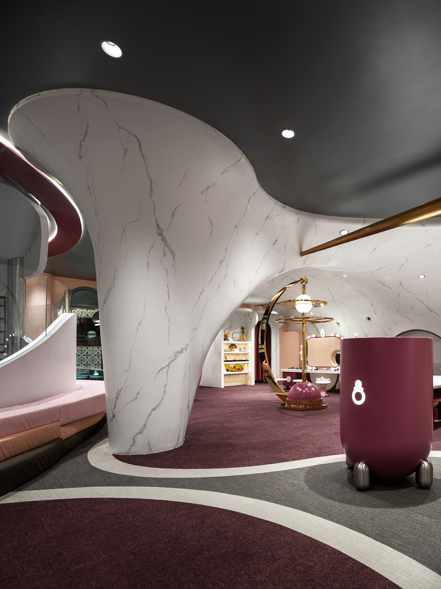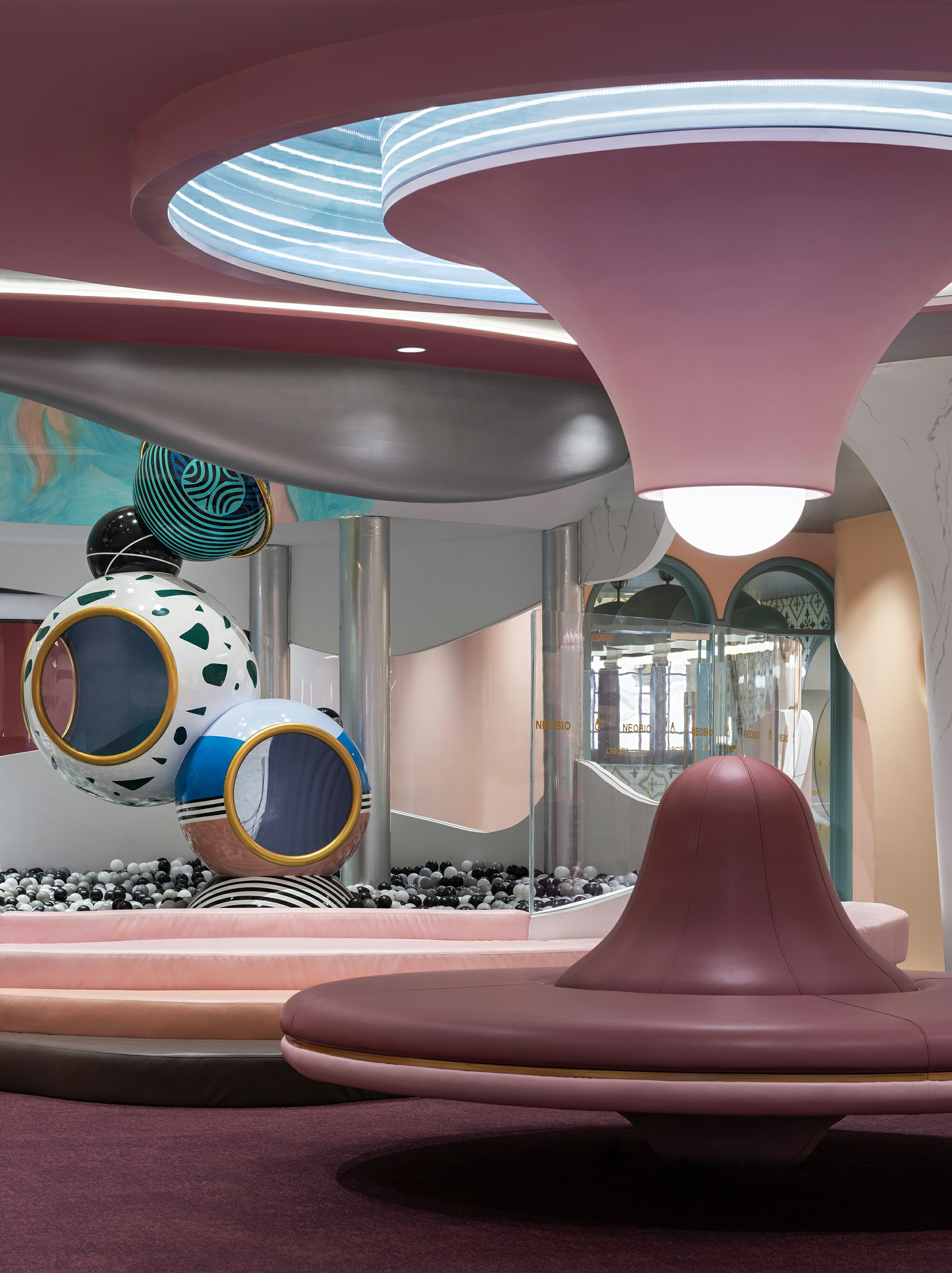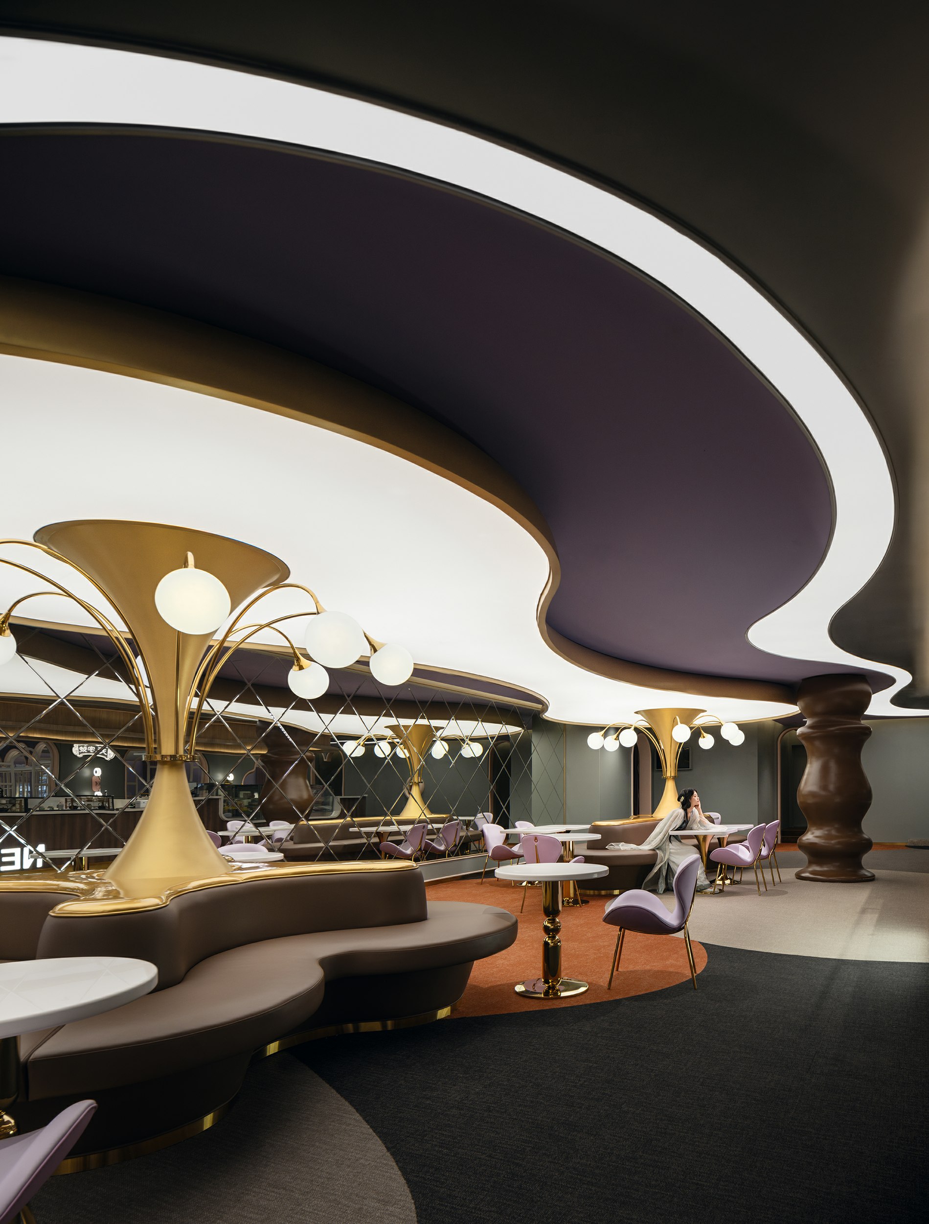 Нужно отдать должное дизайнерам и архитекторам PIG DESIGN. Они с энтузиазмом переосмысливали все возможные элементы интерьера, создавая для них новые формы, используя неожиданные материалы и цвета и собирая их в какие-то невероятные «букеты» из светильников, колонн, перегородок, лестниц и предметов мебели. Причем часть объектов буквально перетекает одни в другие, и в некоторых местах трудно разобраться, что перед тобой – исключительно декоративный или вполне функциональный элемент. Благодаря этому посещение центра превращается в своеобразный квест, во время которого посетители должны разобраться в том, что есть что и как этим пользоваться.