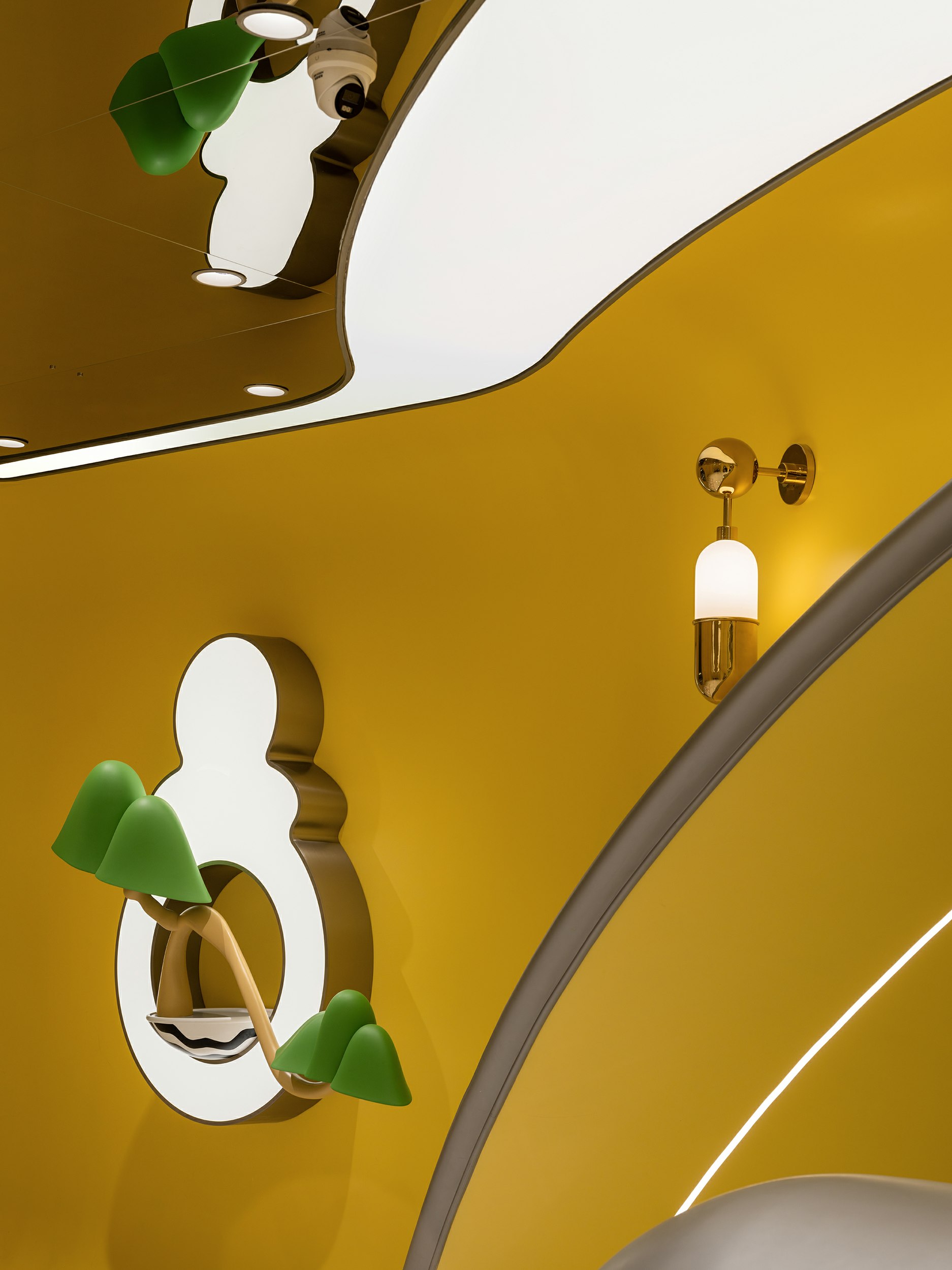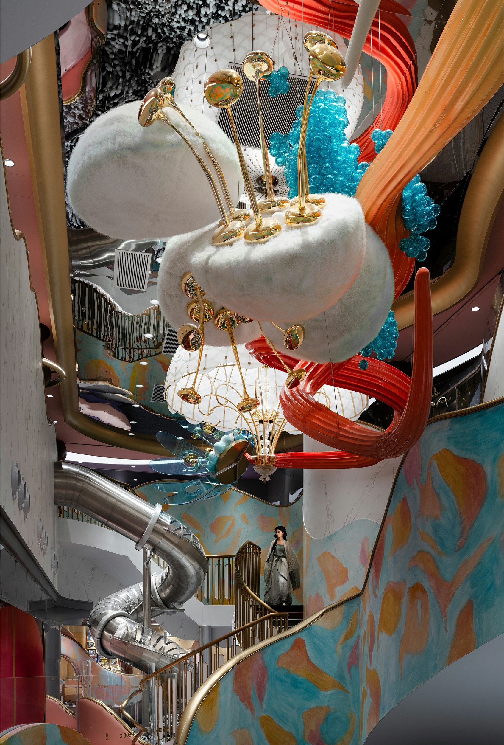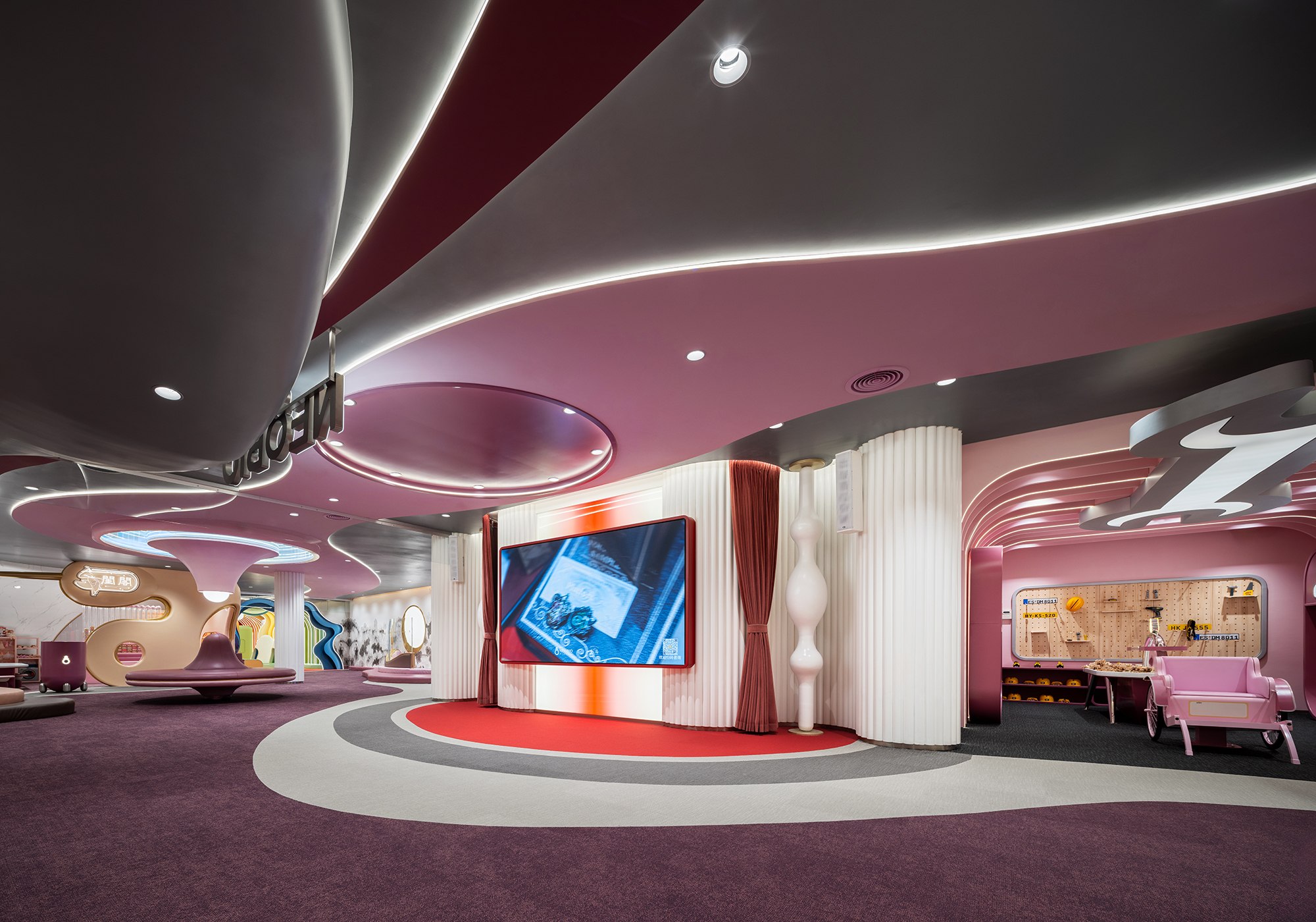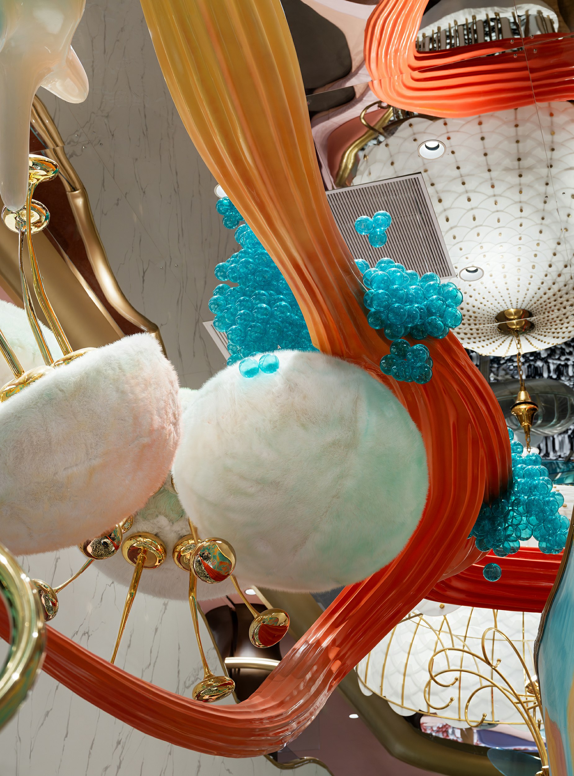 Нужно отдать должное дизайнерам и архитекторам PIG DESIGN. Они с энтузиазмом переосмысливали все возможные элементы интерьера, создавая для них новые формы, используя неожиданные материалы и цвета и собирая их в какие-то невероятные «букеты» из светильников, колонн, перегородок, лестниц и предметов мебели. Причем часть объектов буквально перетекает одни в другие, и в некоторых местах трудно разобраться, что перед тобой – исключительно декоративный или вполне функциональный элемент. Благодаря этому посещение центра превращается в своеобразный квест, во время которого посетители должны разобраться в том, что есть что и как этим пользоваться.