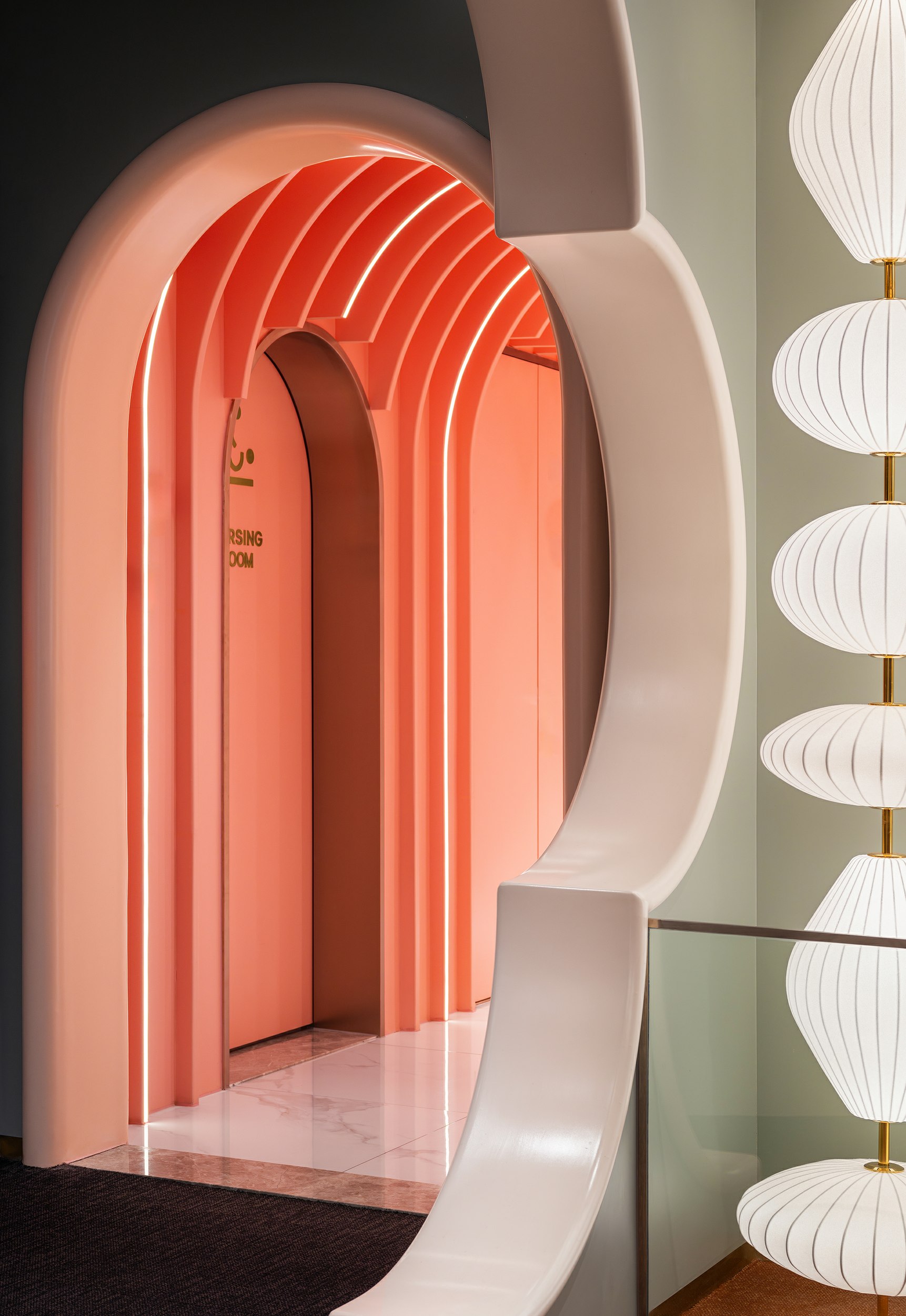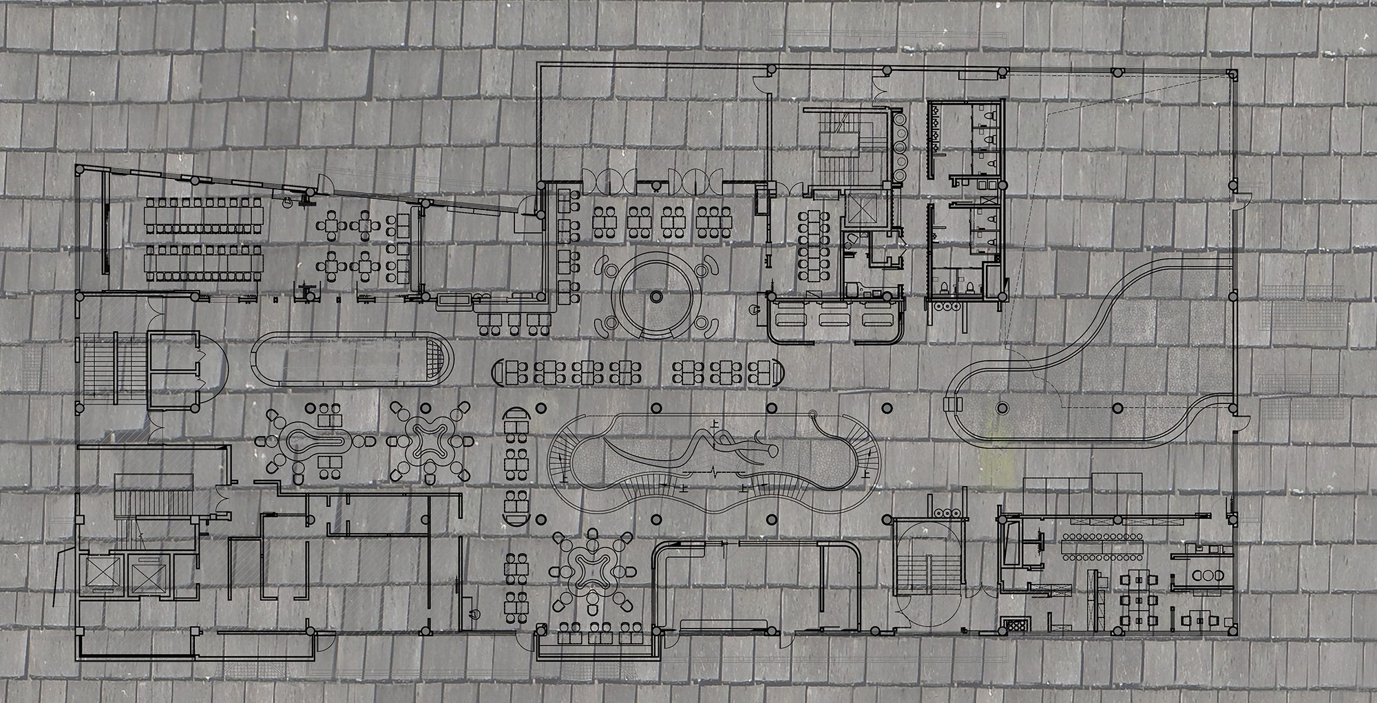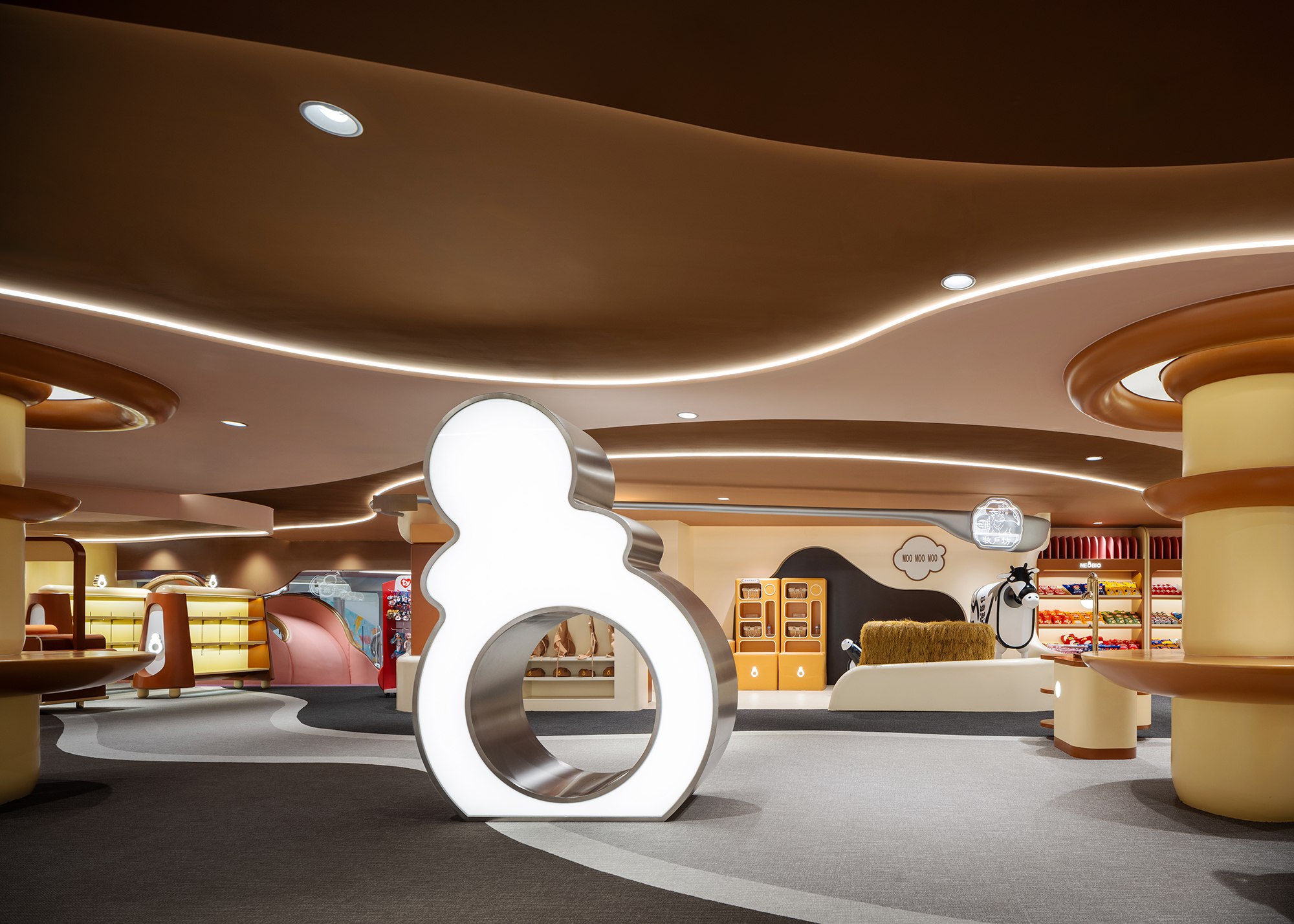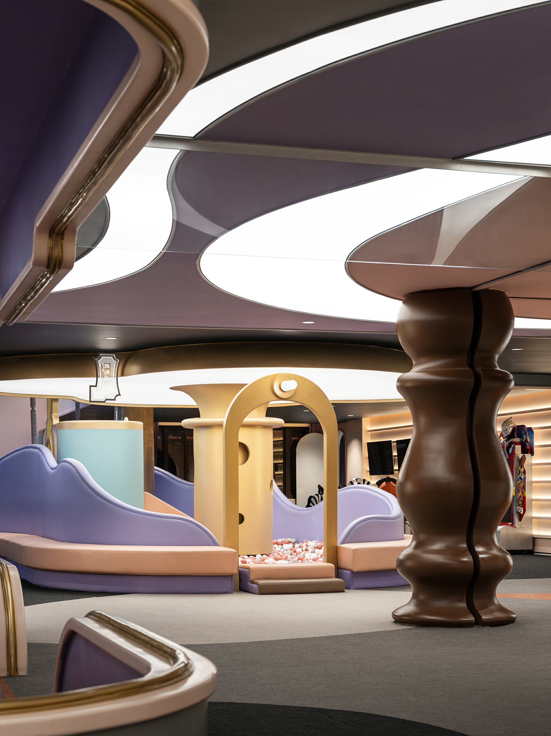 Нужно отдать должное дизайнерам и архитекторам PIG DESIGN. Они с энтузиазмом переосмысливали все возможные элементы интерьера, создавая для них новые формы, используя неожиданные материалы и цвета и собирая их в какие-то невероятные «букеты» из светильников, колонн, перегородок, лестниц и предметов мебели. Причем часть объектов буквально перетекает одни в другие, и в некоторых местах трудно разобраться, что перед тобой – исключительно декоративный или вполне функциональный элемент. Благодаря этому посещение центра превращается в своеобразный квест, во время которого посетители должны разобраться в том, что есть что и как этим пользоваться.