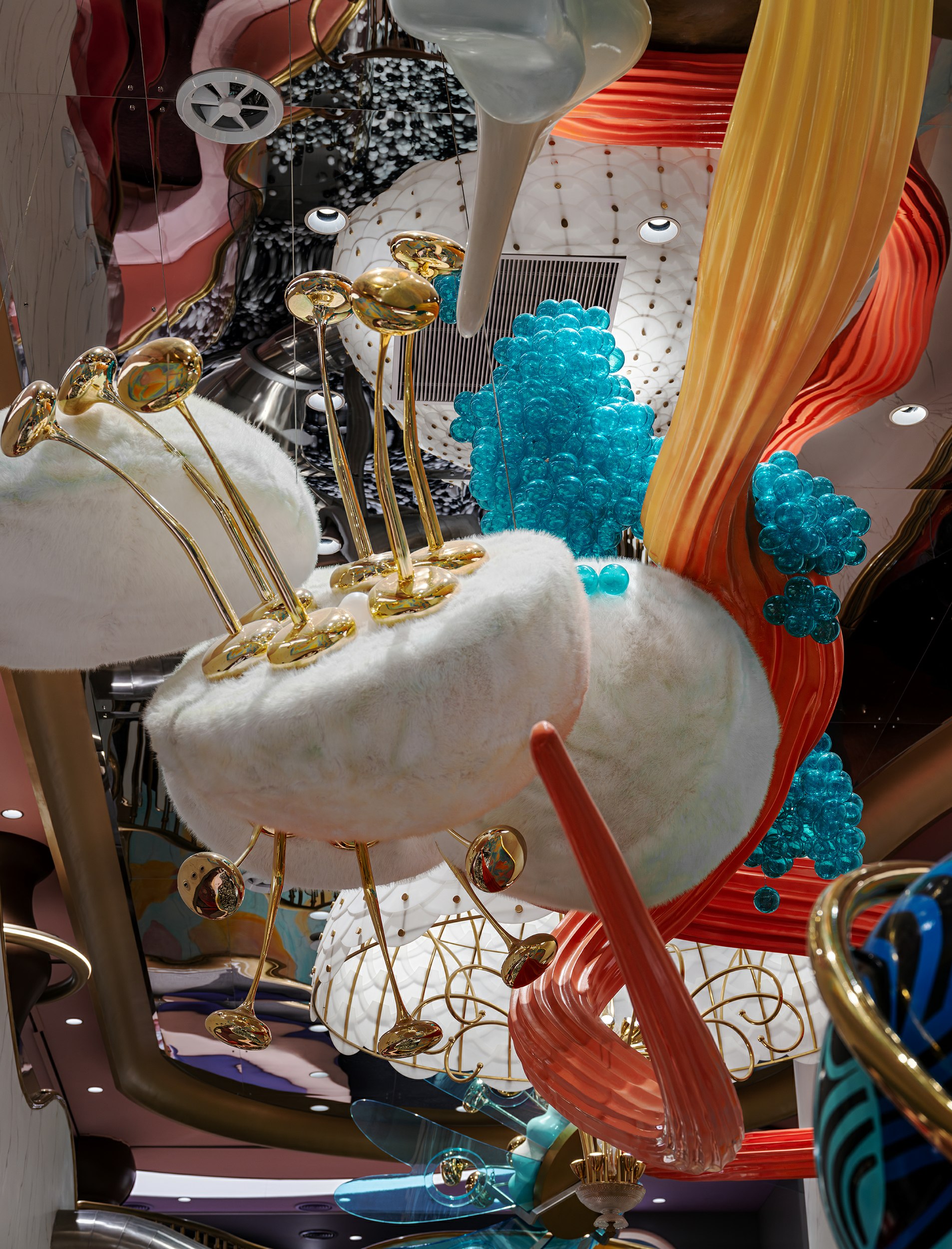 Дальше посетителей ждет путешествие из одного ошеломляющего пространства в другое. Меняются цвета, меняются стили, но остается неизменной психоделичность и фонтанирующая жизнерадостность, от которой можно немного отдохнуть лишь в нескольких залах, чье оформление в любом другом месте показалось бы крайне экстравагантным, а здесь воспринимается как зона для визуального релакса.