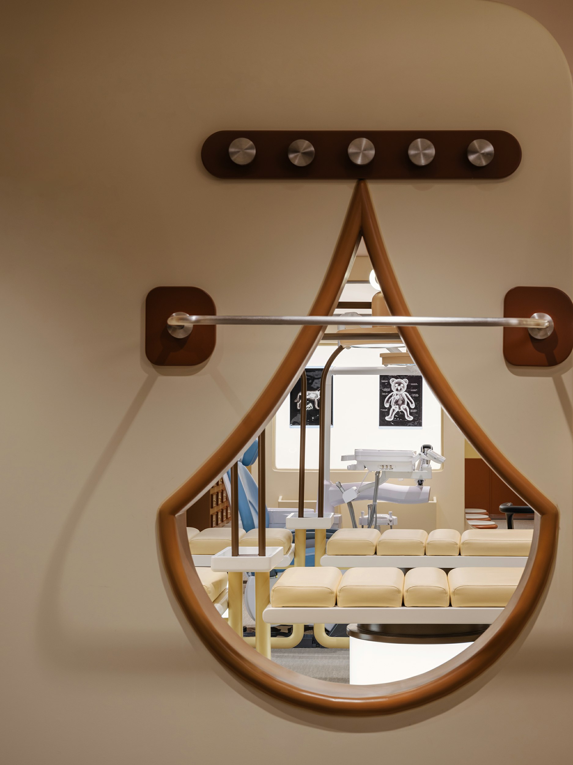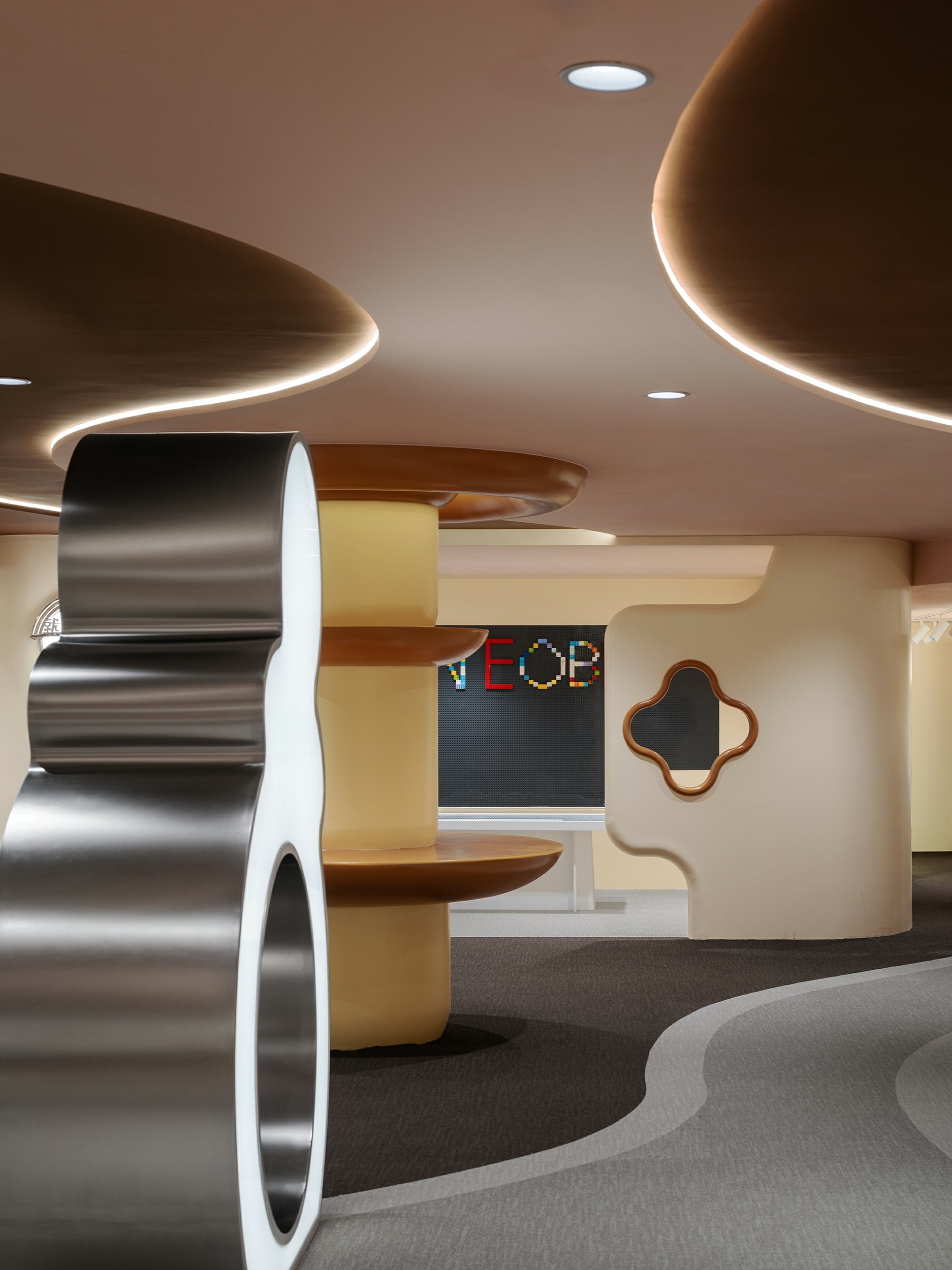 Бионическая форма стойки ресепшен отдаленно напоминает традиционные садовые павильоны, украшающие тщательно спланированные композиции, имитирующие горные или водные пейзажи. Эти павильоны кажутся случайными элементами, но на самом деле благодаря им выстраивается баланс между естественной и искусственной средой. Так же и ресепшен соединяет воедино обычный мир и волшебное пространство центра NEOBIO, куда можно попасть через небольшое «чистилище» – комнату для переобувания в специальную обувь, более удобную и безопасную как для посетителей, так и для игрового оборудования.