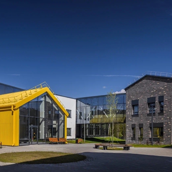 Компактное кирпично-металлическое здание на территории растущего в Выксе «Шухов-парка», кажется, впитывает в себя солнечный свет, преобразует в желтые акценты внутри и вечером «отдает» теплотой золотистого света из окон. Серьезно, очень симпатичное получилось здание: и материальное, и легкое, причем легкость внутри, материальность снаружи. Форма в нем выстроена от функции – лаконично, но не просто. Изучаем.