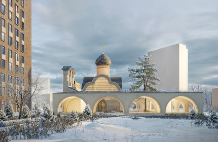 В конкурсном проекте православного храма для жилого комплекса в Москве архитекторы бюро М.А.М предлагают открытую городскую версию «монастыря». Монументальные формы растворяются, превращая одноглавый храм в ажурный светильник, а глухие стены «галереи» – в арки-витрины.