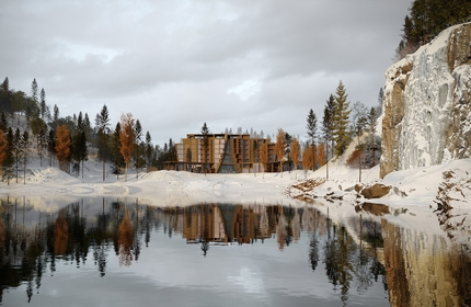 Отель в Карелии, спроектированный архитектурным бюро Chado, вырастает из ландшафта в образе гигантского валуна, расколотого надвое. В центре этой композиции рождается драматичное общественное пространство, напоминающее древнее убежище. Материалом, связывающим рукотворное с природным, становится монолитный бетон, приближенный по оттенку к местным породам.