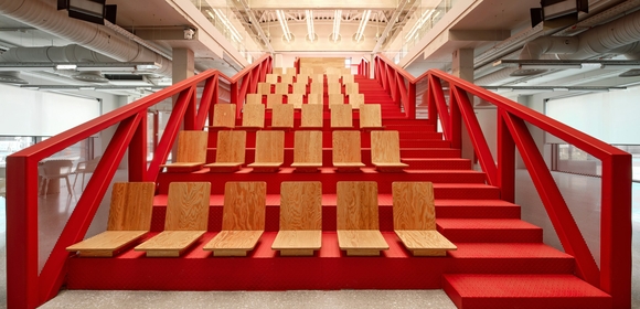 Nefa Architects обустроили образовательный хаб для компании ДКС на территории фабрики «Большевик». Красный амфитеатр в самом центре – рифмуется с биографией места и подает концентрированный сигнал о том, где именно в этом пространстве происходит главное.