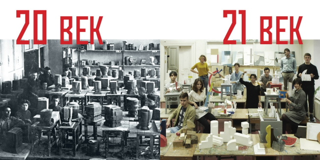 По сравнению с первоначальным замыслом наша выставка была несколько скорректирована. Ее составили две экспозиционные части длиной 12 метров каждая. На одной из них были две фотографии: известный снимок студентов ВХУТЕМАСа с макетами и постановочное фото современных студентов в окружении макетов. Между ними были размещены ответы российских и зарубежных архитекторов на вопрос «Что такое в вашем понимании архитектура будущего?». Среди респондентов были руководитель бюро «Снёхетта» из Осло Хьетиль Торсен, Ким Нильсен из копенгагенского 3XN, немецкий инженер Вернер Зобек, наши архитекторы – Николай Лызлов, Андрей Чернихов, Наринэ Тютчева, Алексей Муратов, Левон Айрапетов и другие. Также там были высказывания молодых – победителей различных конкурсов: NEXT, «Умный дом» и т.д. Текст при этом чередовался с изображениями проектов международного конкурса Archiprix, который совпадал с нашей экспозицией по идеологии: там побеждают интересные, перспективные работы, предлагающие решения актуальных проблем.