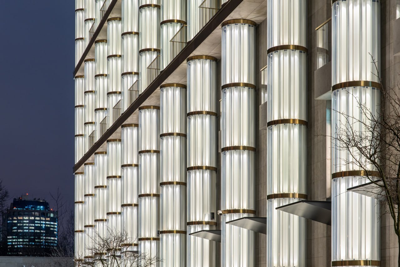 Новый дом на Кутузовском по-своему интерпретирует как классицистический контекст места, так и присущий проспекту премиальный статус. В то же время он смел: таких колонн – стеклянных, светящихся в ночи трубок, в Москве еще не было. Пластические высказывание получилось сильным и бескомпромиссным, буквально на грани между декоративностью «Украины» и хай-теком Сити.