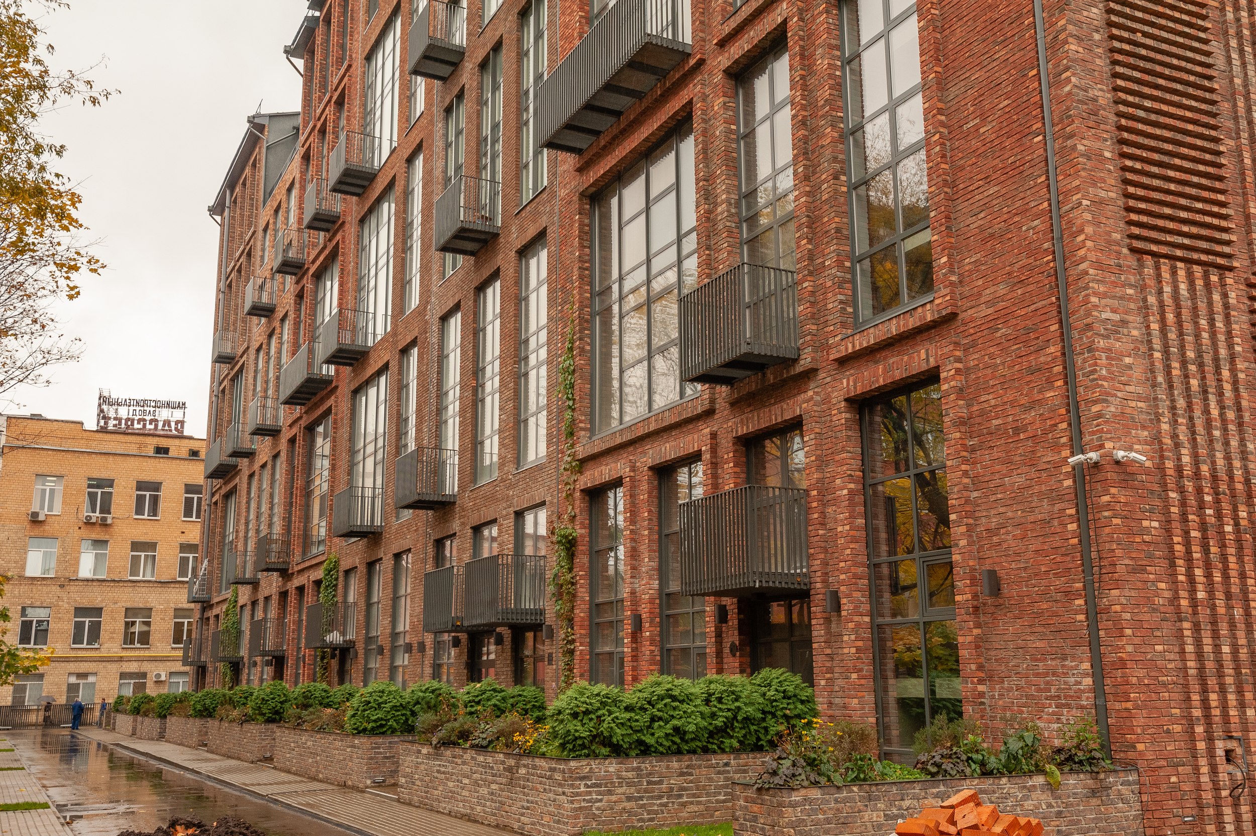 Первый этаж комплекса выполнен с использованием прочных, долговечных и антивандальных материалов, рассчитанных на высокие эксплуатационные нагрузки. В качестве облицовки выбран клинкерный кирпич, отличающийся устойчивостью к механическим воздействиям, снеговым нагрузкам и перепадам температур. Материал стал оптимальным решением для цокольных и первых этажей. При этом архитектурная идея радиальной кладки была сохранена и здесь, что позволило выдержать единую стилистику всего комплекса.