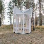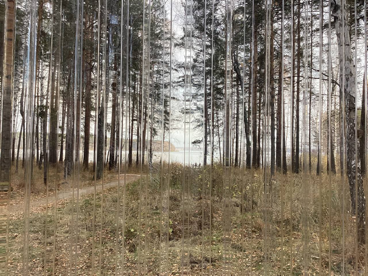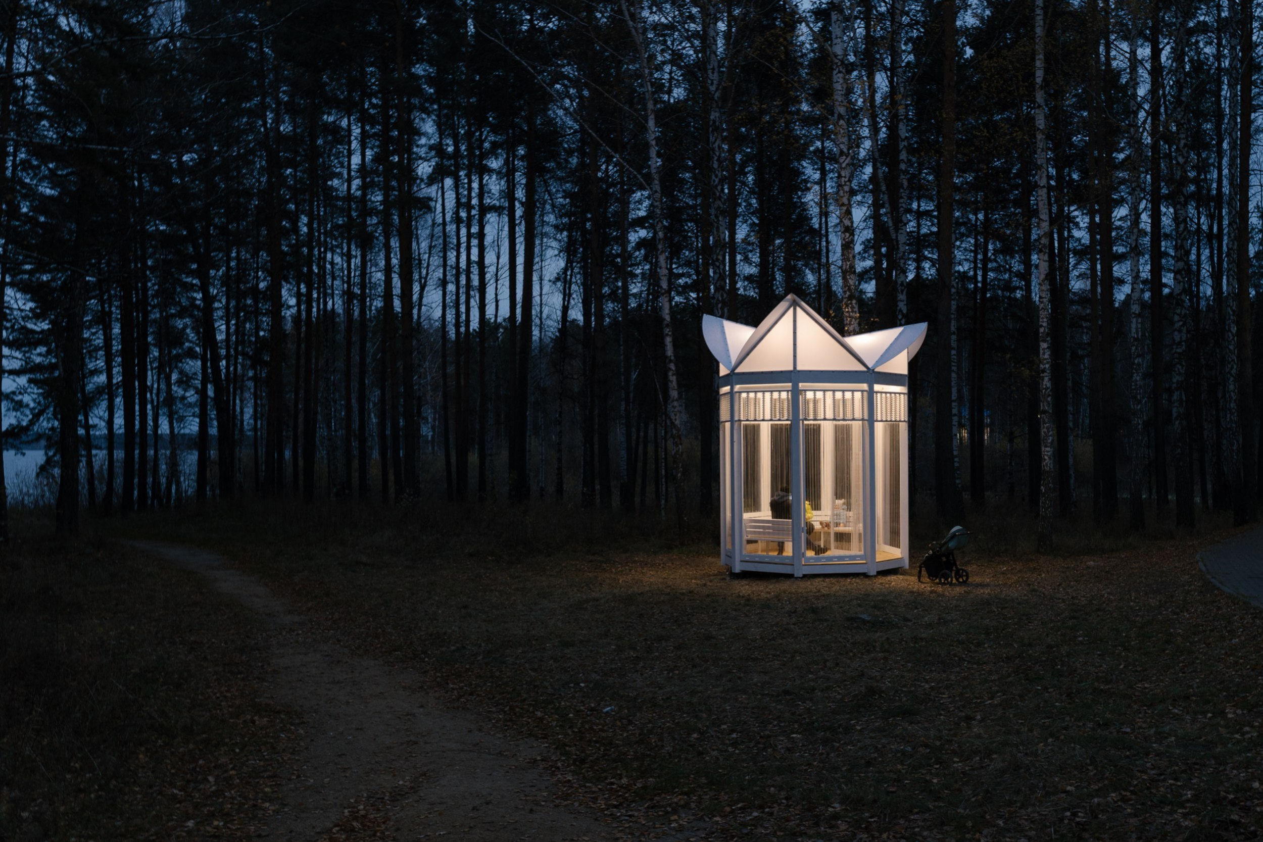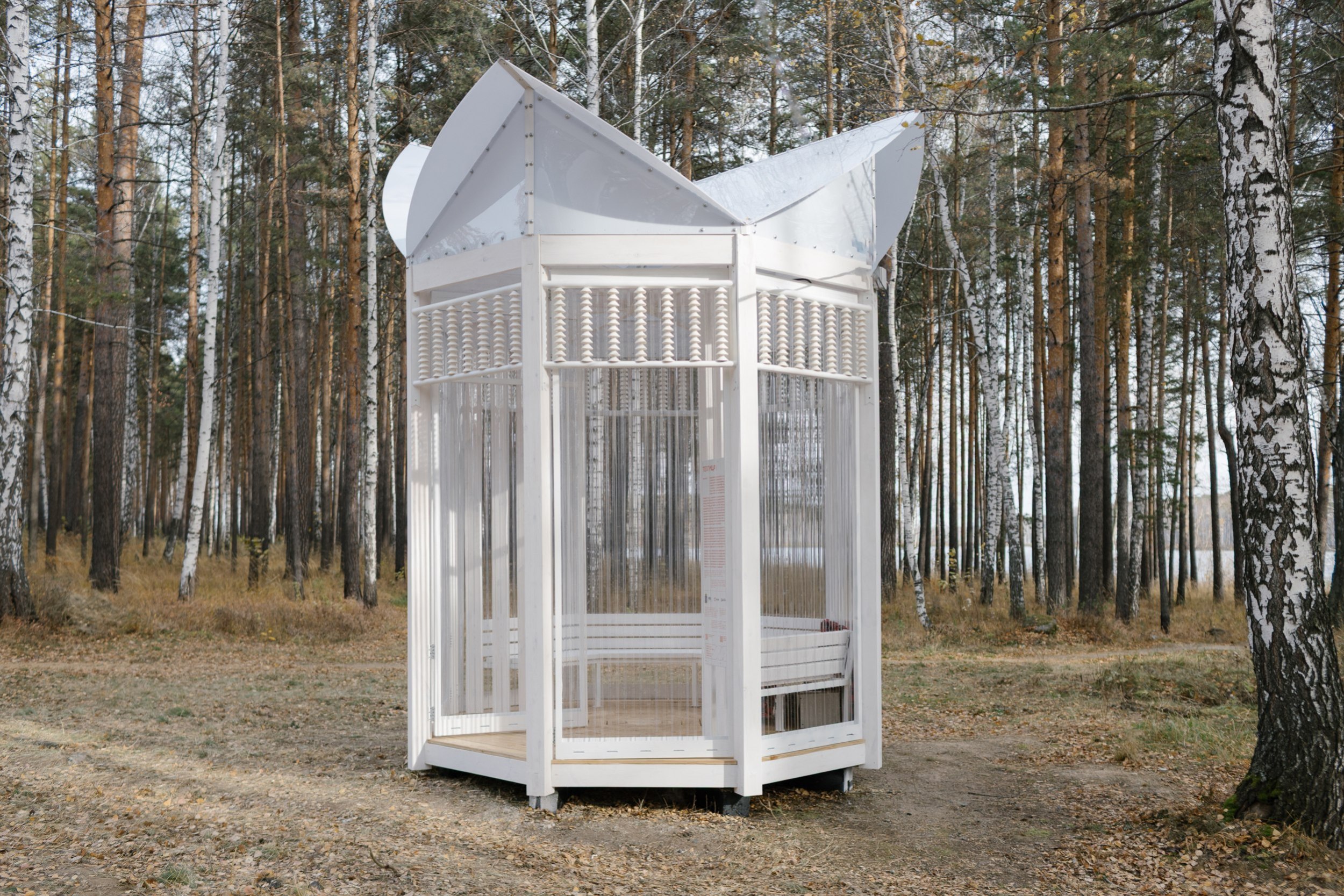 Самой распространенной сферой использования поликарбонатов были и остаются небольшие павильоны и навесы. В них используются сотовый и профилированные листы, из которых делаются кровля и стены легких временных построек. Первый наш пример как раз демонстрирует такой подход, но с важным дополнением: для решения художественных задач авторы выбрали материал, наиболее подходящий для передачи художественного образа – зыбкой границы между внешней, уже поддернутой холодом березовой рощей и внутренним пространством павильона, наполненным светом и теплом воспоминаний местных жителей.