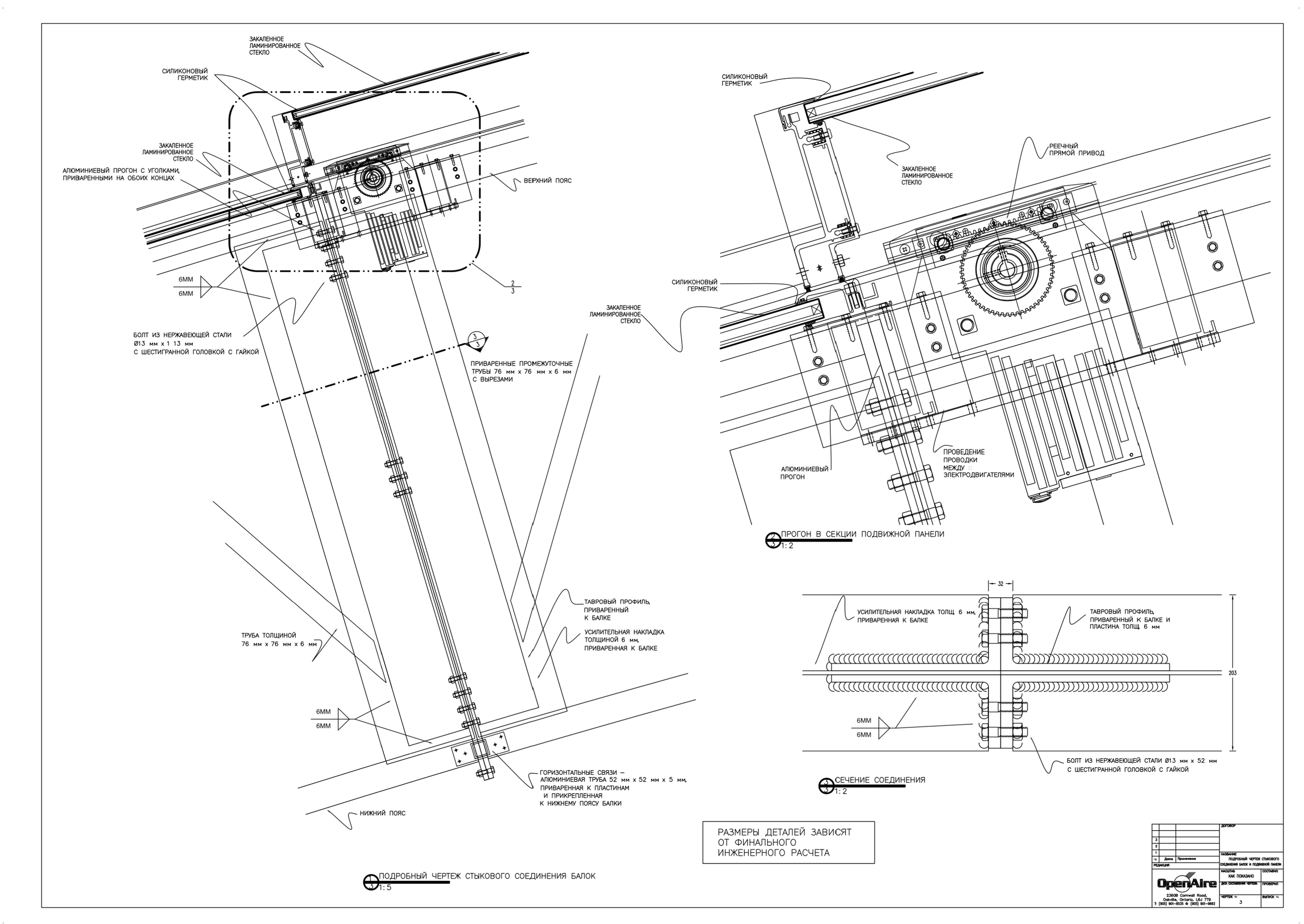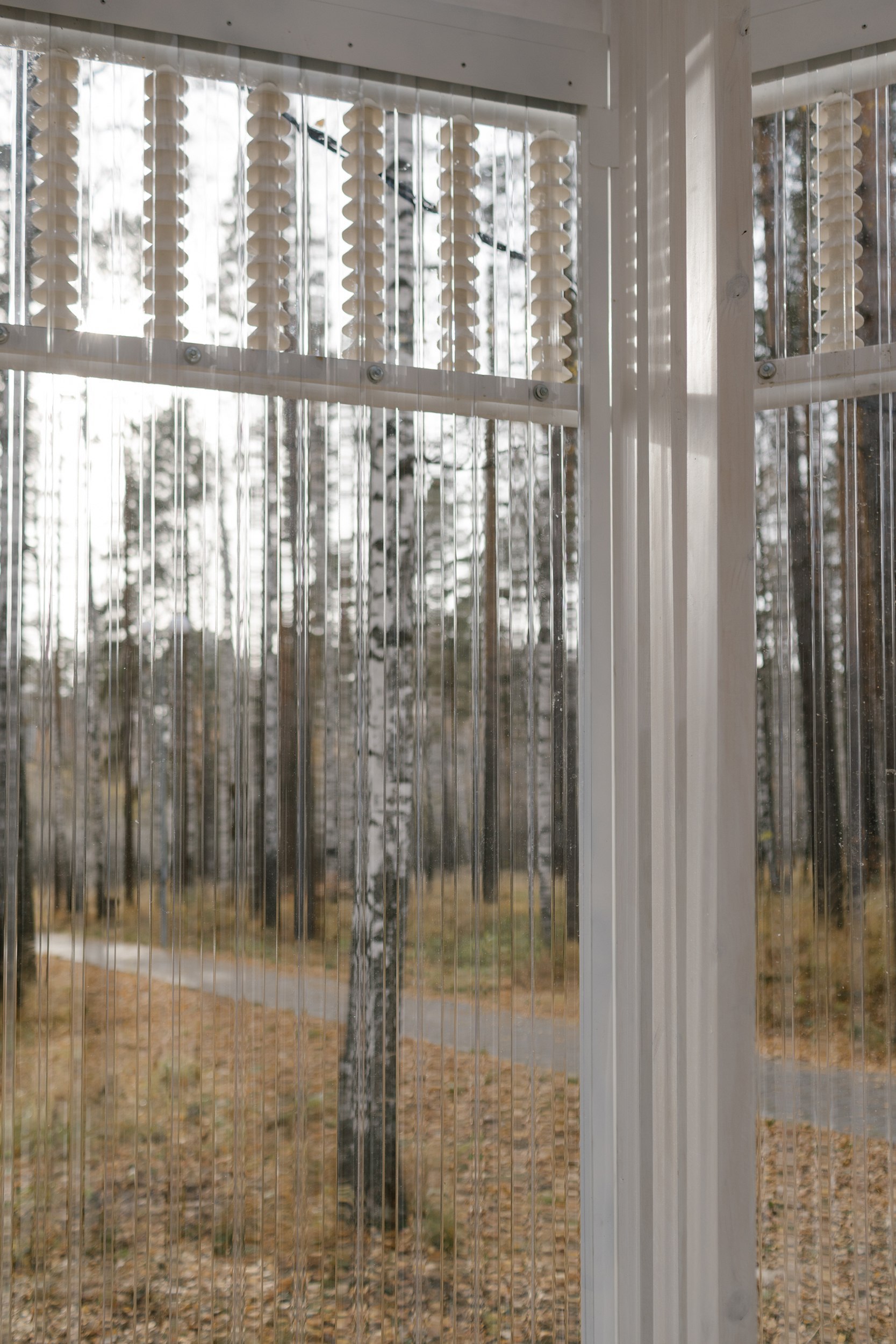 Основная часть конструкций павильона выполнена из деревянного каркаса, а проемы между стойками заполнены экранами из металлических рам с заполнением из прозрачного профилированного поликарбоната, который зажимается в специальных пазах по периметру. Функционально экраны из поликарбоната призваны защитить посетителей павильона от ветра и отчасти от холода, но особенности профилированных листов создали удивительный визуальный эффект – размытие и искажение видов окружающего парка, создающие эффект залитого дождем окна, благодаря которому реальность начинает размываться в переливах, освещенных солнечными лучами, оставляя посетителя наедине со воспоминаниями и мечтами множества людей.