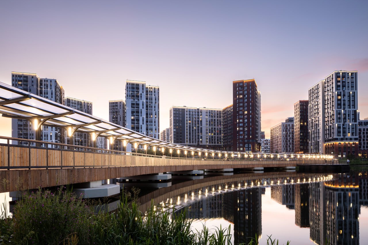 Примером может служить район Прокшино и одноименный жилой комплекс, построенный рядом с Филатовским шоссе на берегу 1-го Николо–Хованского пруда на реке Сосенке. Берег пруда со стороны ЖК превращен в общественное благоустроенное пространство и получил название «набережная Афанасия Фета», а сам пруд стал называться «Дальний». Основным общественным транспортом для жителей комплекса служит Сокольническая ветка московского метрополитена, открытая в 2019 году. Между ЖК и станцией всего 500 метров по прямой через пруд, но до недавнего времени людям приходилось обходить водную преграду и ходить мимо оживленной магистрали.