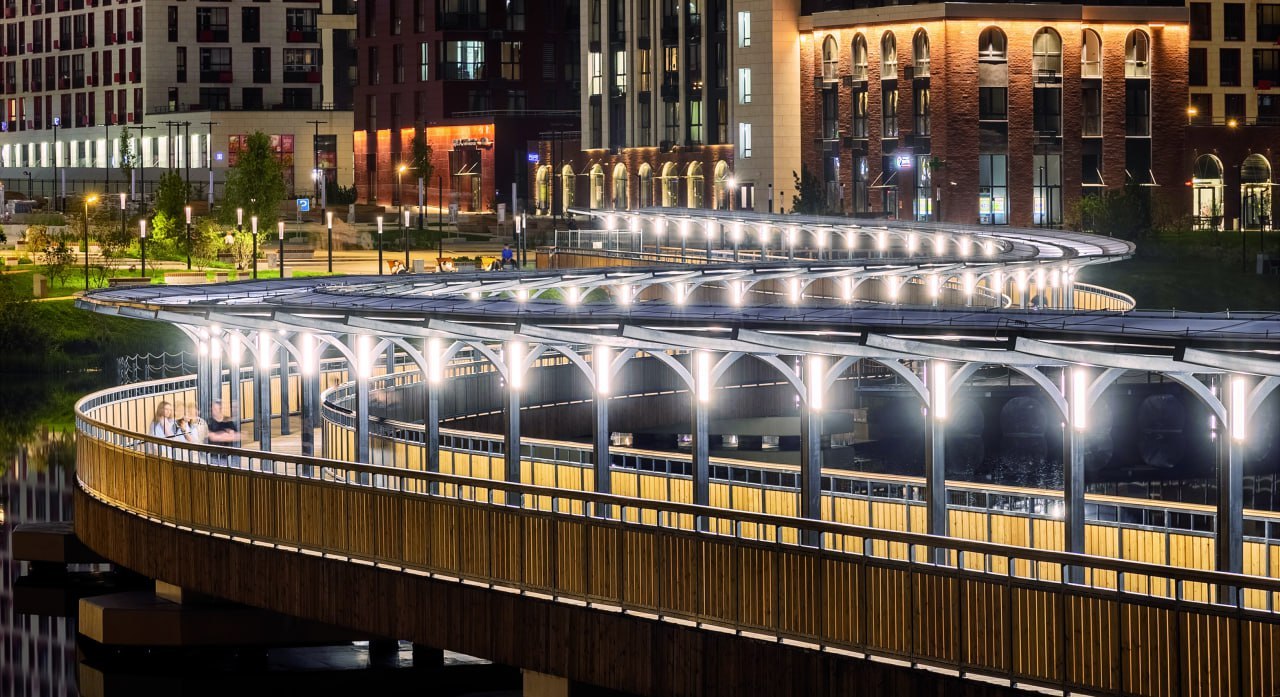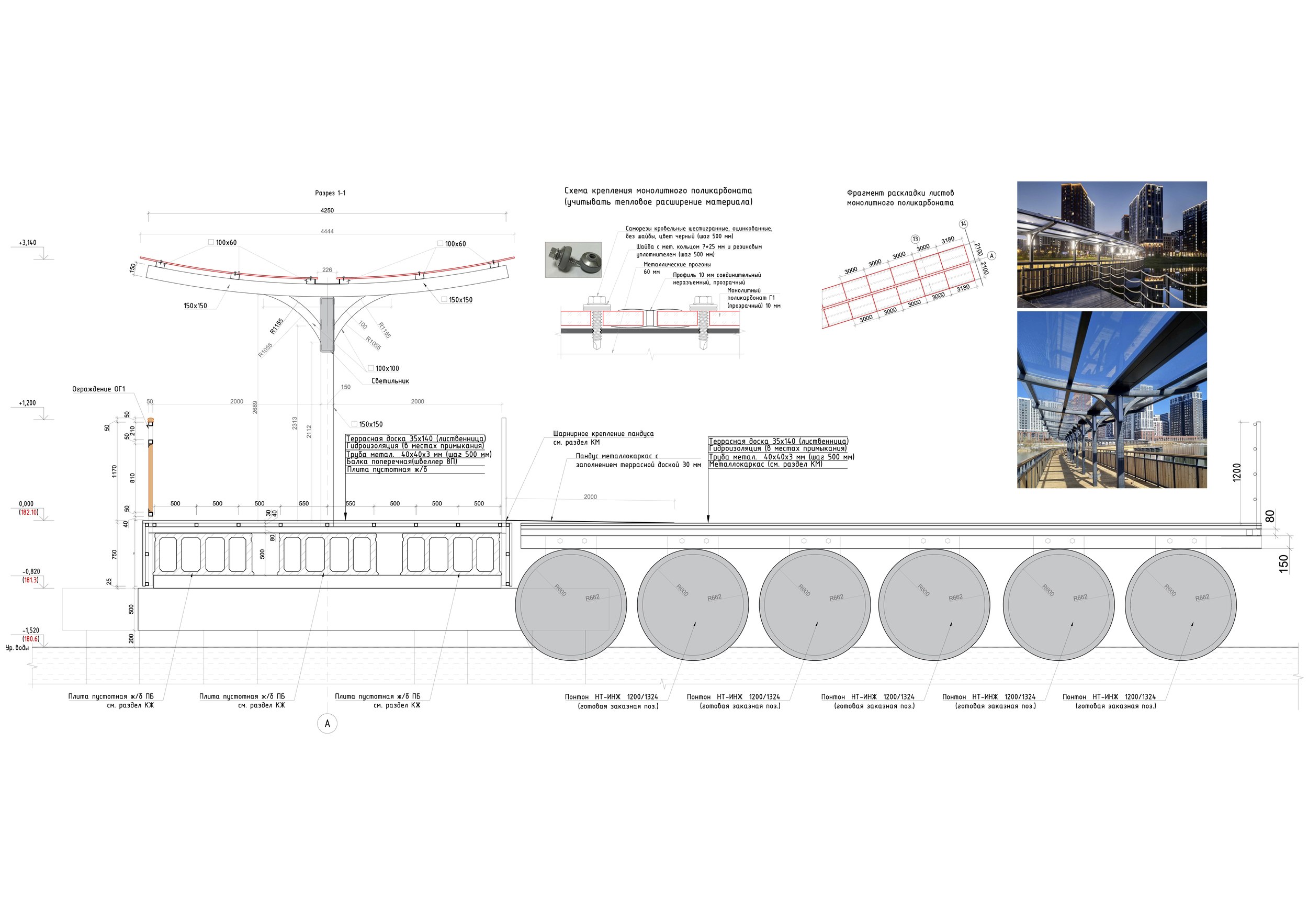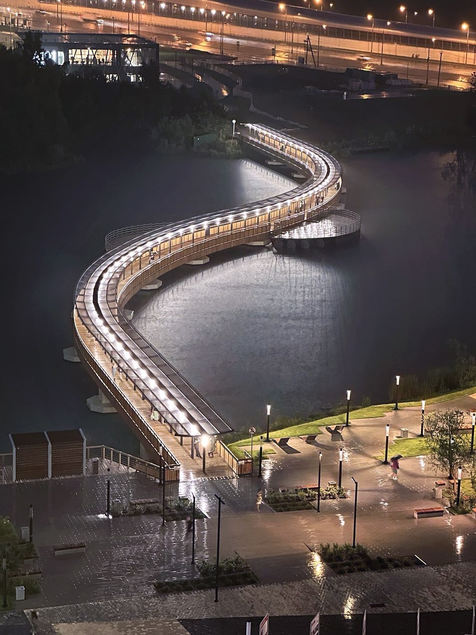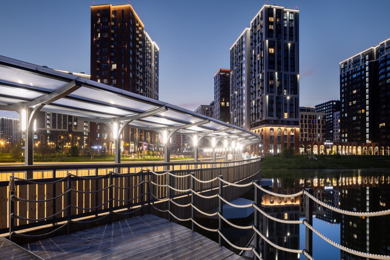 Благодаря комбинации моста и навеса из прозрачного поликарбоната удалось реализовать принцип «сухие ноги», который применяется в московском строительстве при организации пересадок и логистических связей в общественном транспорте. Выбор прозрачного монолитного поликарбоната позволил визуально облегчить всю конструкцию и осветить естественным светом пространство пешеходного променада. Дематериализация кровли сместила акцент на металлические колонны и изогнутые элементы, сделав всю структуру более динамичной и эффектной. Это позволило сохранить визуальную связь с акваторией пруда и открытым небом, что критически важно для рекреационного объекта, избежав эффекта «тоннеля». В ночное время за счет электрической подсветки поликарбонат обретает большую материальность. Он как бы вбирает в себя электрический свет и за счет эффекта рассеивания равномерно распределяет его вдоль моста, делая его более привлекательным и безопасным.