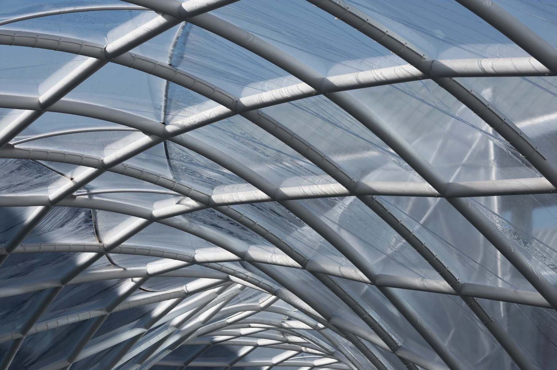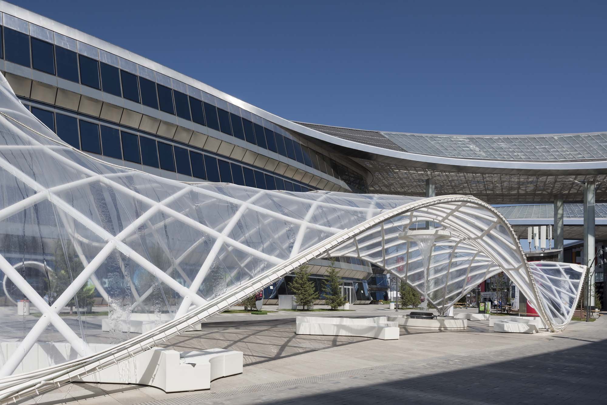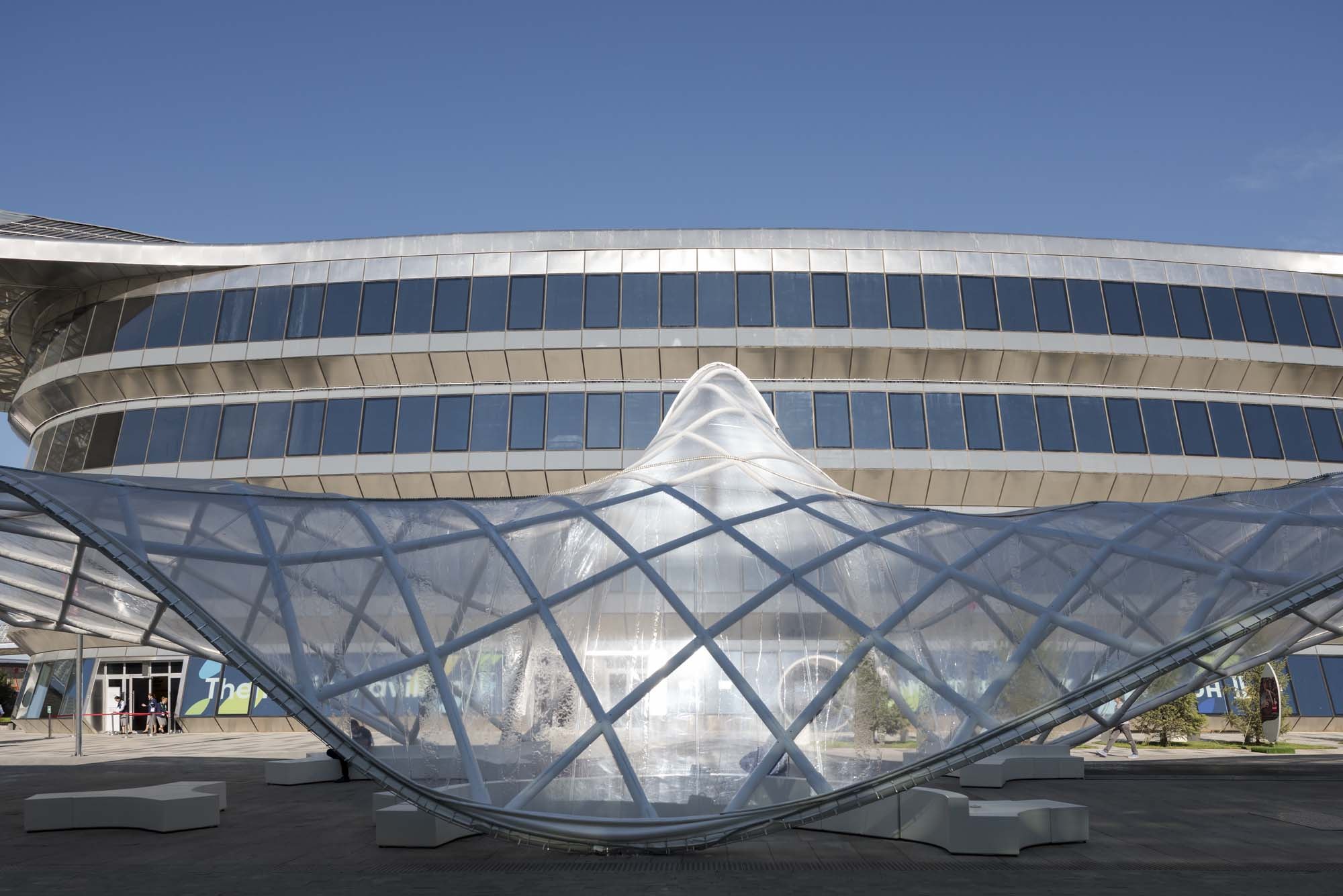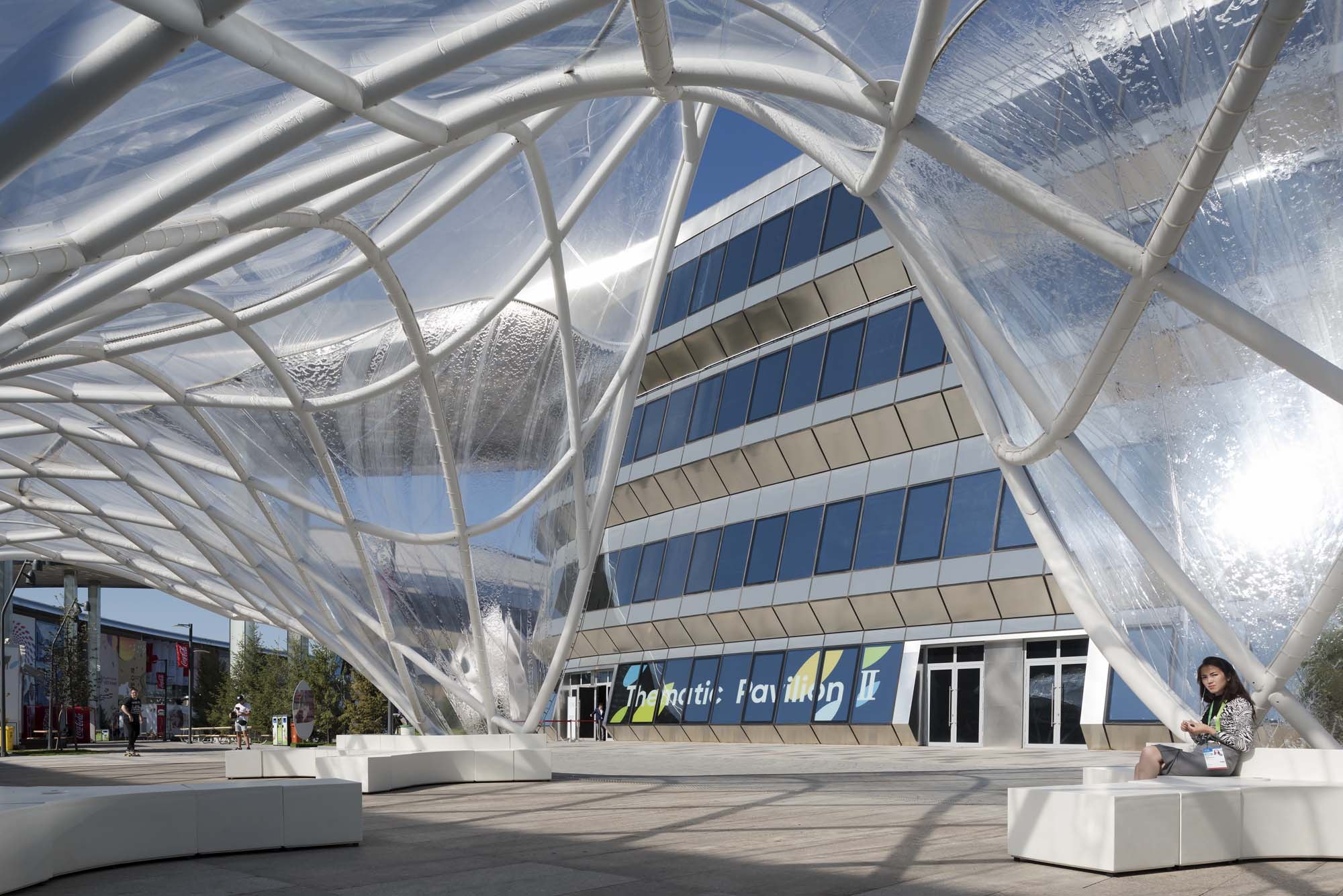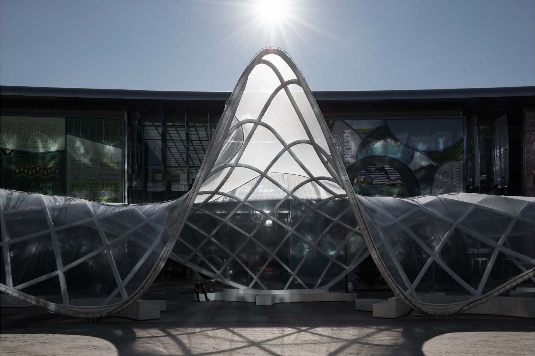 Принцип, положенный в основу архитектурных решений всех трех павильонов, одинаков: из стальных изогнутых конструкций собирается волнообразная бионическая форма, покрытая тремя видами оболочек. В павильоне «Солнце» оболочка выполнена из панелей, меняющих свое положение в зависимости от положения солнца. Кроме того, в нее были встроены солнечные батареи. В «Ветре» оболочка выполнена из подвижных элементов, которые колышутся, когда движется воздух. В павильоне «Вода», самом большом по высоте (6.8 м), на металлический каркас была установлена оболочка из гнутых поликарбонатных листов, по которым текла вода, закачиваемая наверх при помощи специальных насосов. Благодаря текущей воде внутри павильона было намного прохладнее, чем снаружи. Для оболочки использовался прозрачный монолитный поликарбонат, но текущая вода не только остужала его, но и рассеивала солнечные лучи, создавая внутри павильона приятную полутень.
