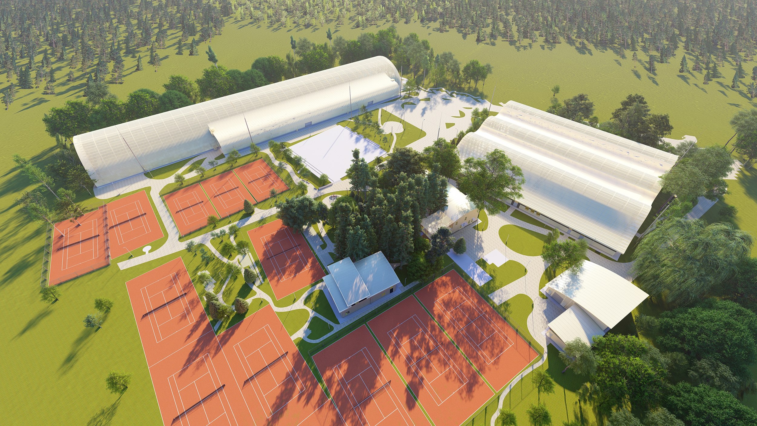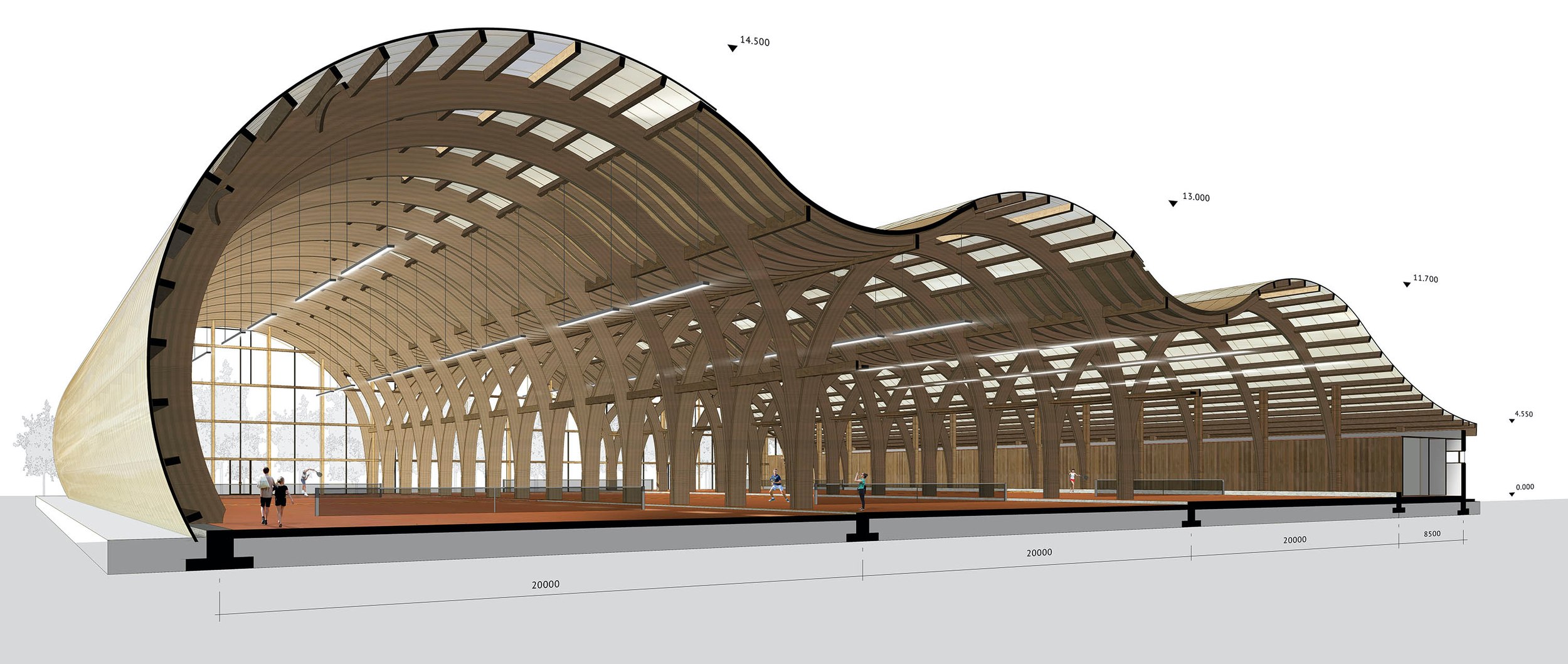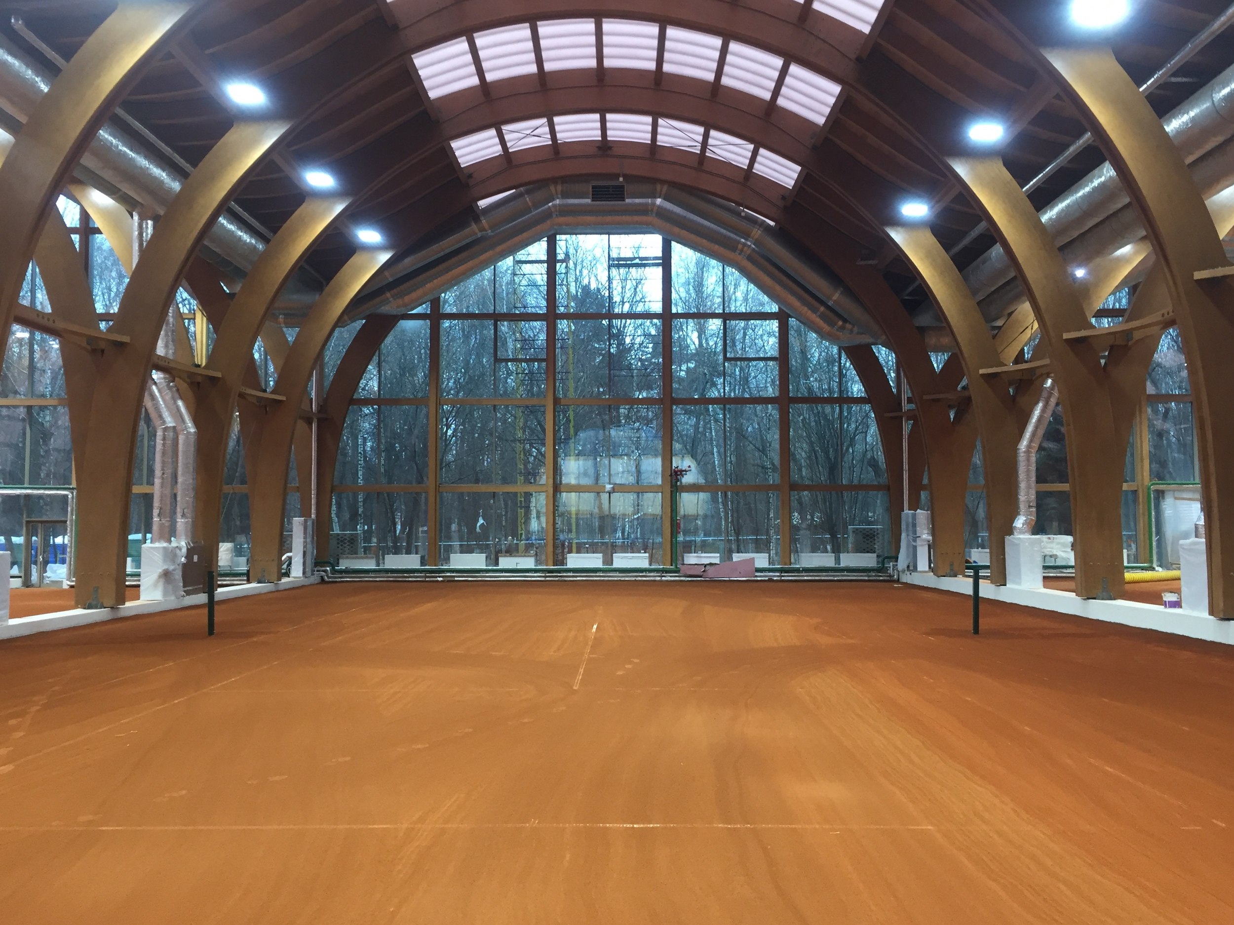 Был разработан проект, отвечающий всем требованиям. Запроектированы 2 павильона, вмещающие 6 теннисных кортов с искусственным покрытием типа «Теннисит» и 10 теннисных кортов с искусственным жестким покрытием. В качестве несущих были использованы арочные деревоклееные конструкции, при соединении образующие волнообразную форму, органично вписывающуюся в парковый пейзаж и скрадывающую внушительные размеры сооружений.