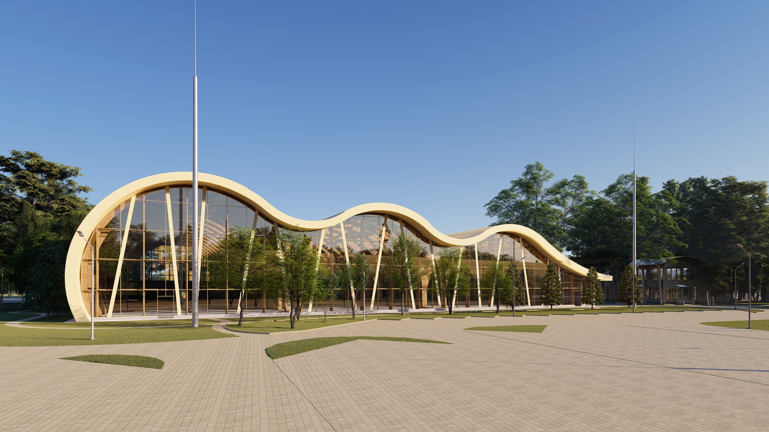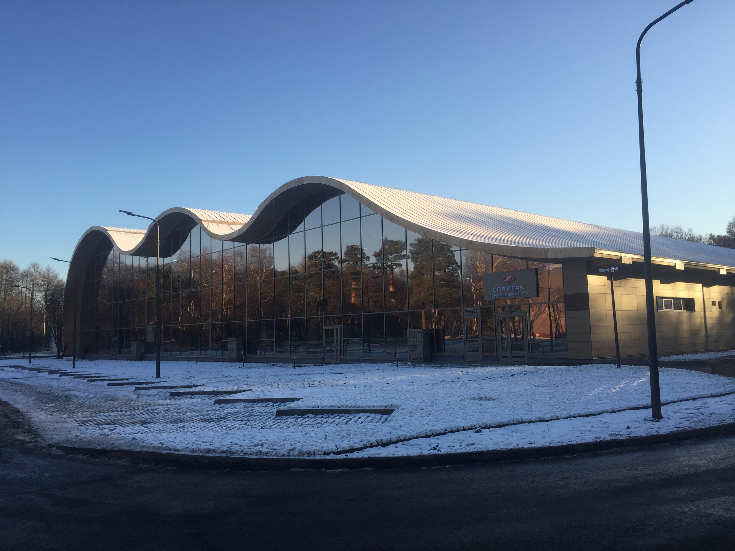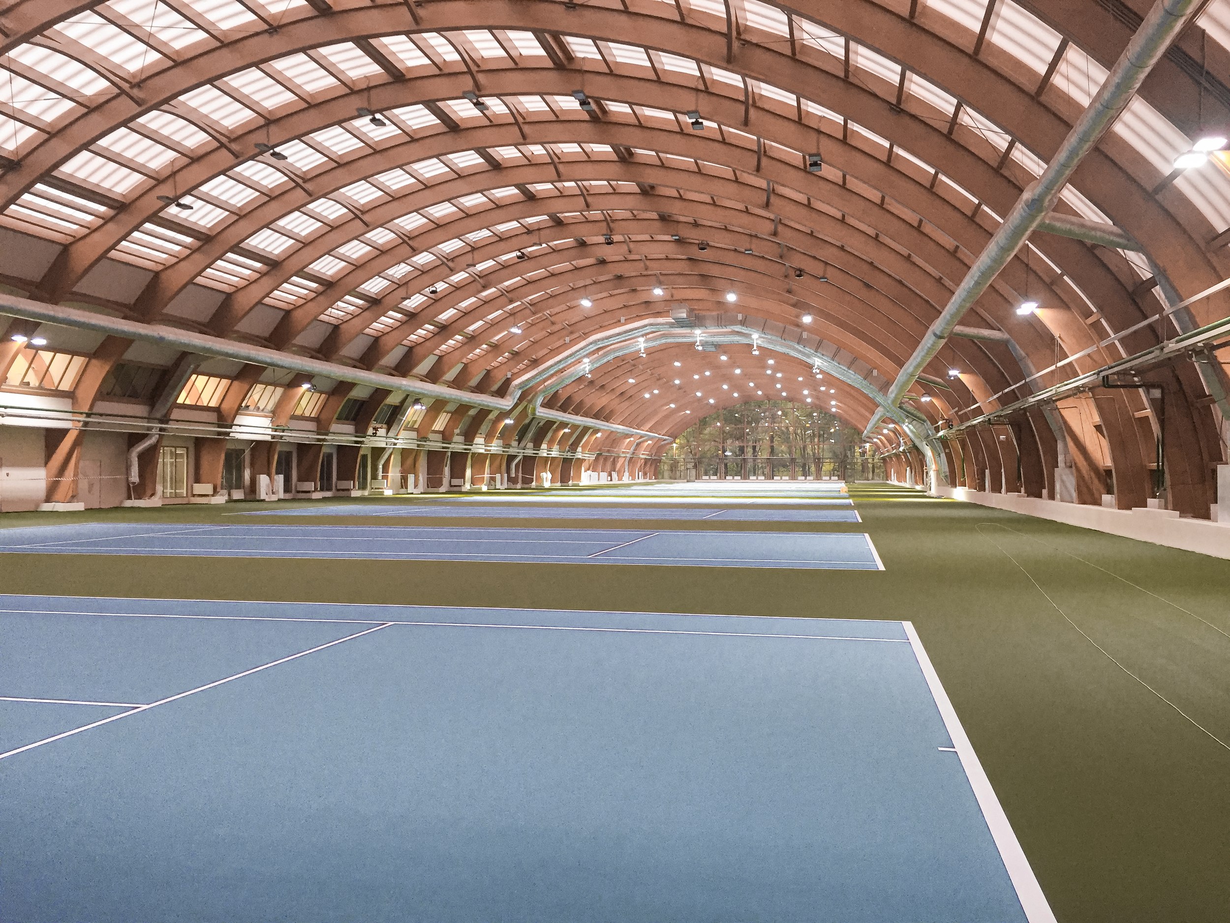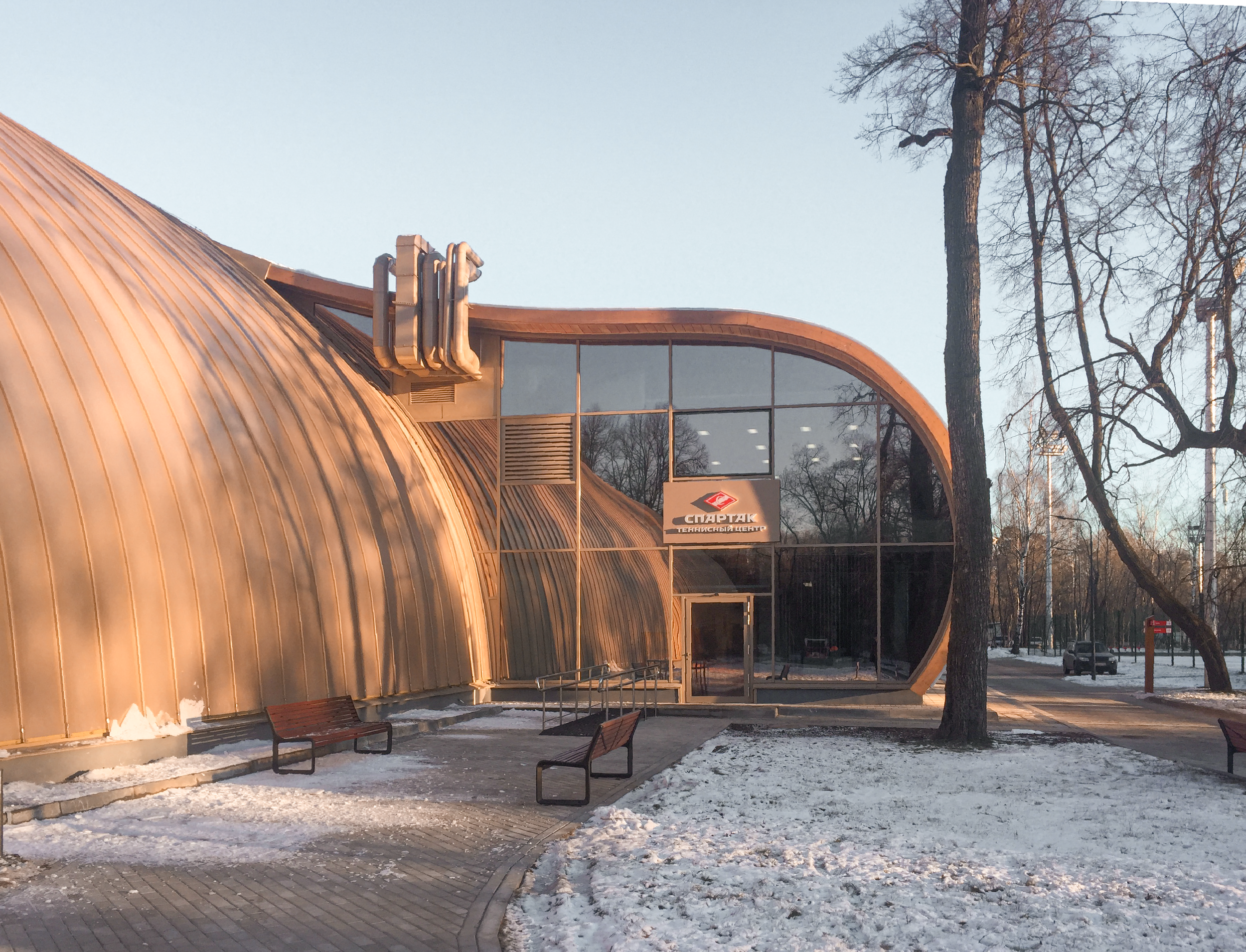 Был разработан проект, отвечающий всем требованиям. Запроектированы 2 павильона, вмещающие 6 теннисных кортов с искусственным покрытием типа «Теннисит» и 10 теннисных кортов с искусственным жестким покрытием. В качестве несущих были использованы арочные деревоклееные конструкции, при соединении образующие волнообразную форму, органично вписывающуюся в парковый пейзаж и скрадывающую внушительные размеры сооружений.
