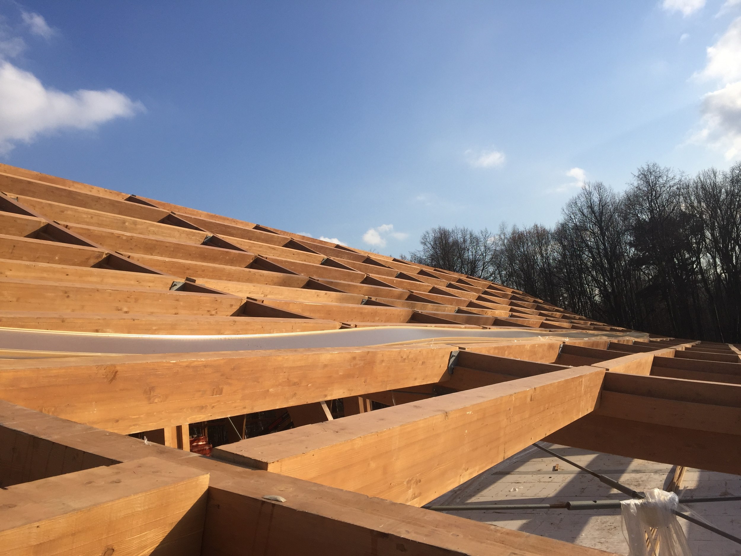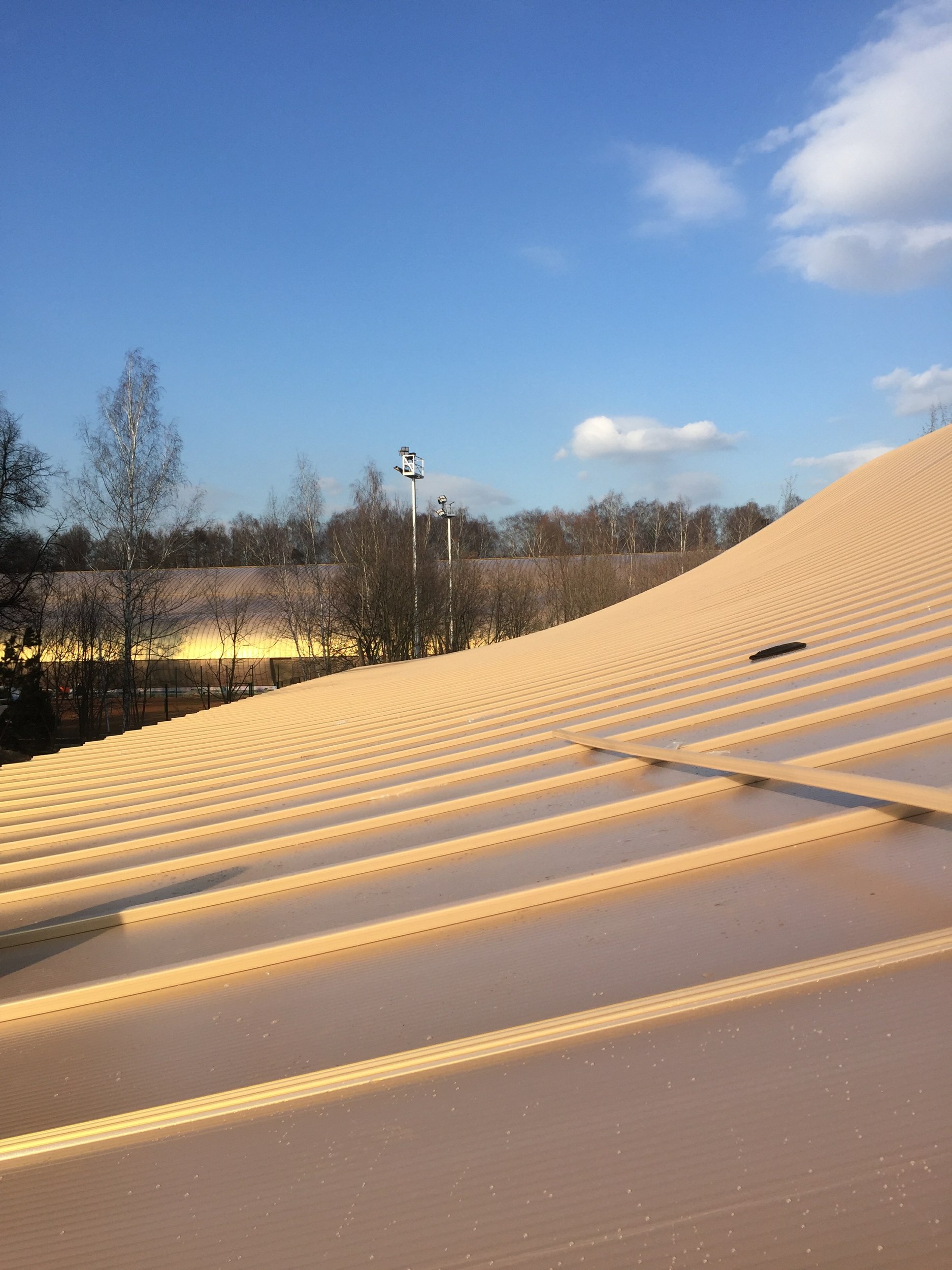 В качестве покрытия для сложной по форме кровли были применены панели из тонированного в теплый цвет древесины ячеистого поликарбоната (цвет производителя «Сафпласт» – аналог цвета по RAL 1014 / RAL 9010 с учетом прозрачности материала – коэффициент светопропускания – 38%), благодаря своей легкости минимизировавшие нагрузку на деревянные конструкции и при этом выдерживающие снеговую нагрузку. Кроме того, благодаря поликарбонату, который пропускает достаточное количество рассеянного солнечного света, в светлое время дня крытые корты почти не нуждаются в электрическом освещении.