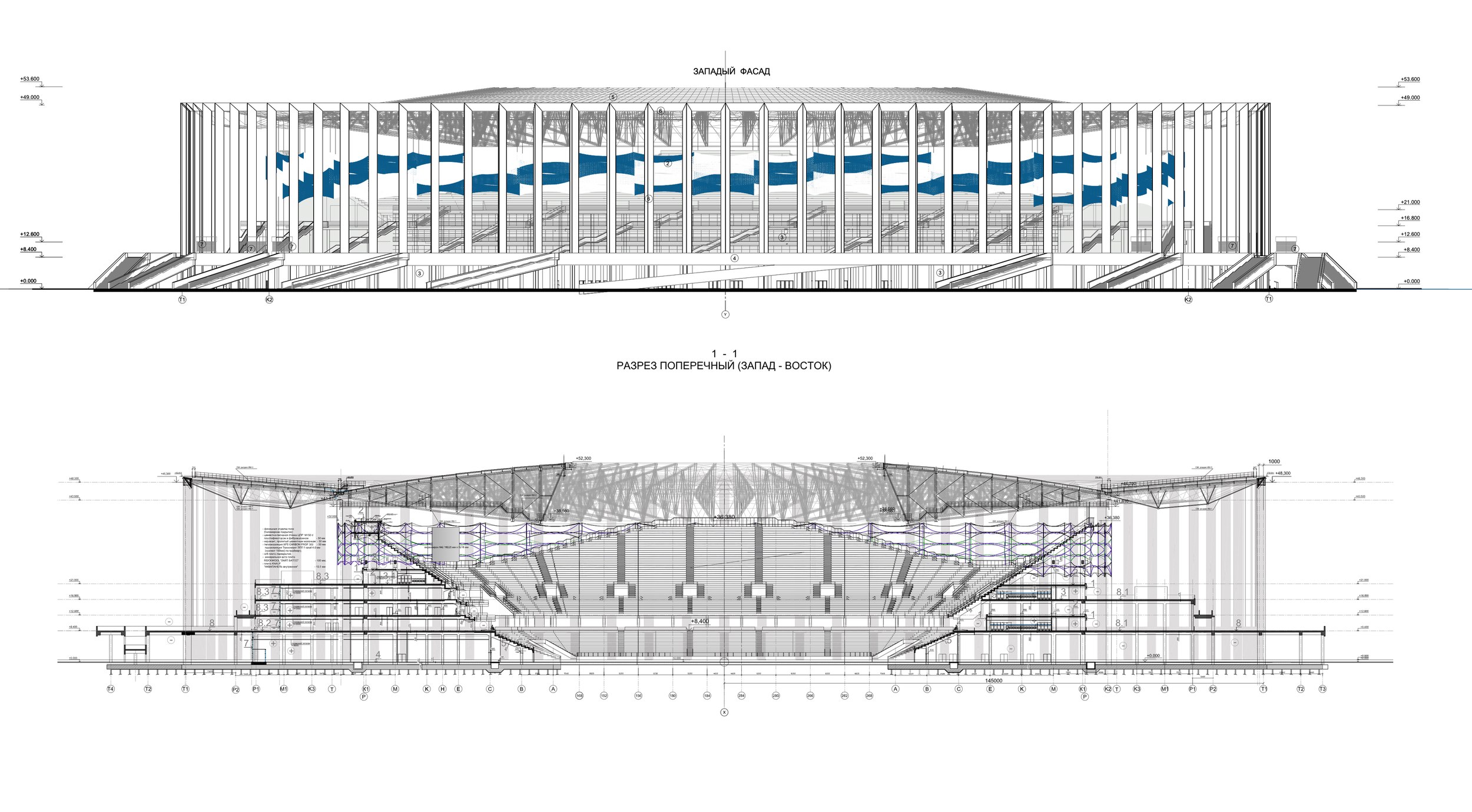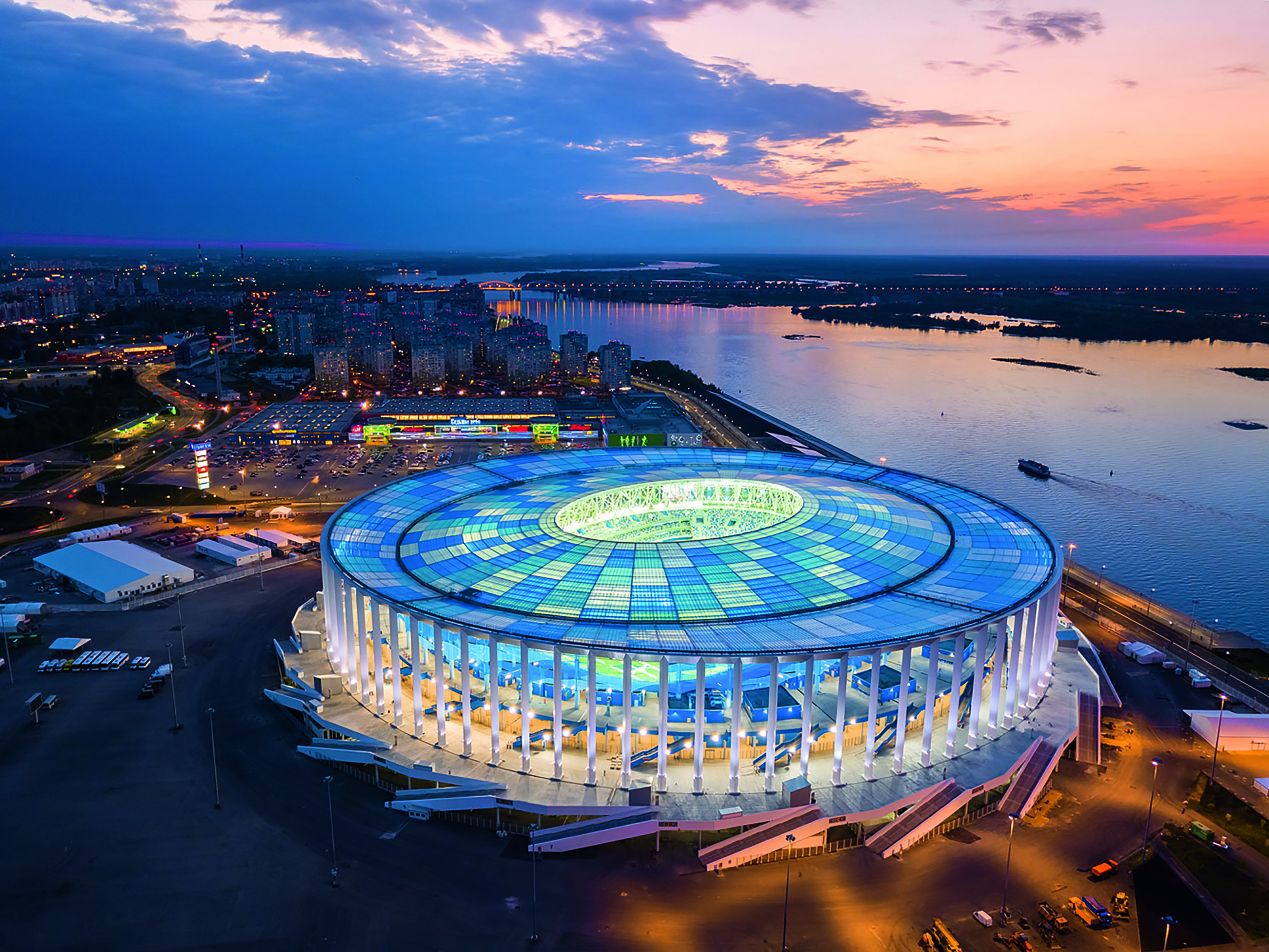 В Нижнем Новгороде стадион вместимостью 45 000 зрительских мест был построен на Стрелке, в месте слияния рек Волги и Оки. Эта территория хорошо просматривается с высокого берега, на котором расположена историческая часть города. Поэтому стадион, помимо своей непосредственной функции, выполняет еще и роль градостроительного акцента.