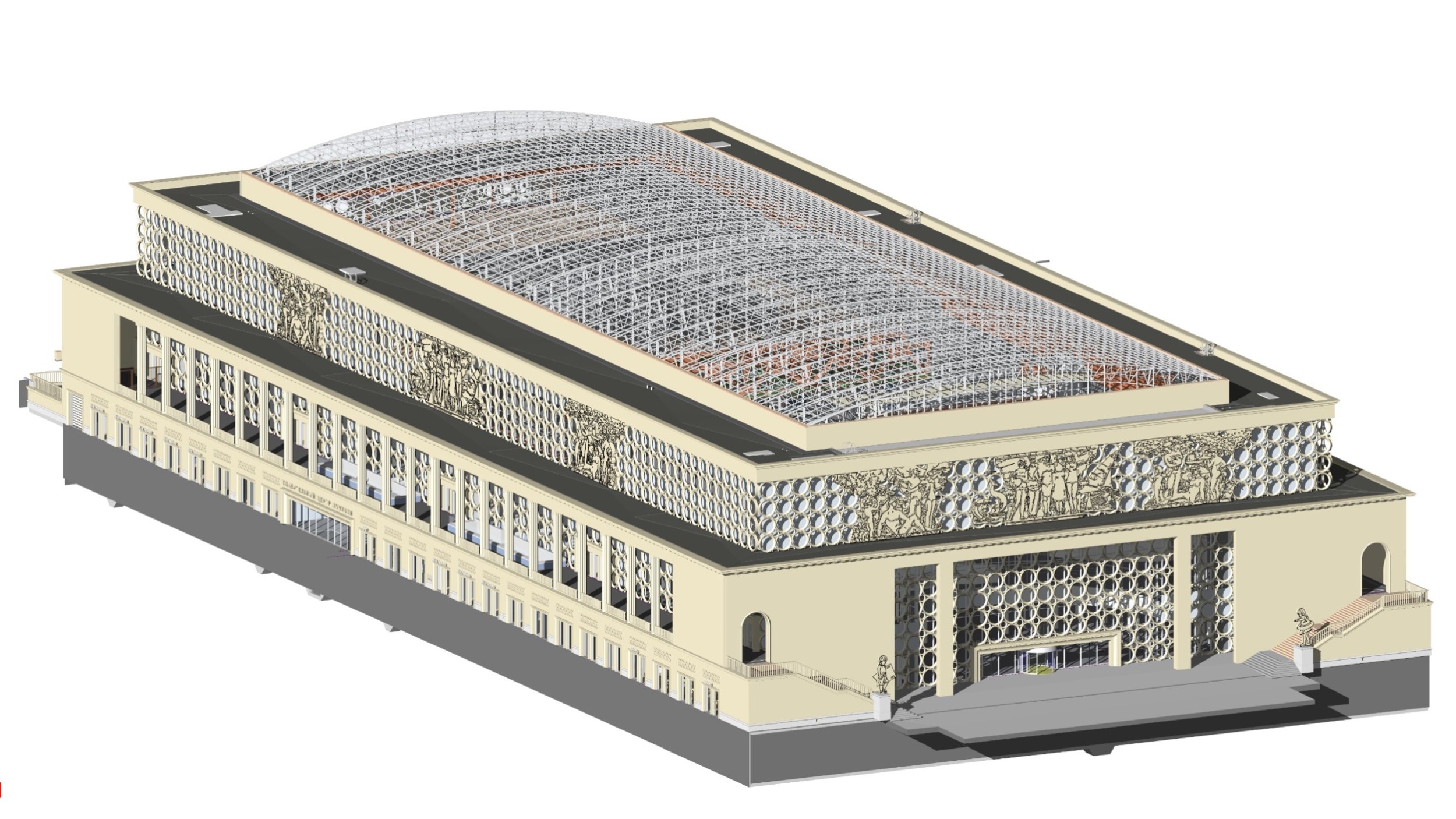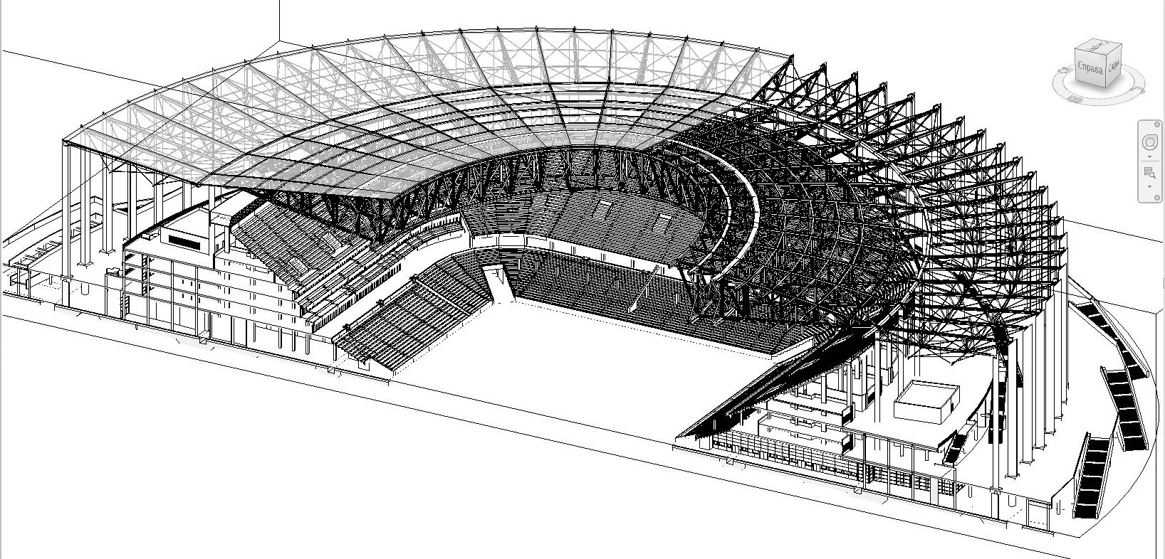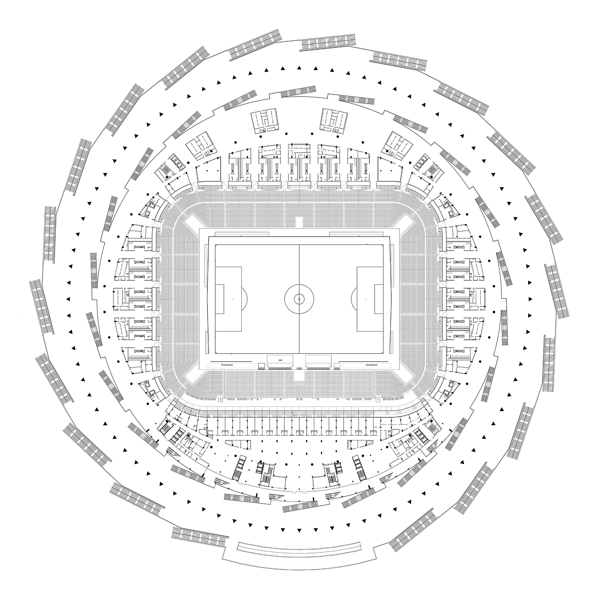 Авторы проекта разработали оптимальную конфигурацию круглого в плане здания диаметром 290 м, окруженного по периметру стройными трехгранными опорами. Внутри здания установлен еще один круговой ряд колонн, который вместе с внешним рядом используется как опора для сложной пространственной структуры из 44 радиальных треугольных плоских ферм и растяжек, поддерживающих двухчастное покрытие – над зрительскими фойе и трибунами.