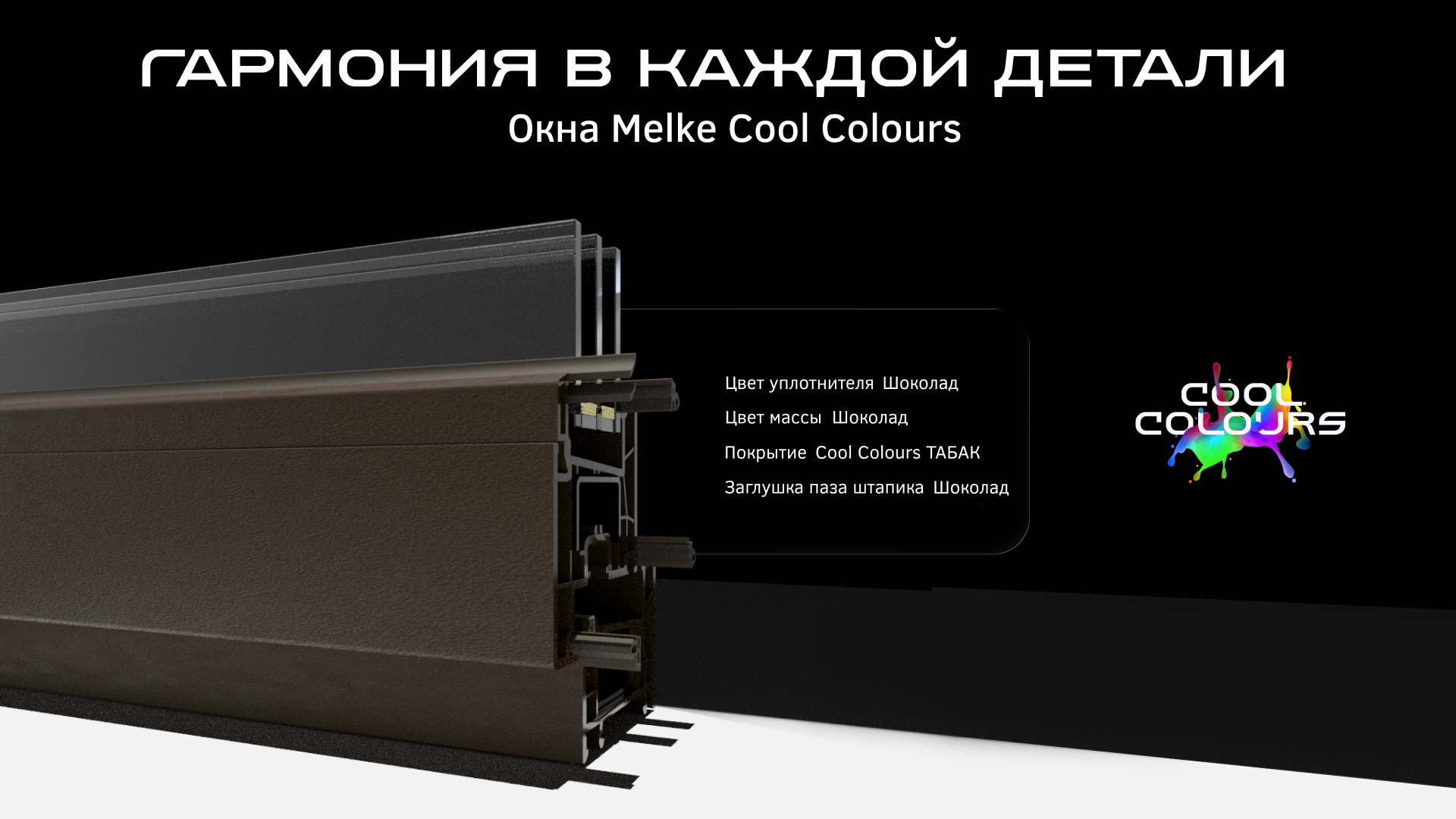 Этот принцип реализован в системах Melke Smart Ultra 65 и Melke Evolution в покрытии Cool Colours. Профиль, штапики, уплотнители и заглушки изготавливаются в едином цветовом решении. Например, при выборе цвета Табак масса профиля имеет оттенок «шоколад», уплотнители и заглушки выполняются в том же тоне. На сегодняшний Melke Cool Colours доступно в 4 трендовых цветах – Сангрия, Табак, Графит, Onix.